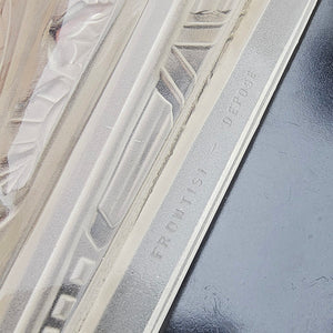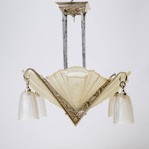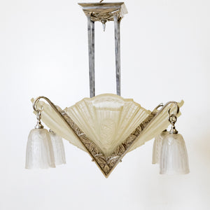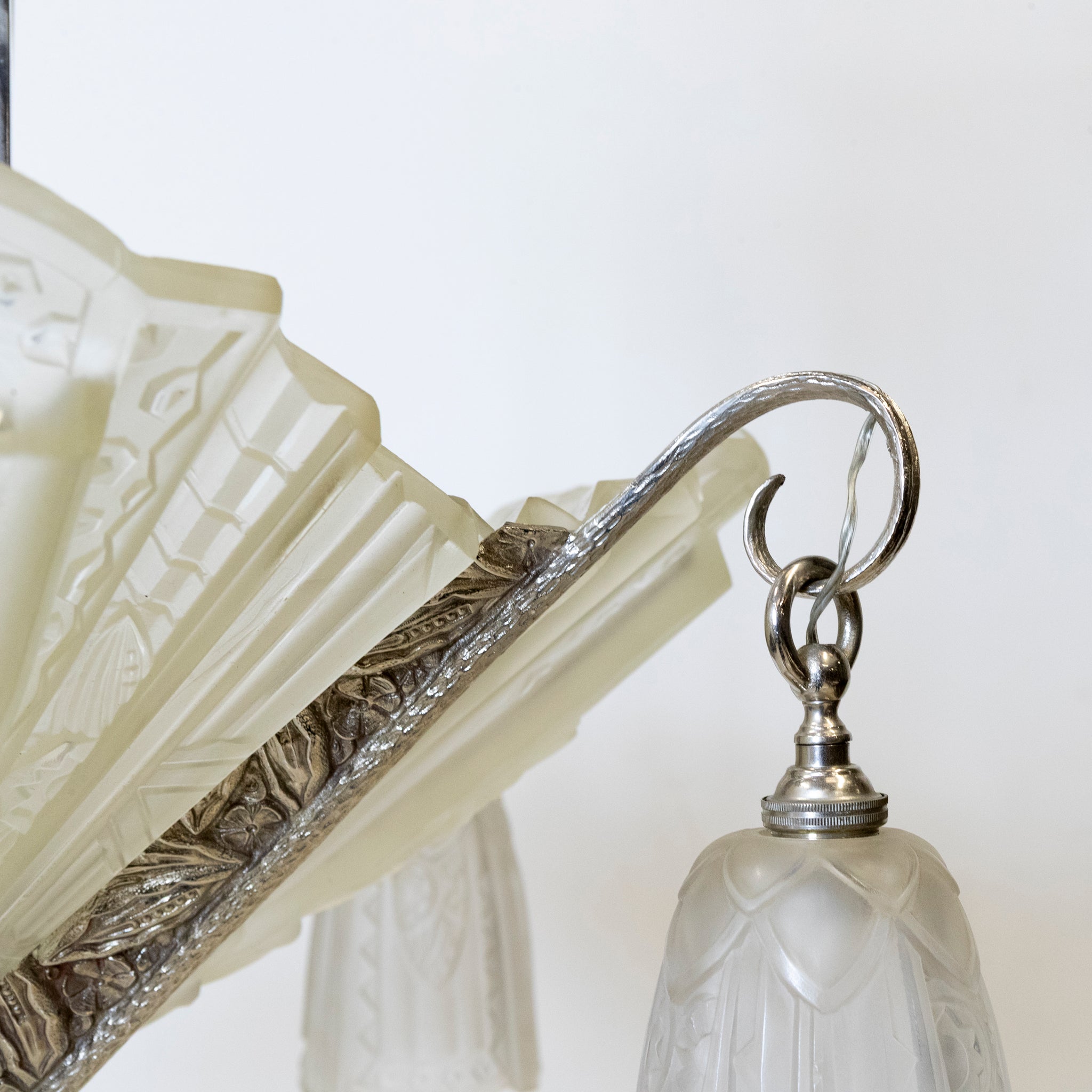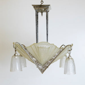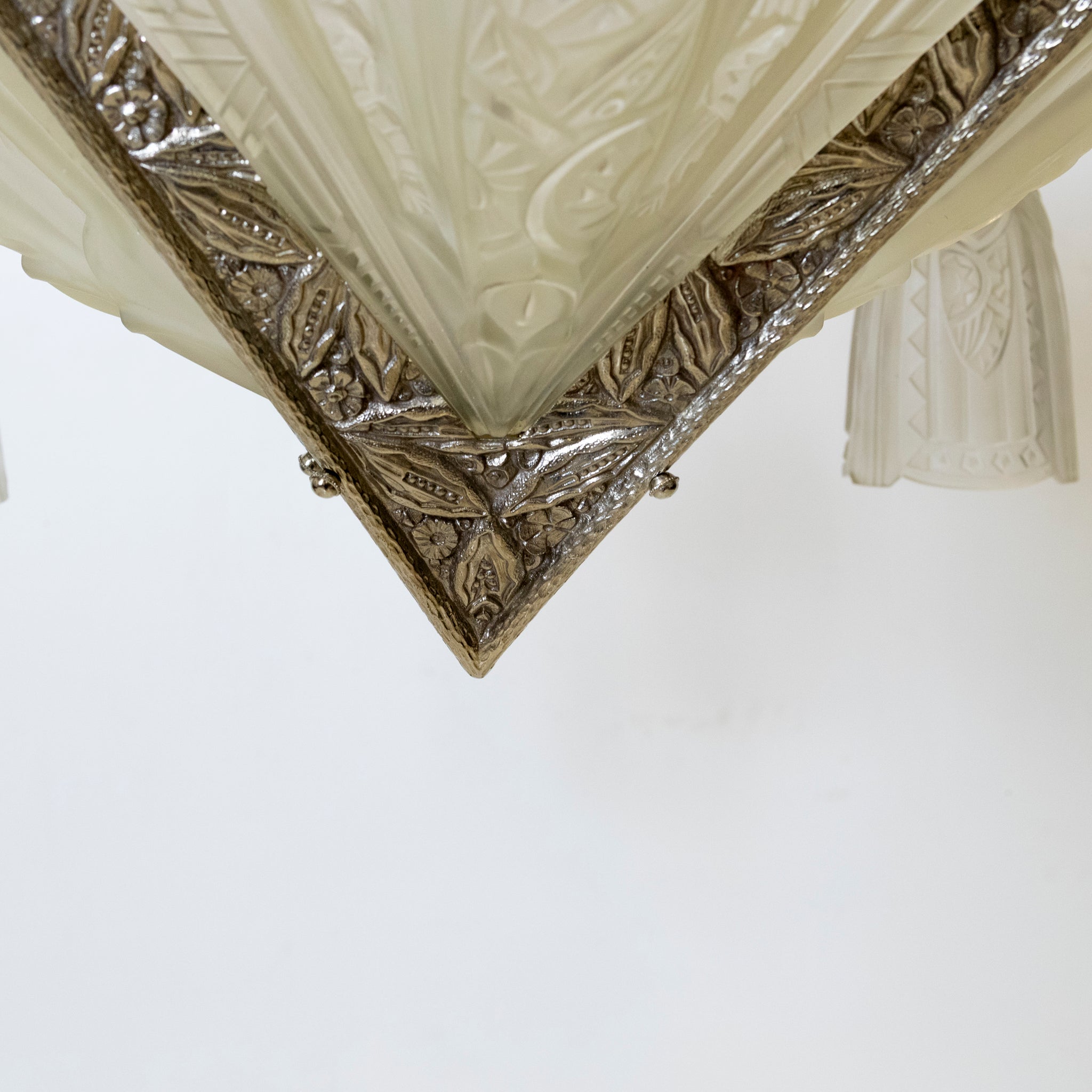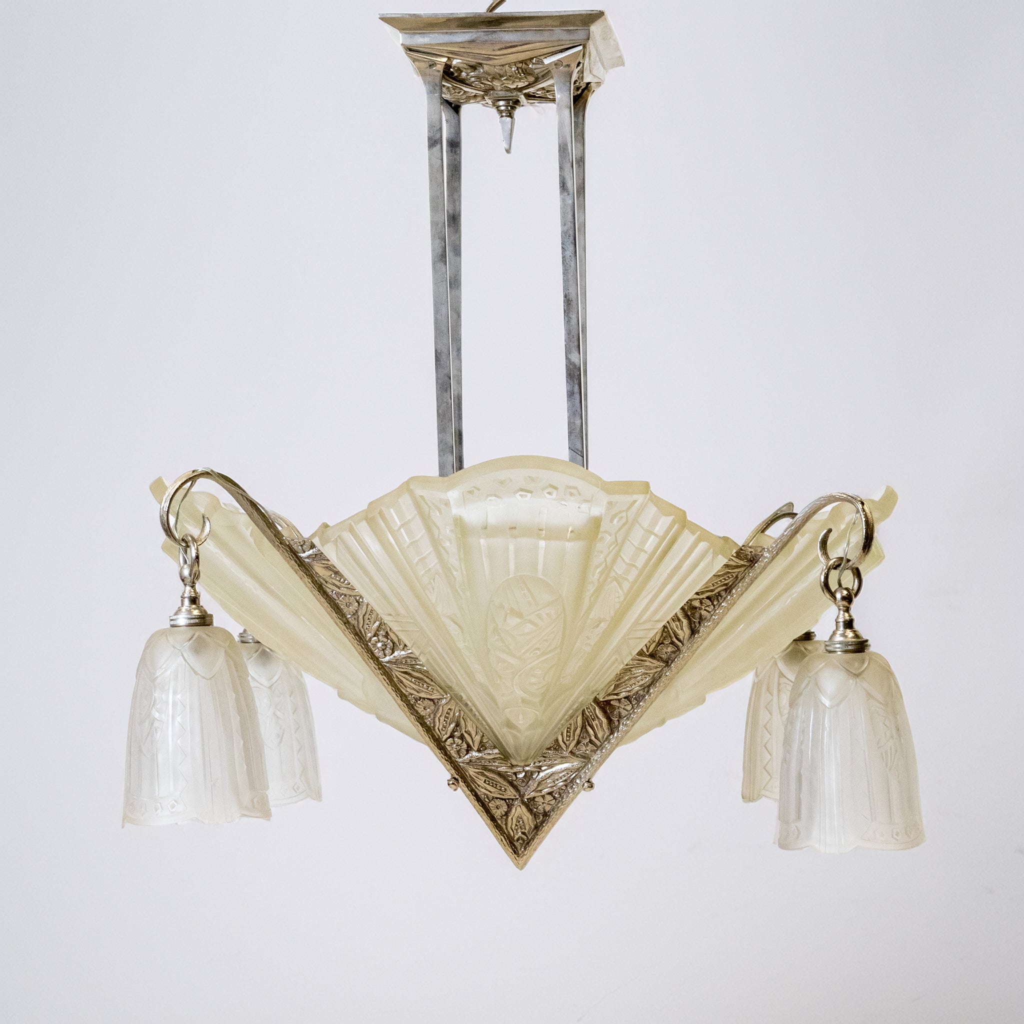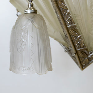 Striking four-sided central bowl in frosted, moulded glass with fan and geometric reliefs, paired with four matching bell satellite shades. The crisp nickel-plated frame shows ornate detailing. The piece suspends from 4 posts attached to the square ceiling rose with a central downward needle that echoes the shape of the light.