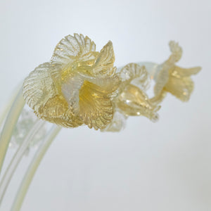 Rising from the central column, sprays of hand-formed blossoms and leaves create a dramatic vertical flourish, balancing the elegant arms below. Subtle accents of gold leaf infused within the glass enrich the composition, catching the light with a warm, luminous glow.