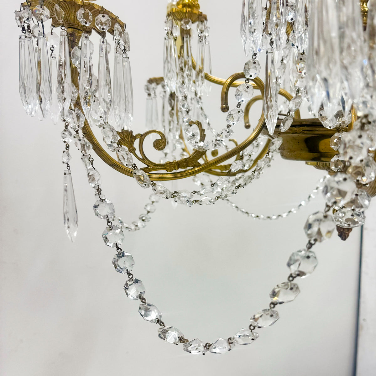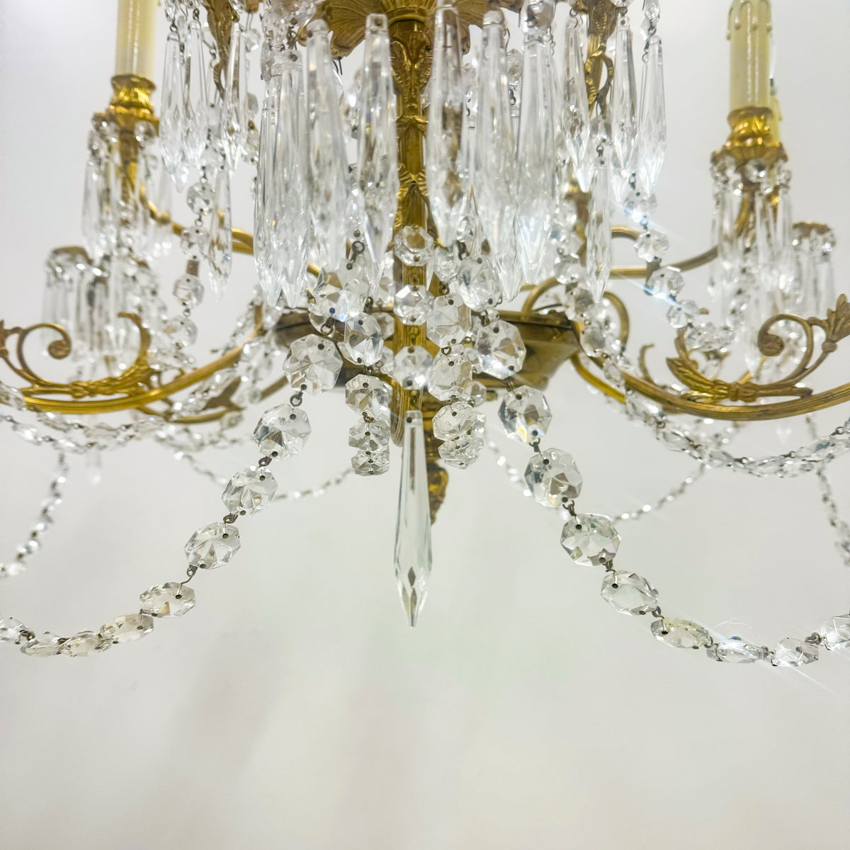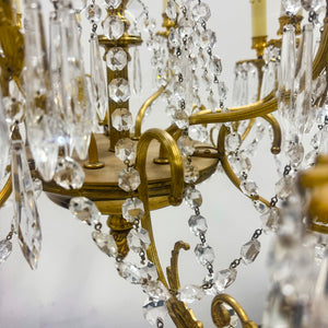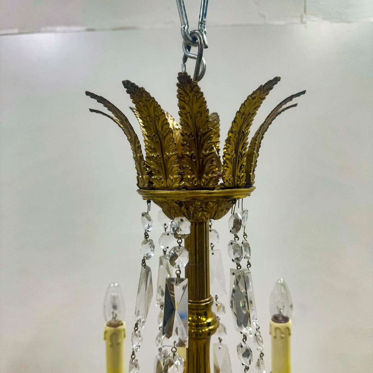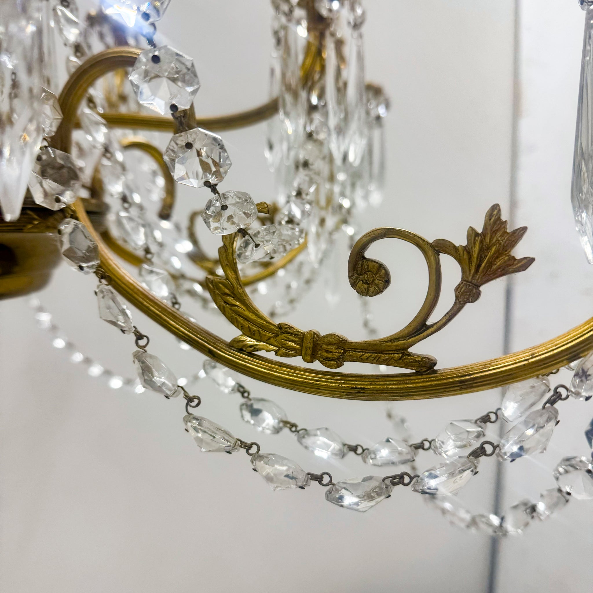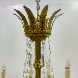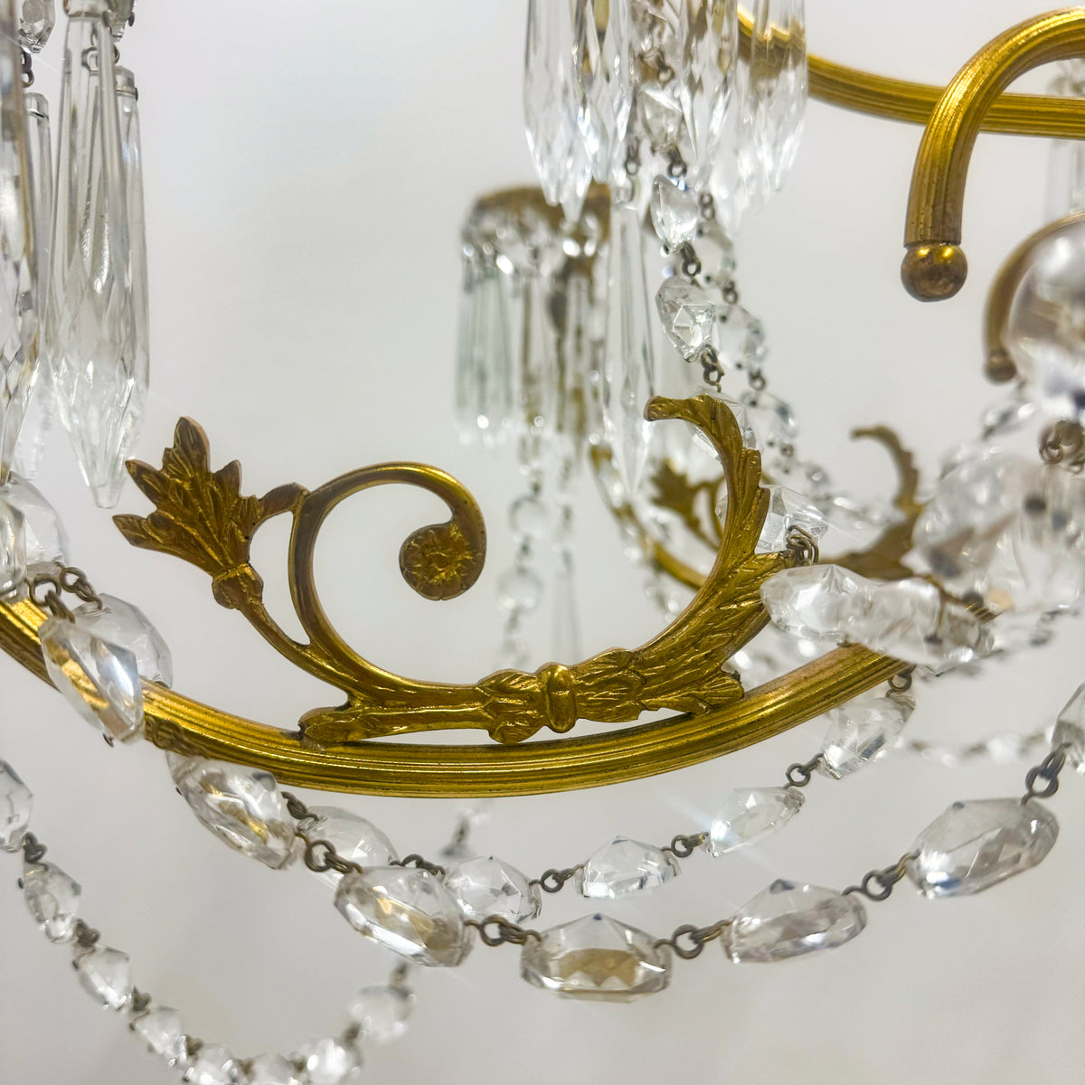 This exquisite basket-shaped chandelier features a stunning design crafted from gilded brass, beautifully complemented by cut crystals that enhance each light's charm. The ornate brass leaf spears perched atop the fixture add a touch of sophistication, making it a captivating focal point for any room.