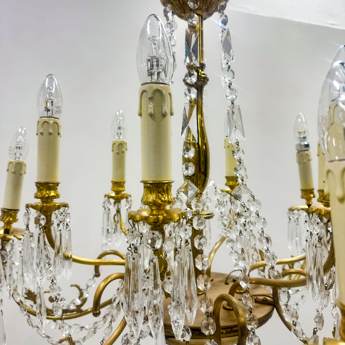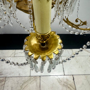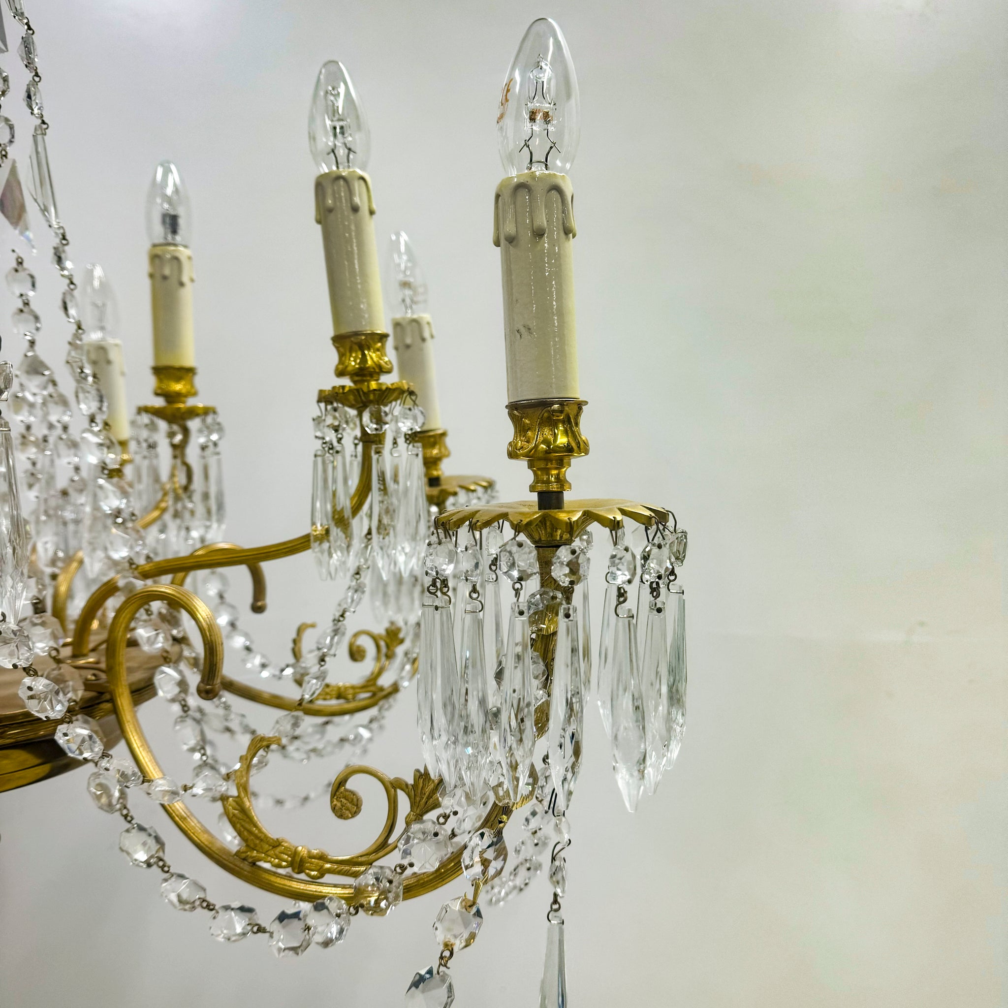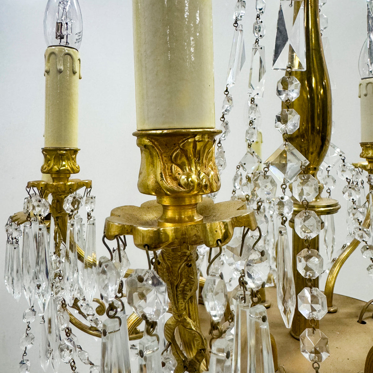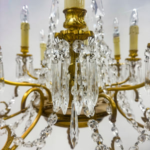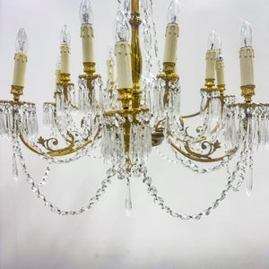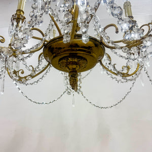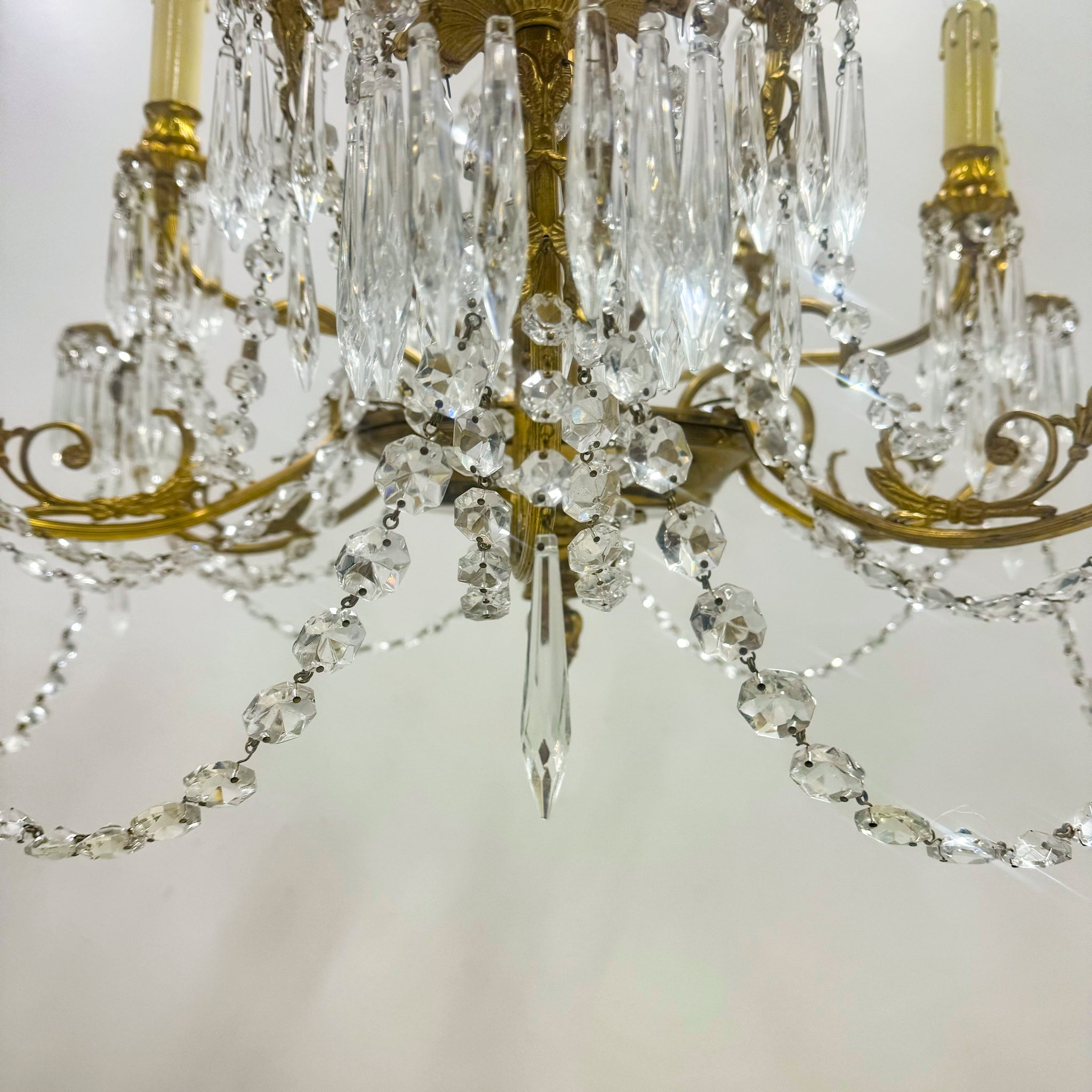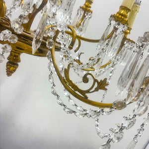 This exquisite basket-shaped chandelier features a stunning design crafted from gilded brass, beautifully complemented by cut crystals that enhance each light's charm. The ornate brass leaf spears perched atop the fixture add a touch of sophistication, making it a captivating focal point for any room.