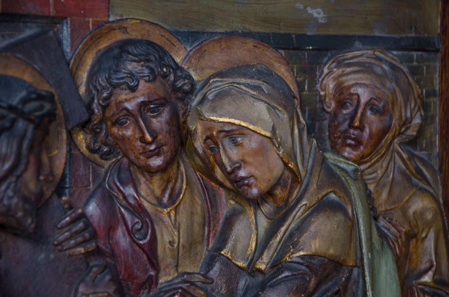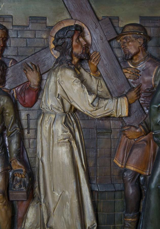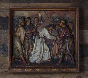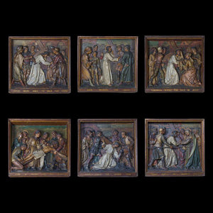 A set of eight antique Stations of the Cross plaques in plaster. These remarkable pieces were reclaimed from a church in London. The plaques have been expertly crafted in high relief plaster and then would have been painstakingly painted by hand. The plaques each sit within deep wooden frames, each one marked with which part of the story of the crucifixion they depict. The pictures are wonderfully expressive, highlighting the skill of the artist.
