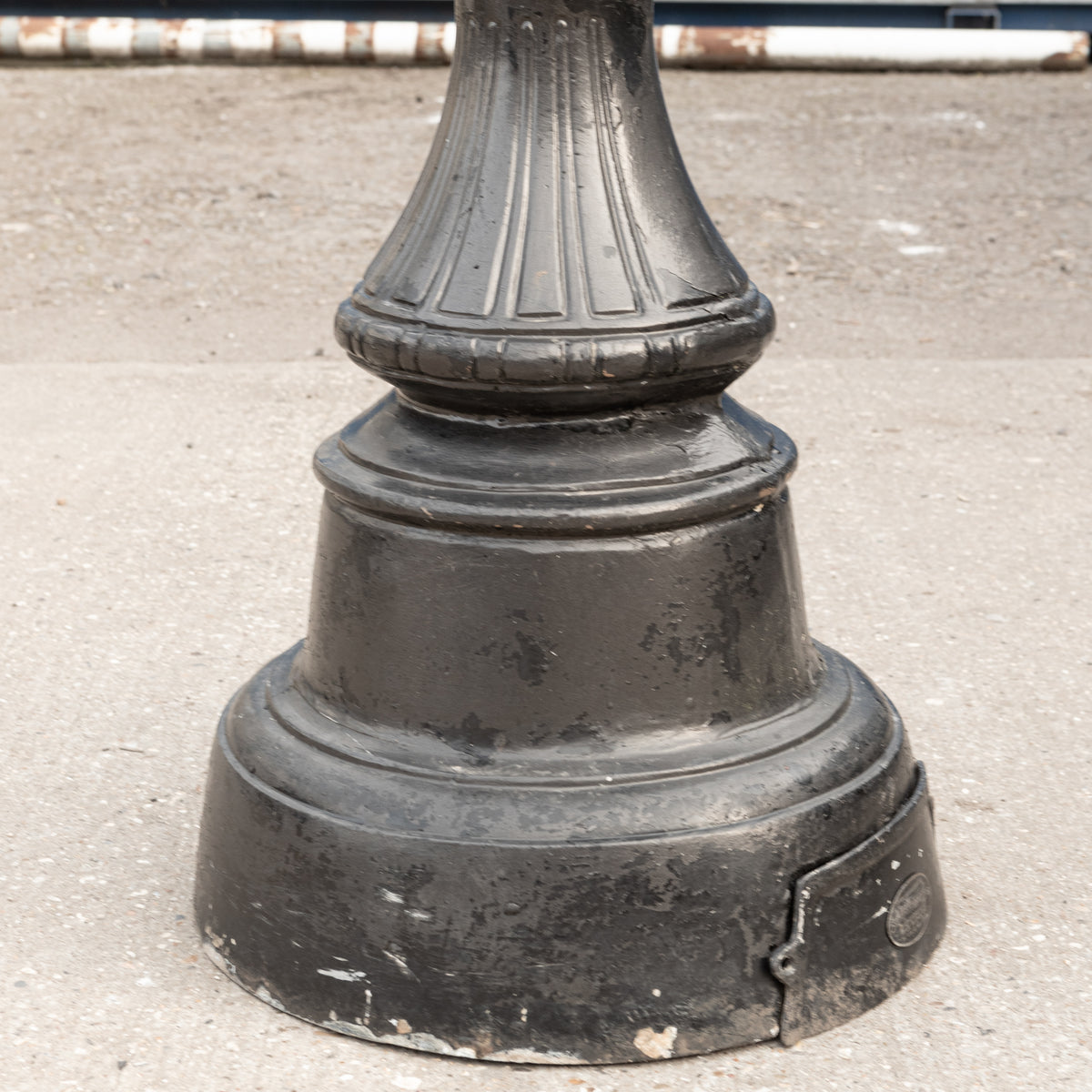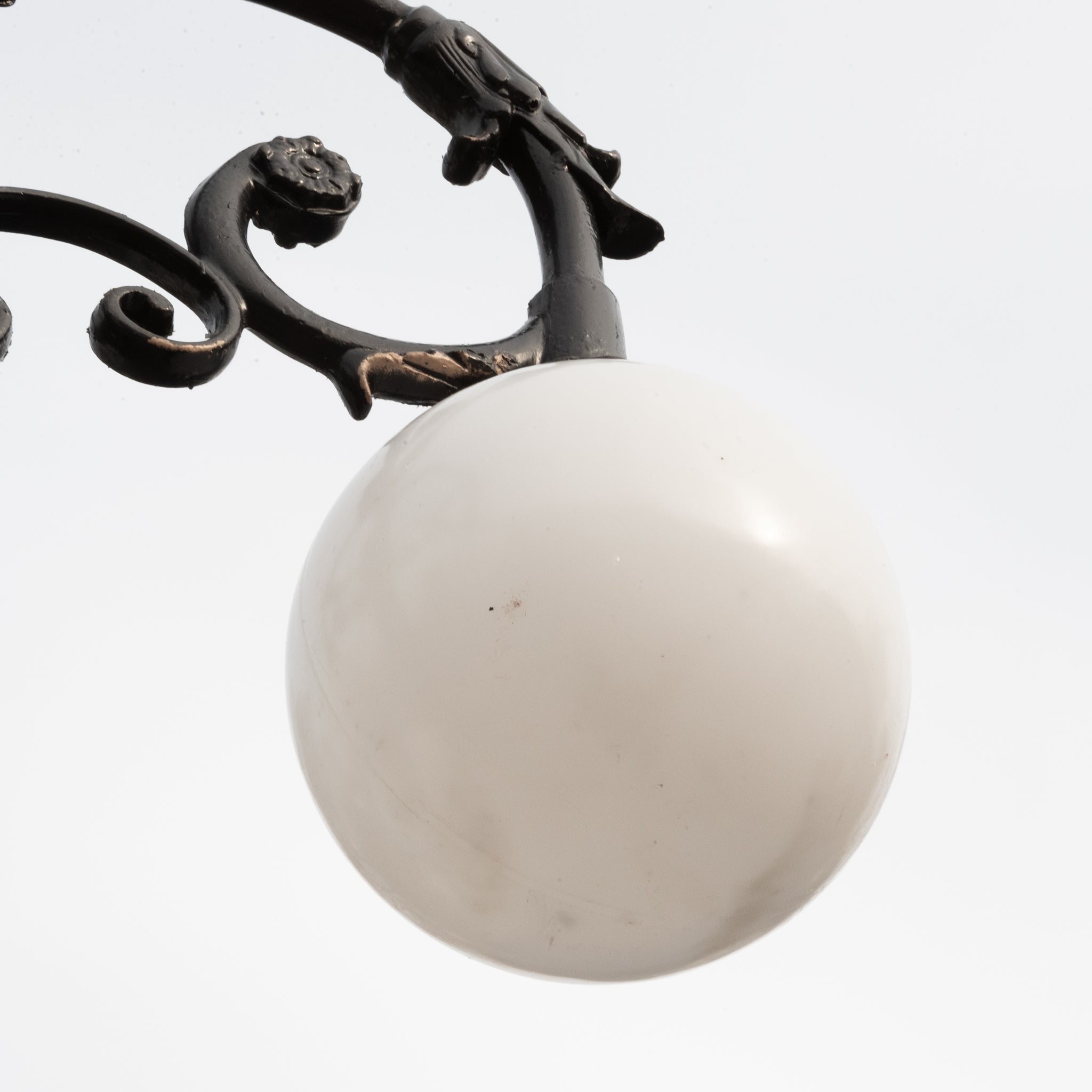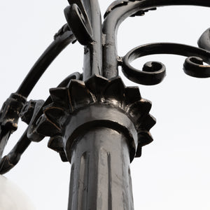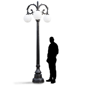 Each Cast Aluminum post has 3 large polycarbonate opal globes and ornate scrolling metalwork.
