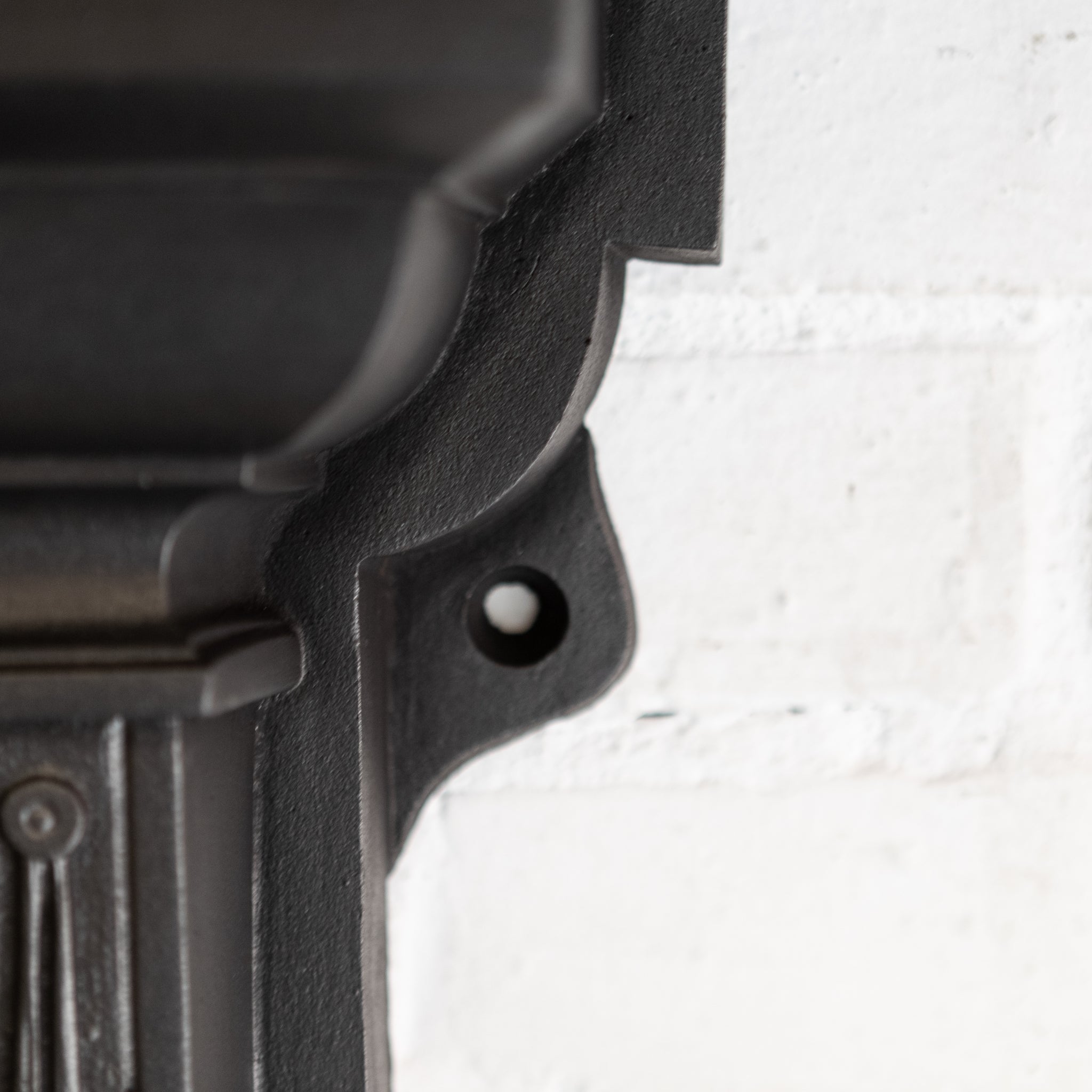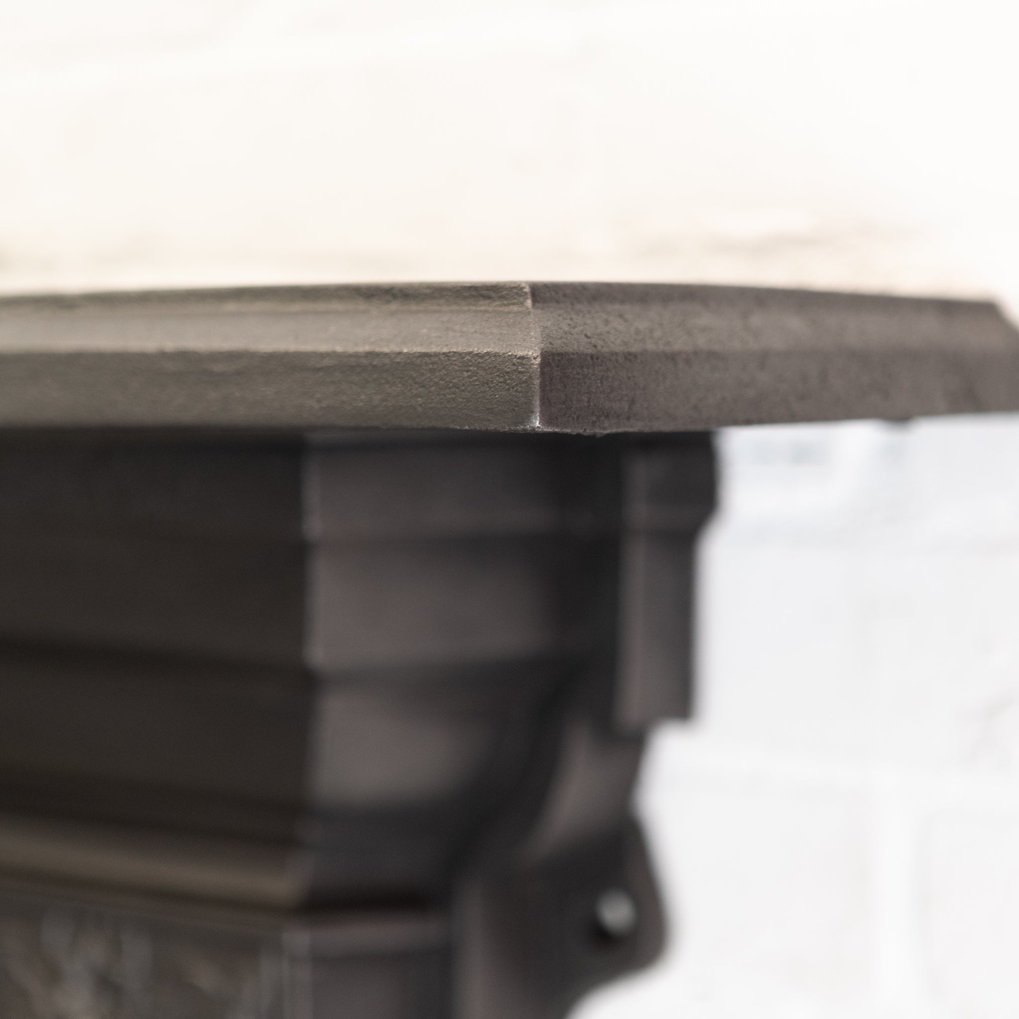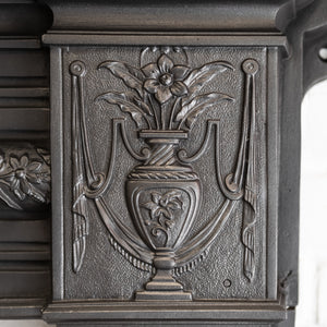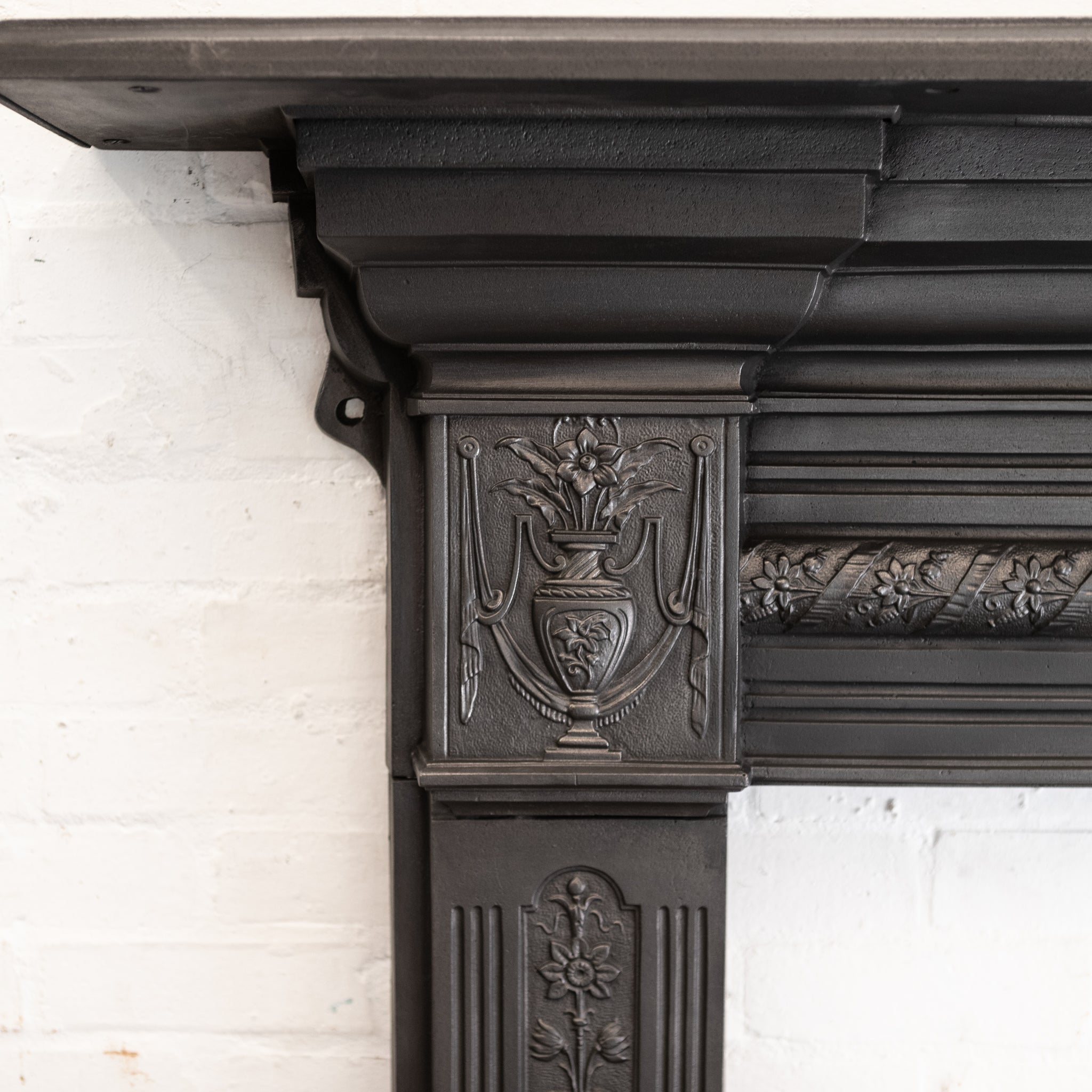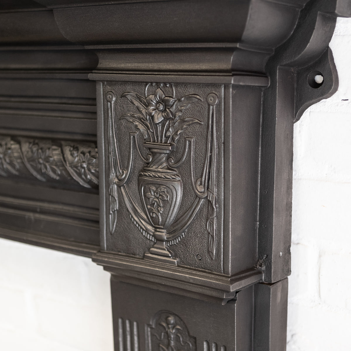 Proud jambs are adorned with trailing florals which are surmounted by further flowers in an urn. The deep shelf delivers a large surface area for displaying items.