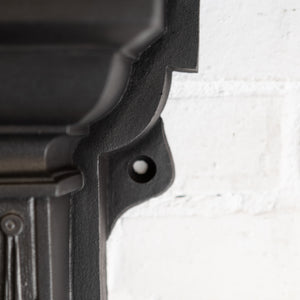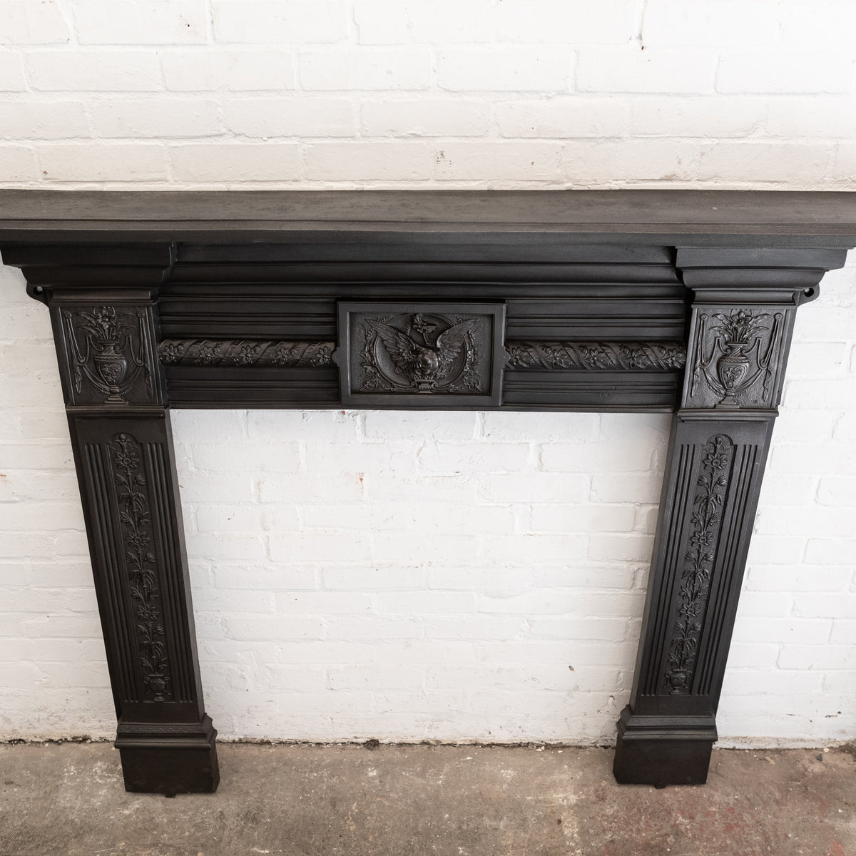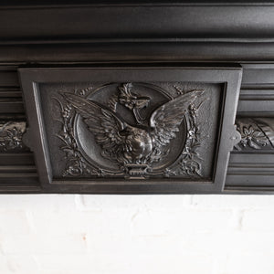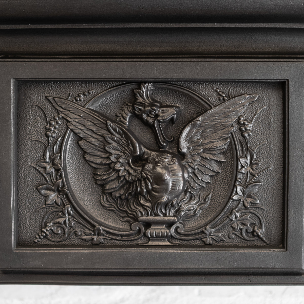 This antique victorian surround offers a very interesting piece with traditional motifs teamed with a mythical figure of a dragon or griffon to the centre of the lintel.