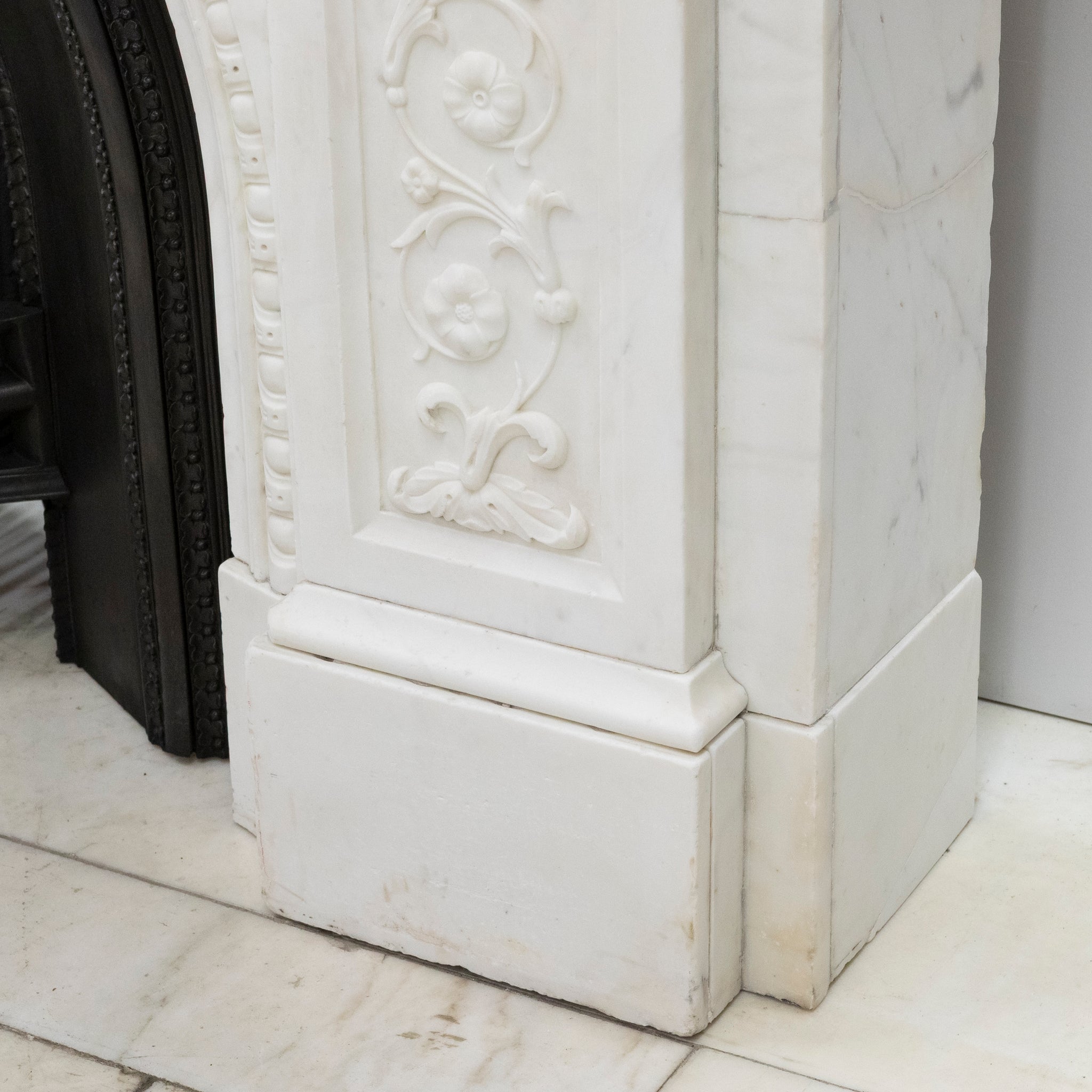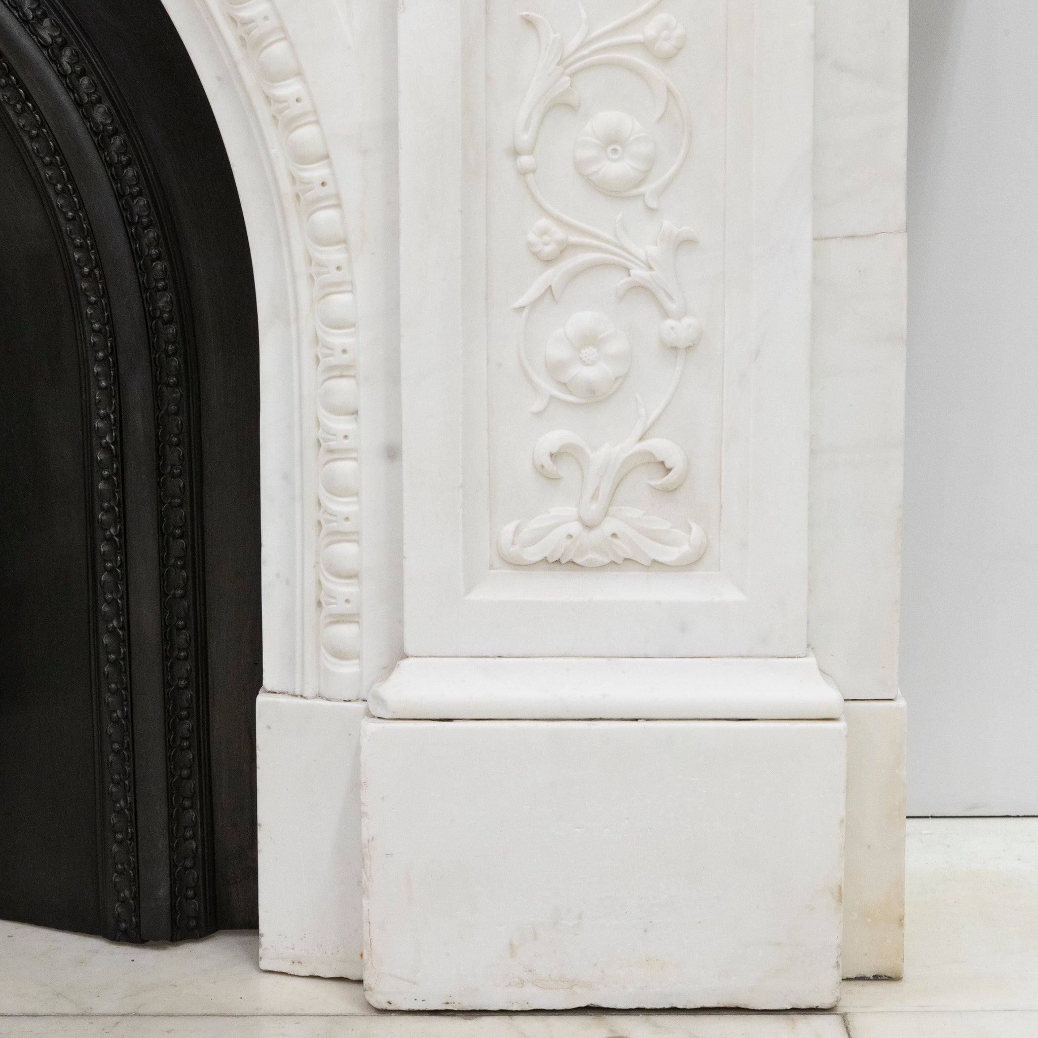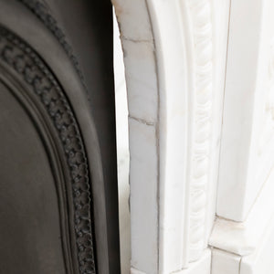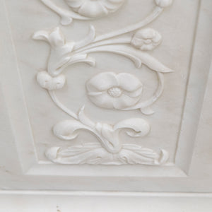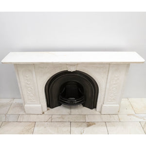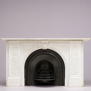 A substantial and striking fireplace surround with ornate carvings crafted from statuary marble. This original Victorian fireplace features carved floral bouquets repeated down the panelled length of each jamb. The moulded bevelled shelf sits above the arched opening with its central, deeply carved decorative keystone.