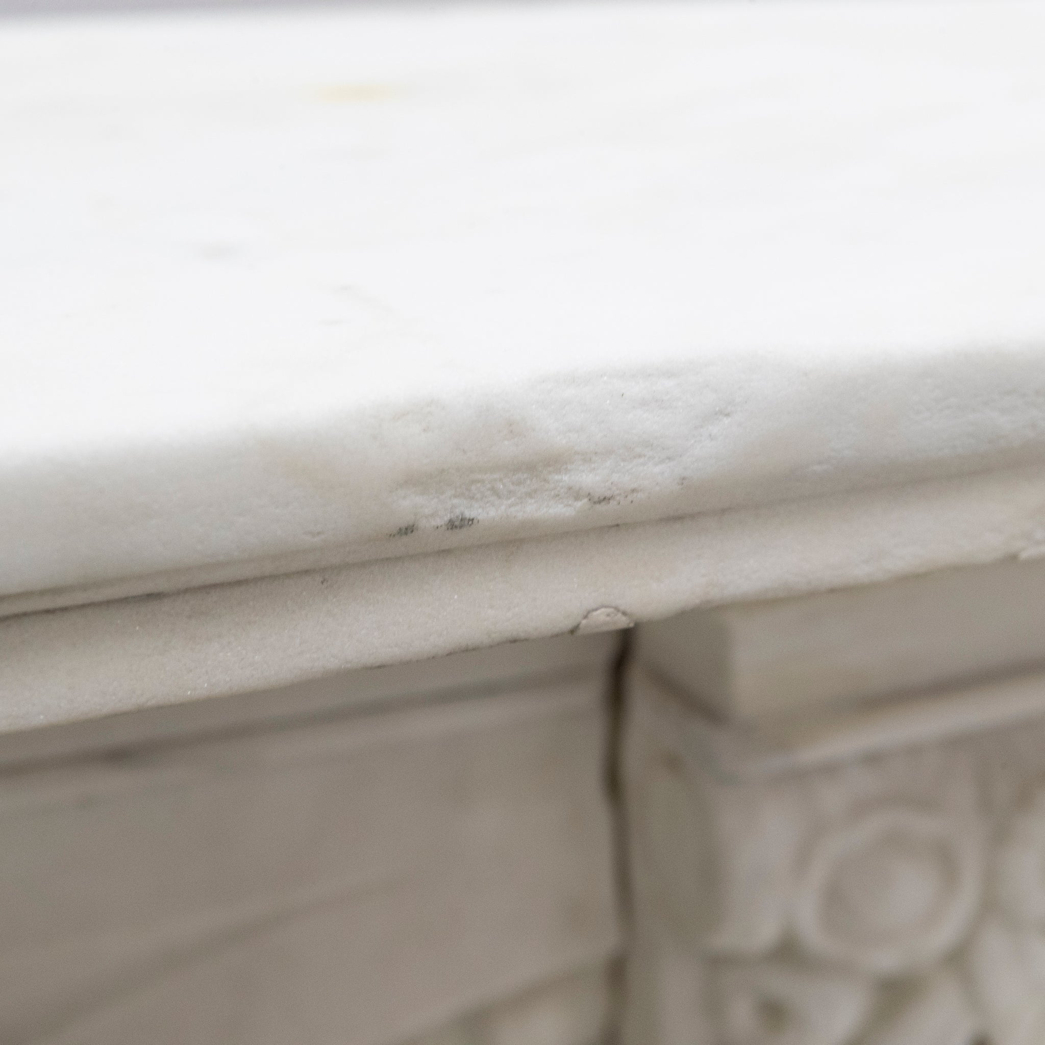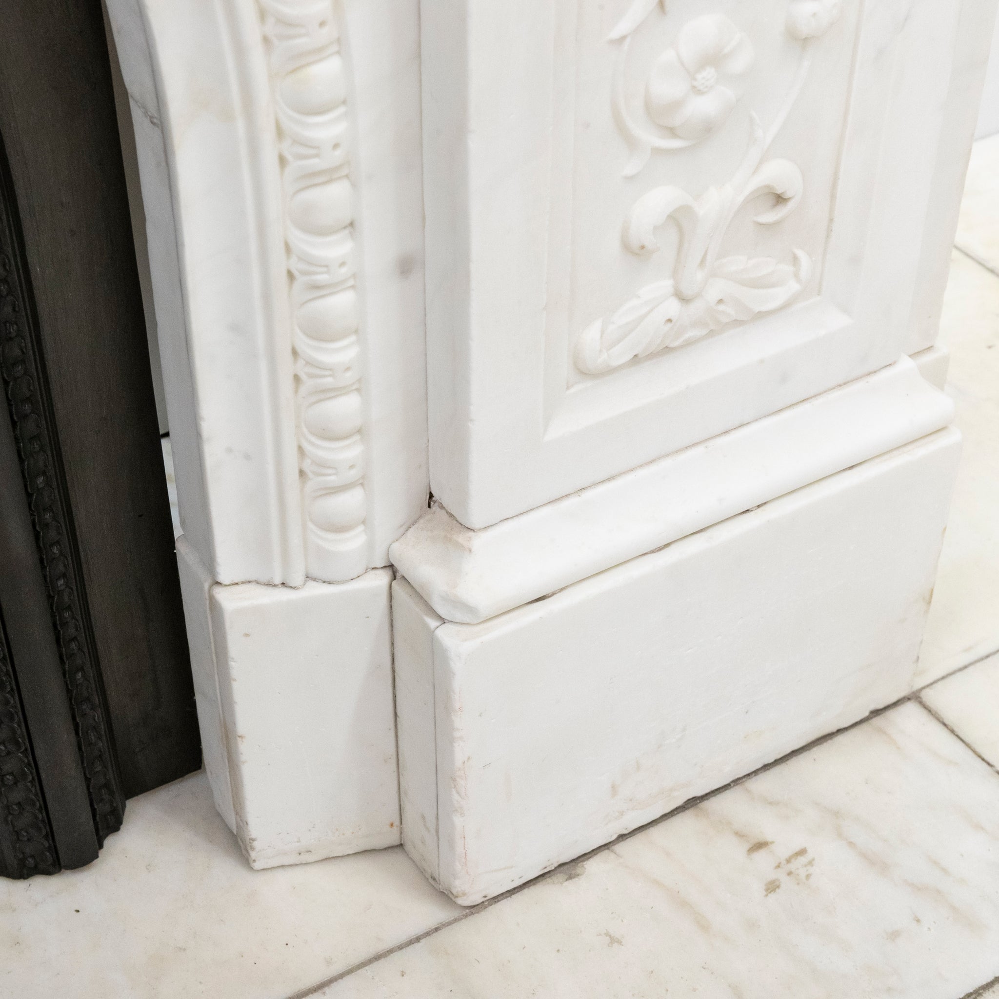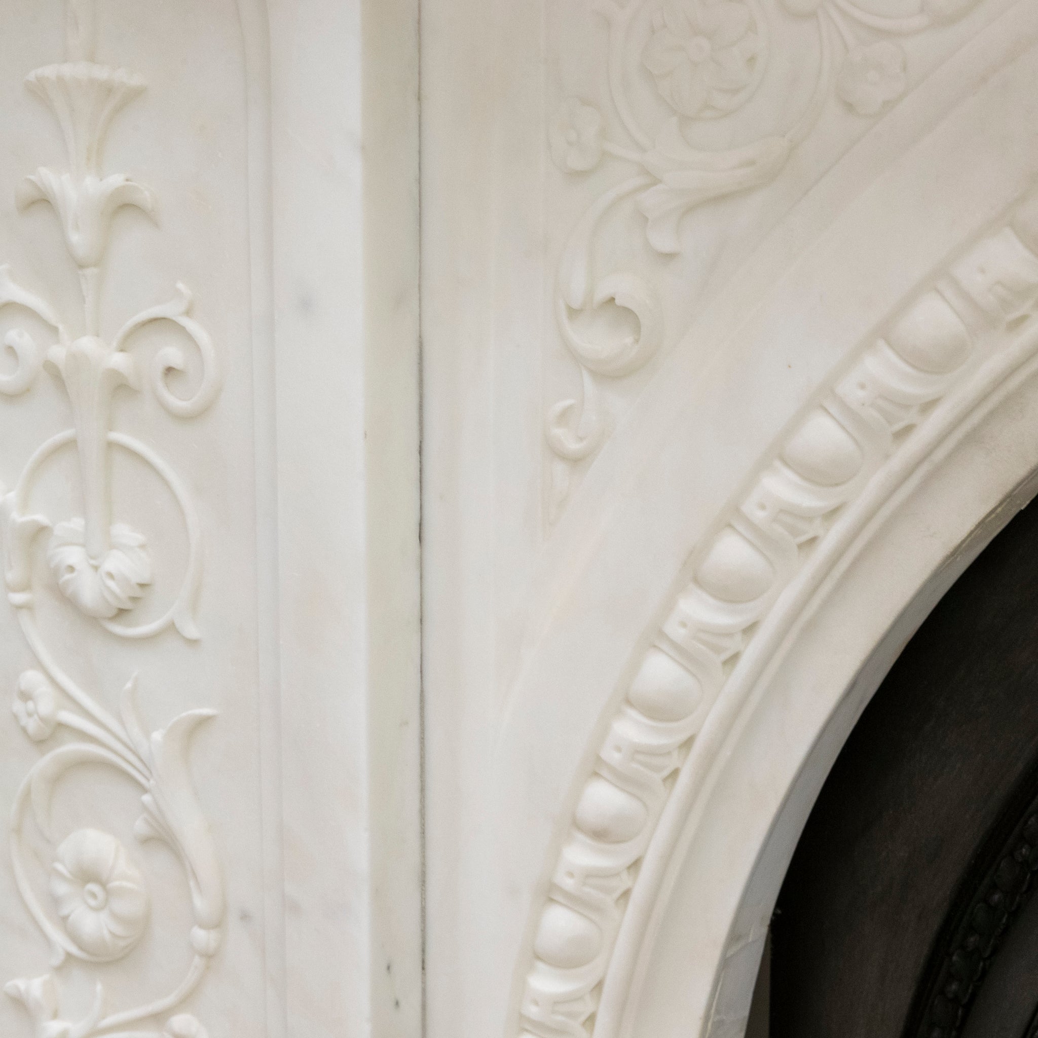 A substantial and striking fireplace surround with ornate carvings crafted from statuary marble. This original Victorian fireplace features carved floral bouquets repeated down the panelled length of each jamb. The moulded bevelled shelf sits above the arched opening with its central, deeply carved decorative keystone.