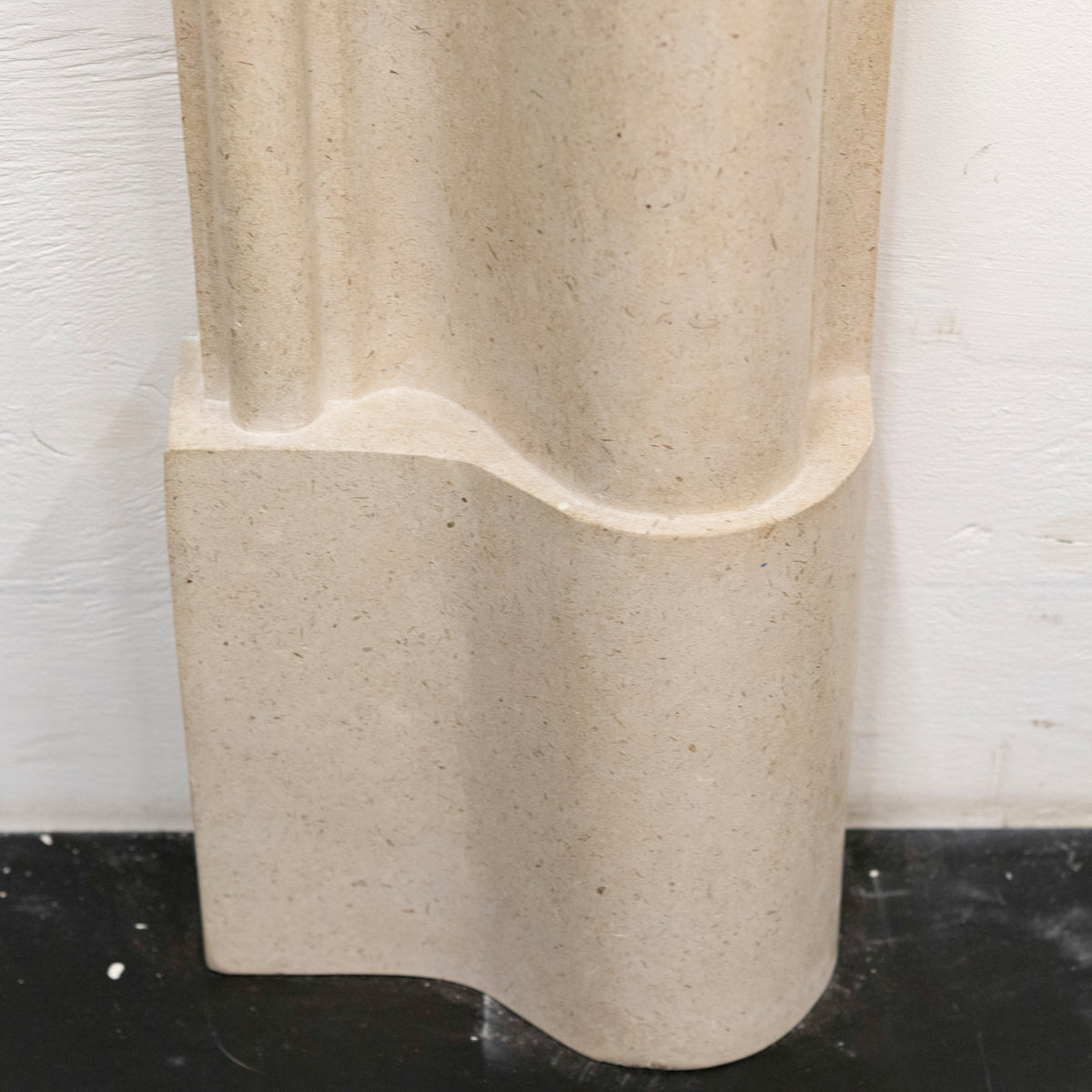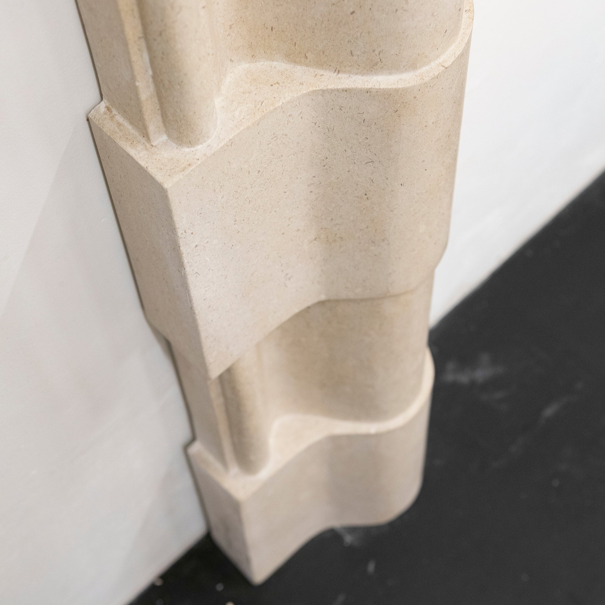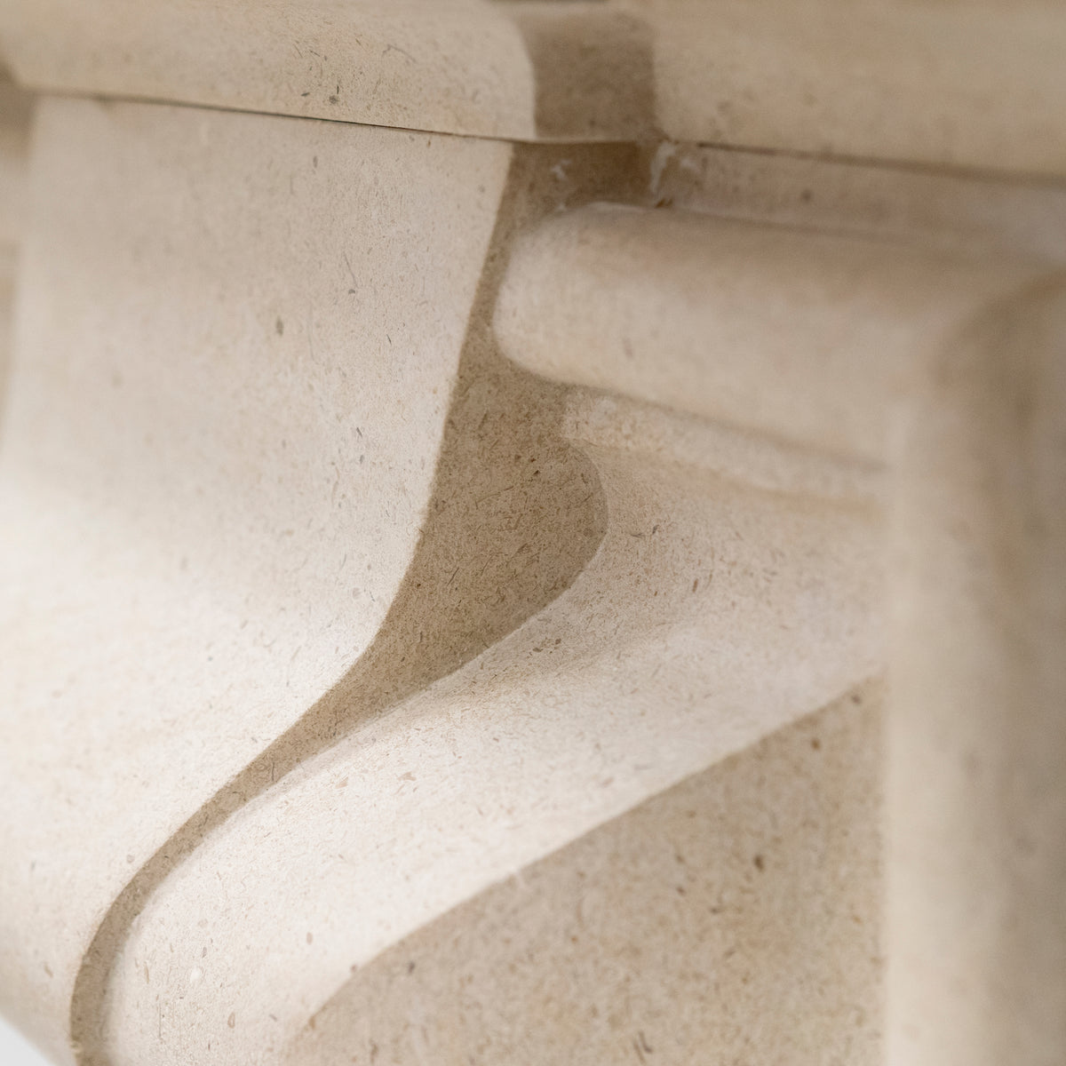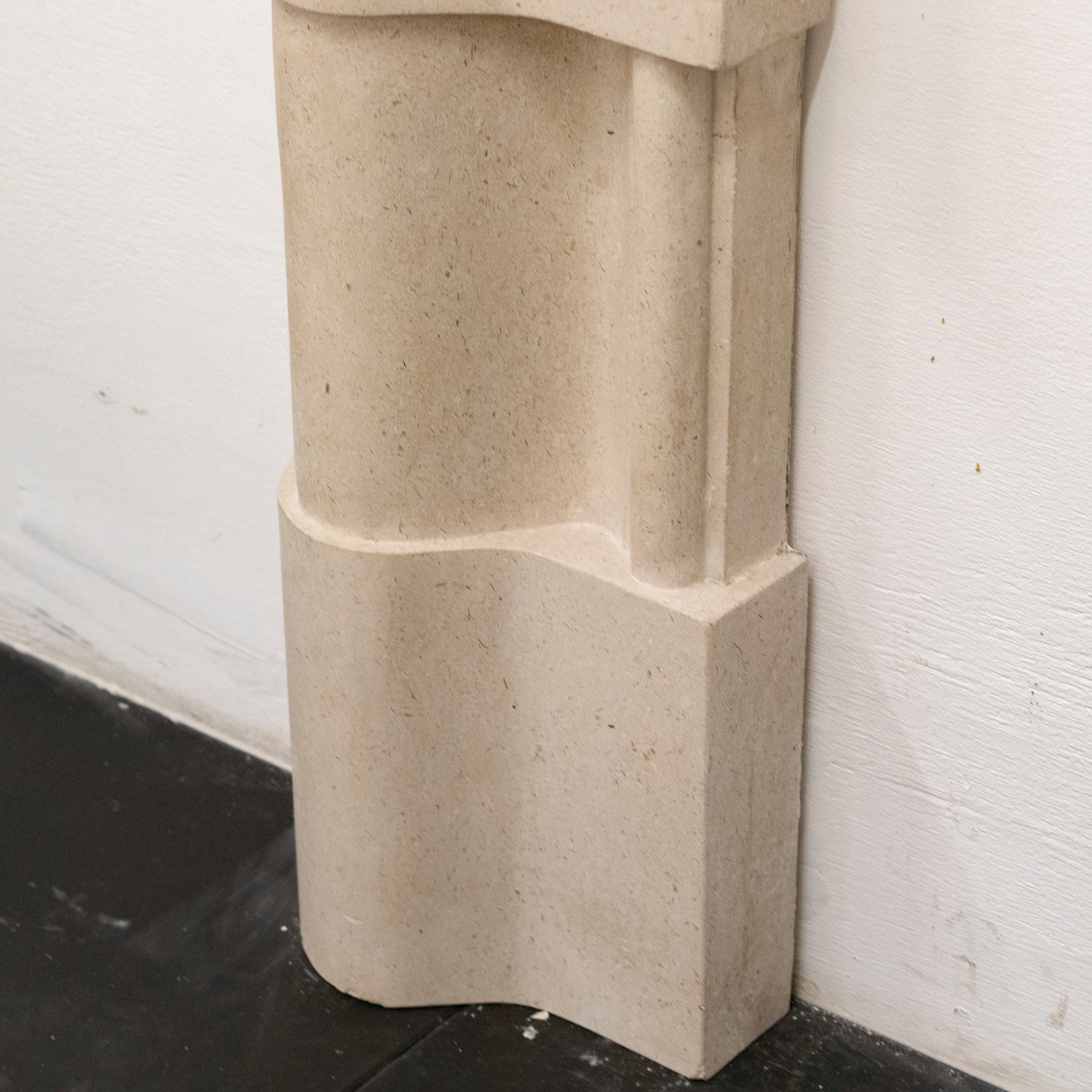 This exceptional fireplace, crafted from Portland stone, showcases a strong architectural design inspired by the works of English ornamental designer Batty Langley. Its highly unusual construction features quoins elegantly incorporated within the frame, adding depth and character to the piece and making it a striking focal point in any space.
