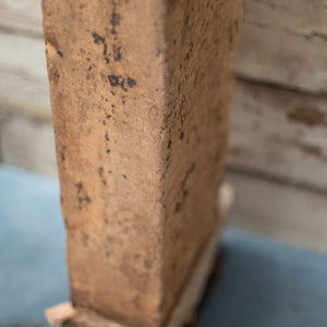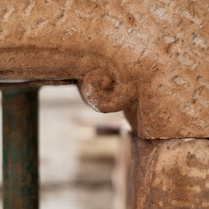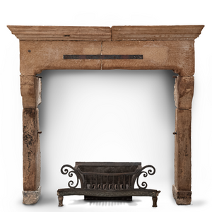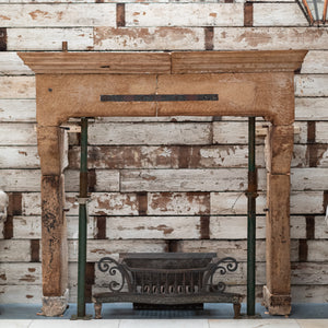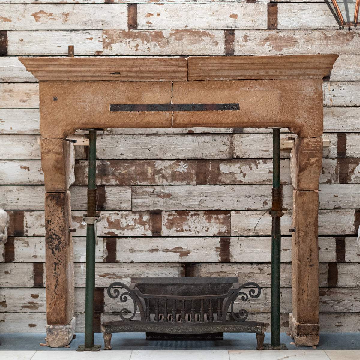 The imposing form and rich patina of the English stone make for a feature piece for a space matching the scale. The curved jambs that support the moulded shelf rest on raised rectangular end-blocks.