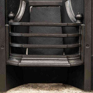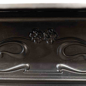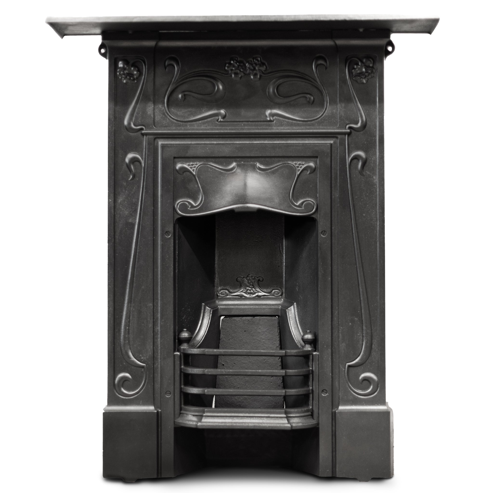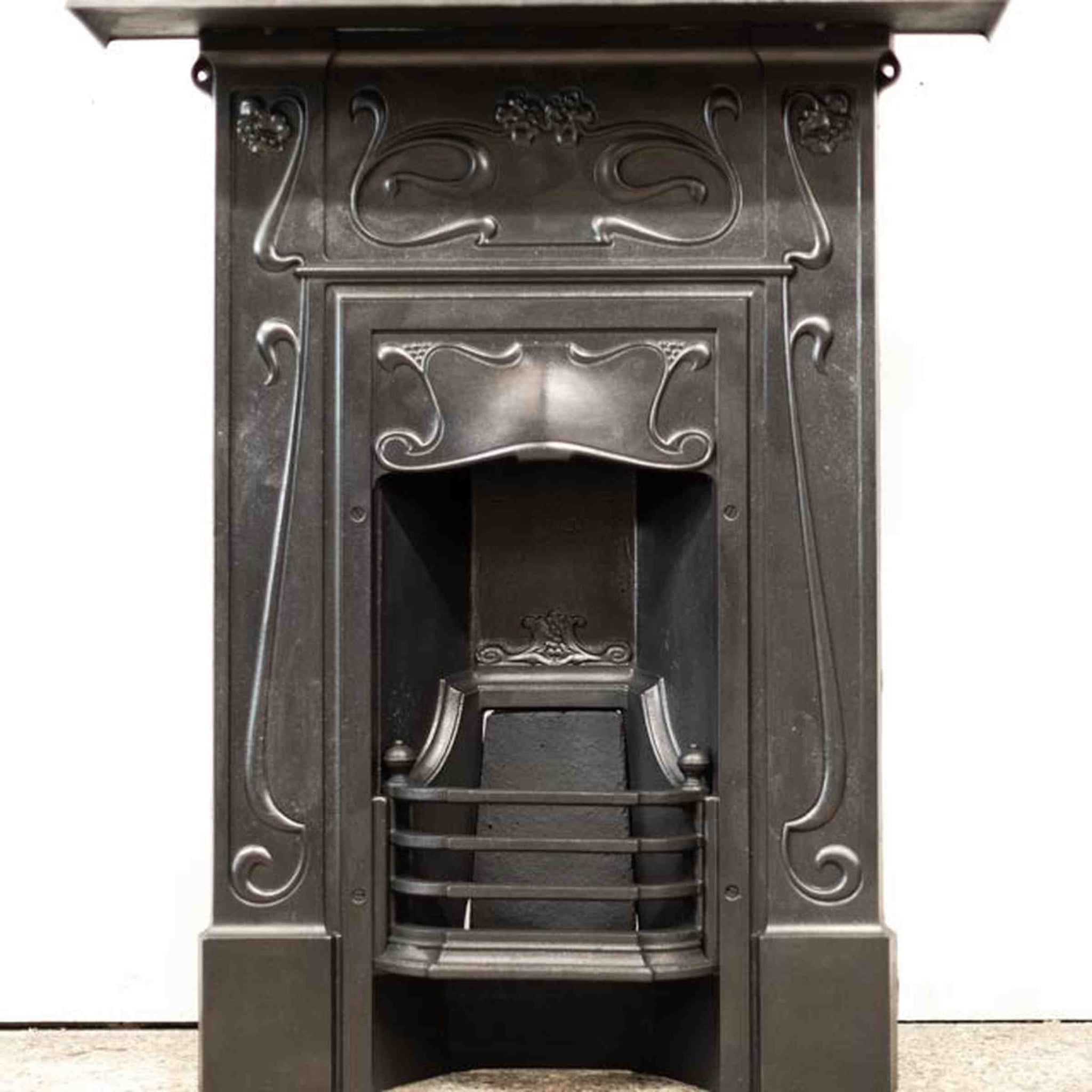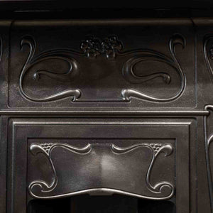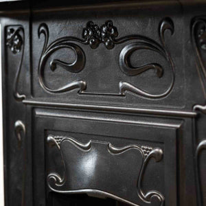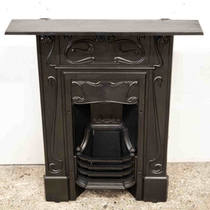 An original Art Nouveau combination fireplace in cast iron. The ornate and attractive piece has symmetry of floral motifs typical of the Art Nouveau movement. The simple 3 bar integral basket sits beneath the bow hood.