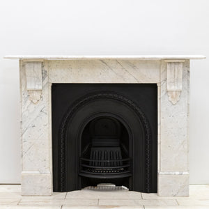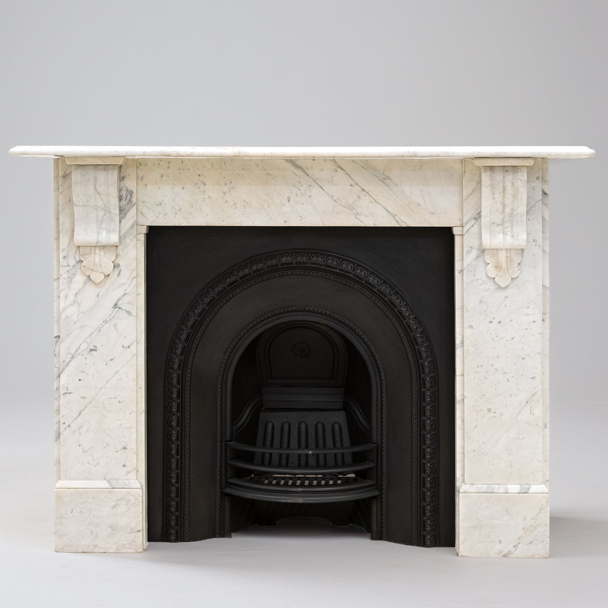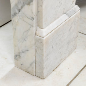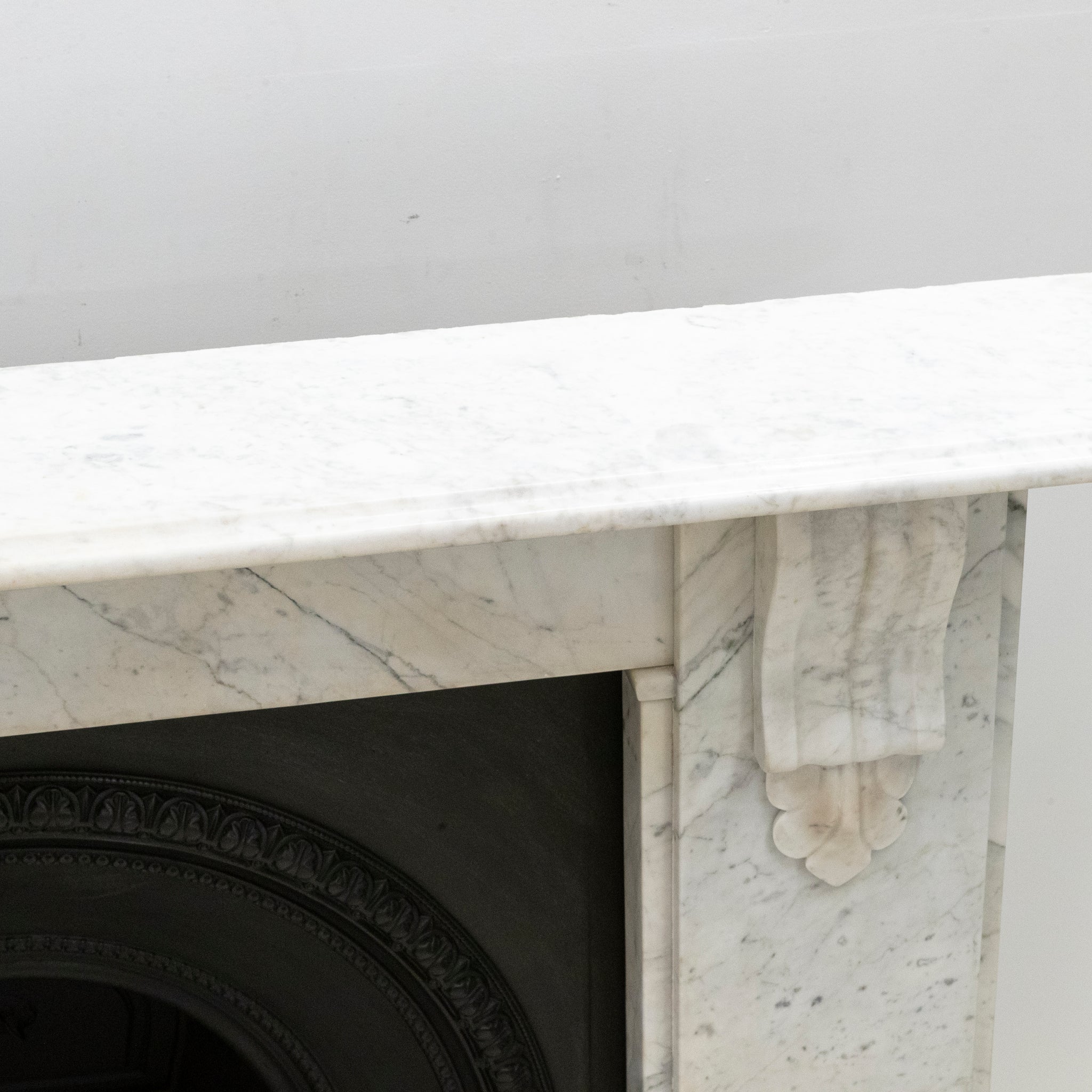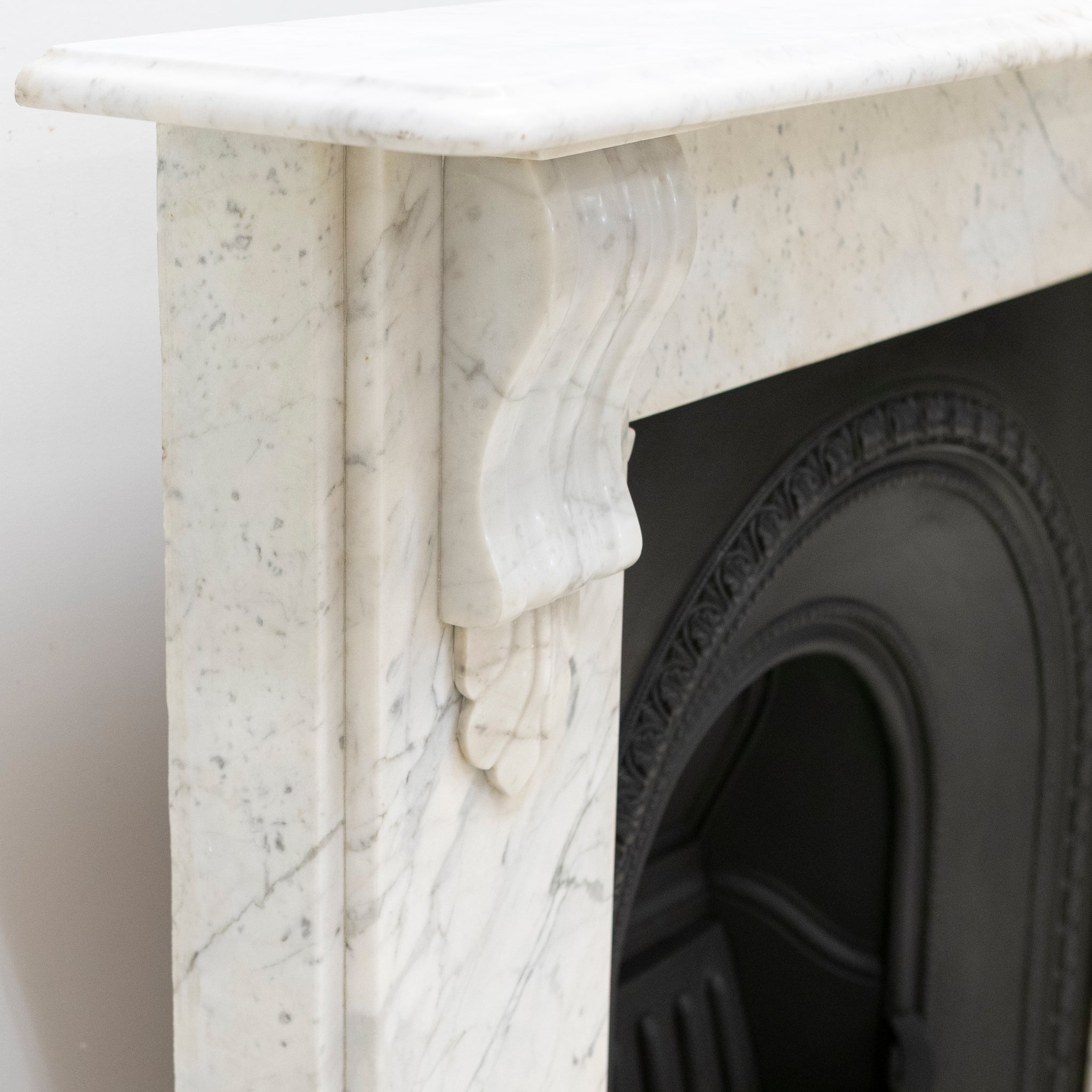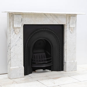A 19th-century Italian Carrara marble fireplace surround with strong, well-judged proportions and finely carved corbels.