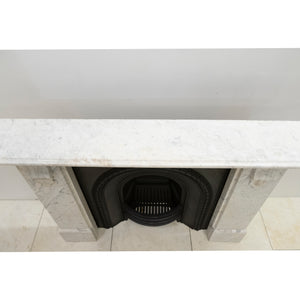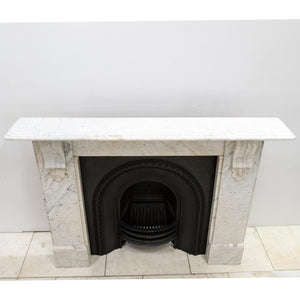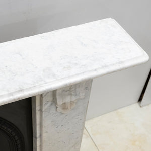 The bevelled shelf is substantial with good projection, supported by deeply cut solid marble corbels. The frieze and jambs are simple with no panelling.