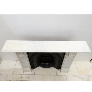 The bevelled shelf is substantial with good projection, supported by deeply cut solid marble corbels. The frieze and jambs are simple with no panelling.