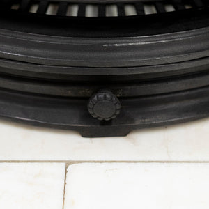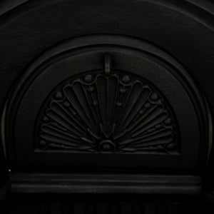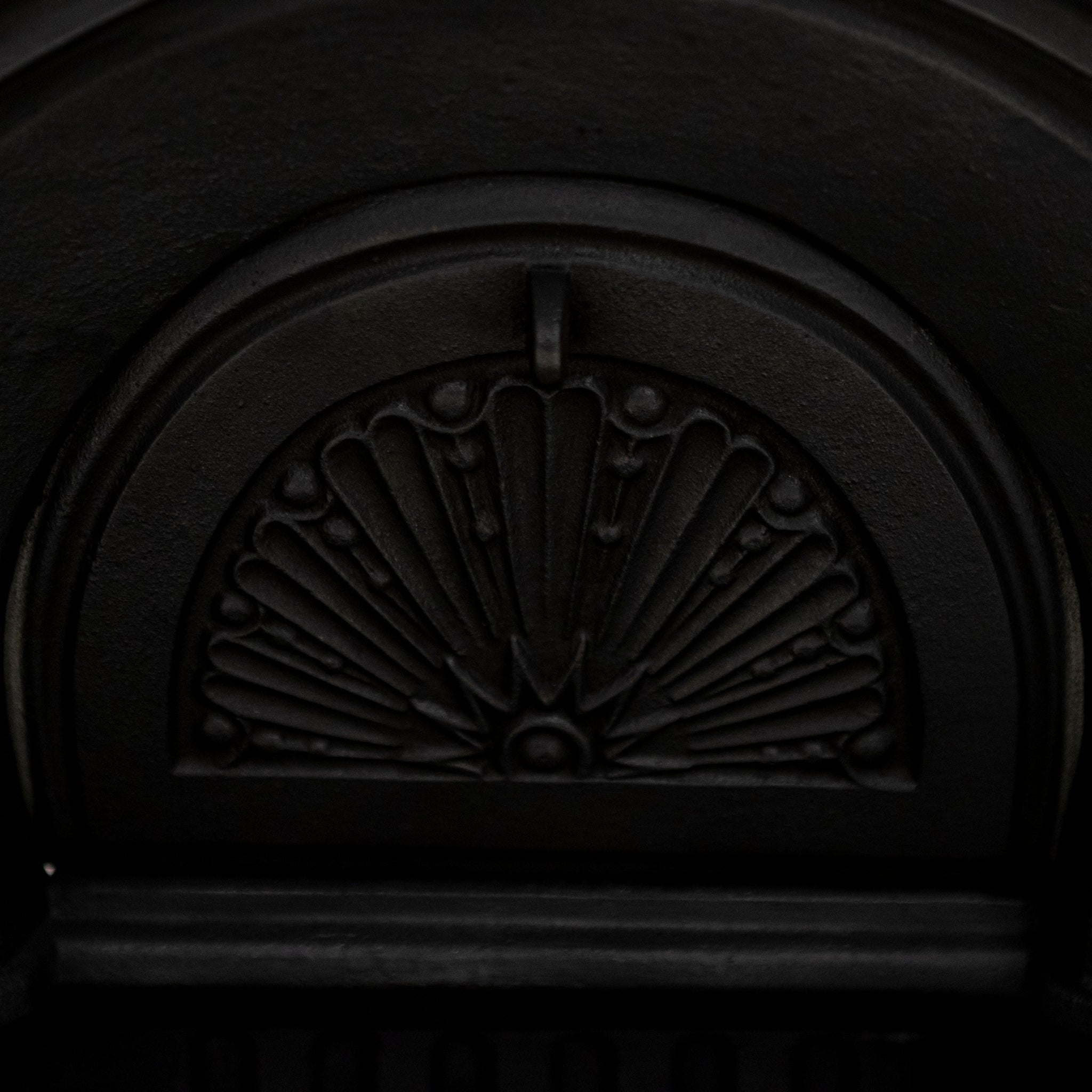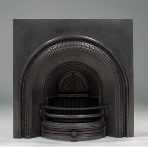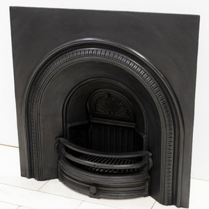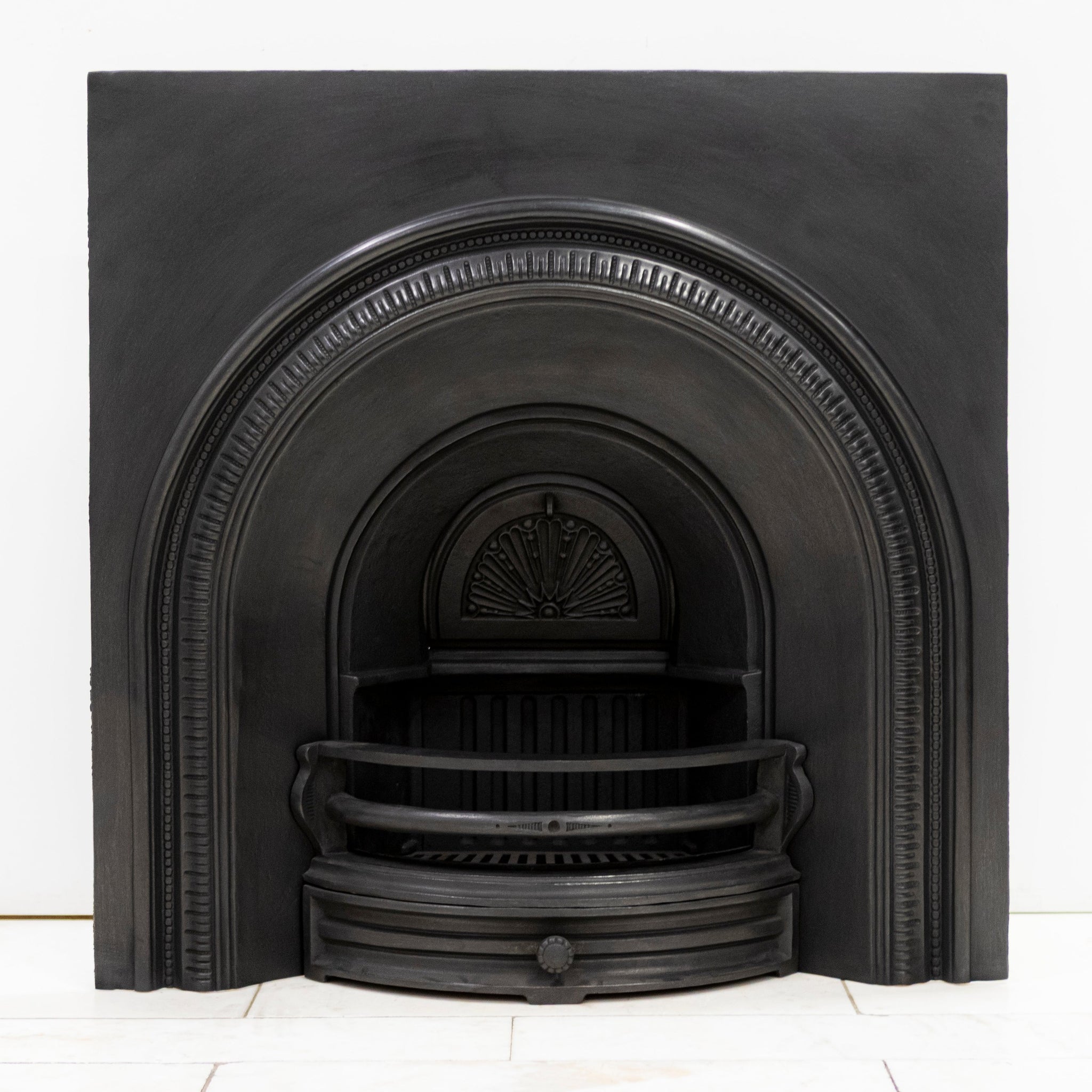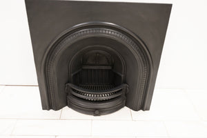 Antique Cast Iron Arched Fireplace Insert with an arched opening and ornate border.
