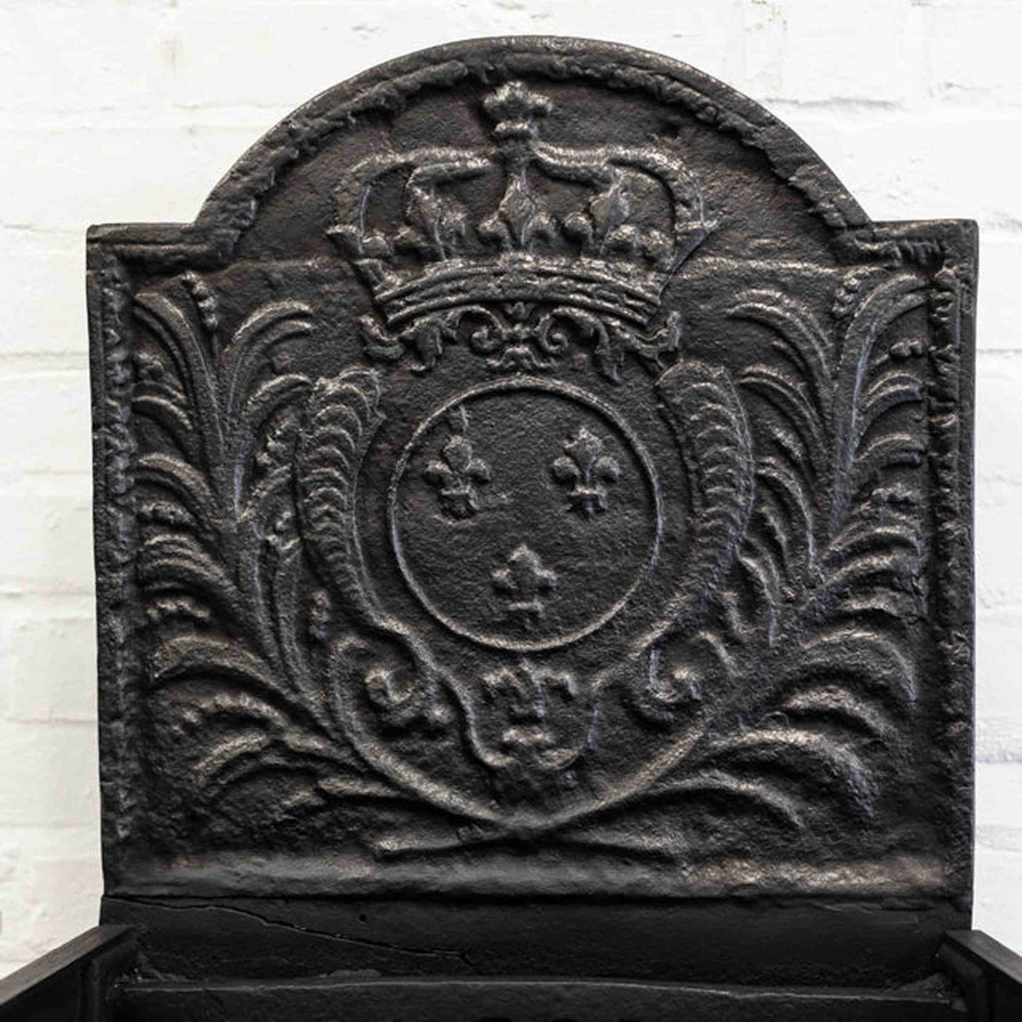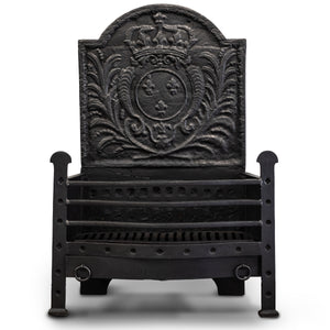 The late 19th Century grand grate has a high back with regal motifs, a crown, and a trio of fleur de lis. The piece comes complete with removable ashpan cover.