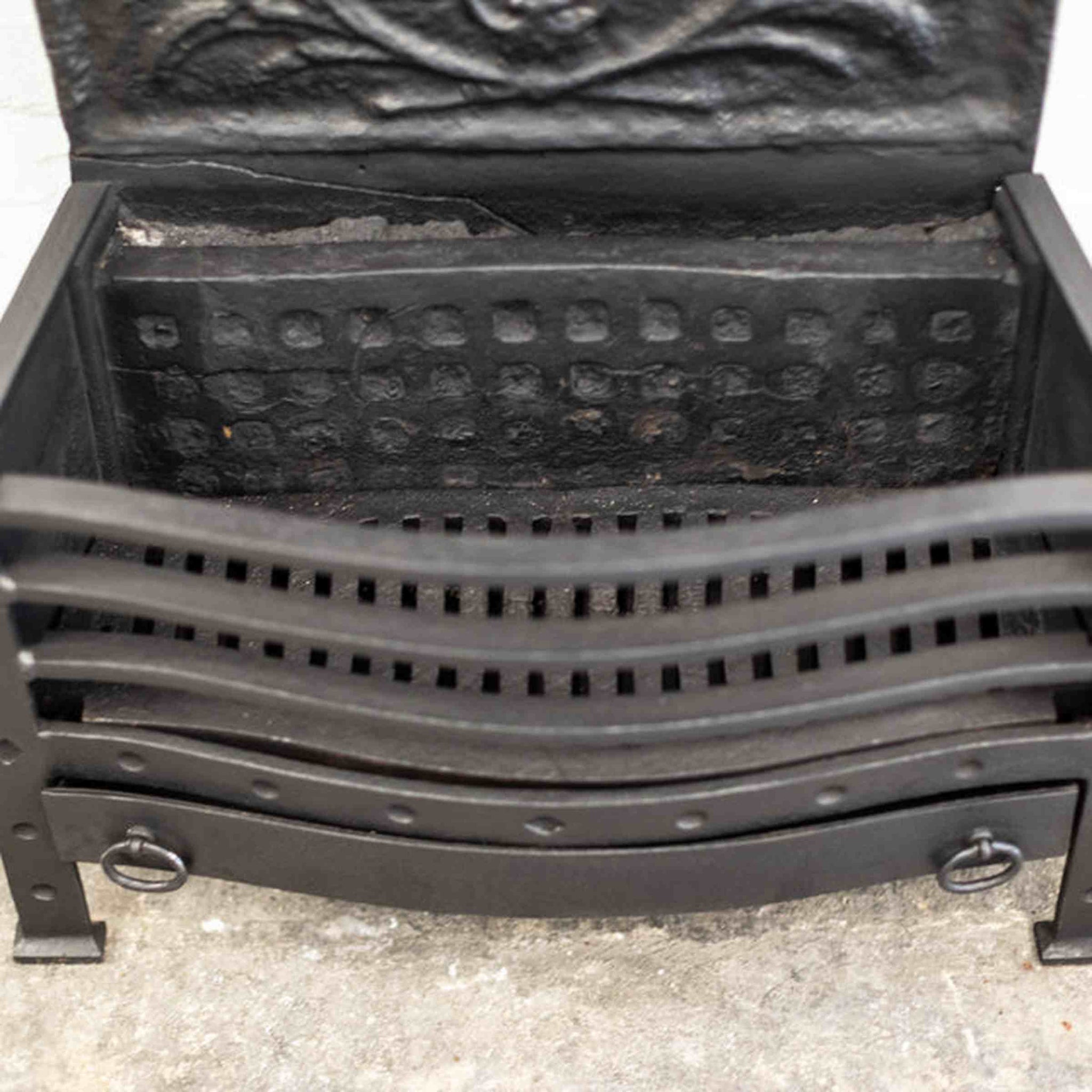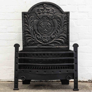 An Antique cast iron Fire basket with a crown and foliage back plate.