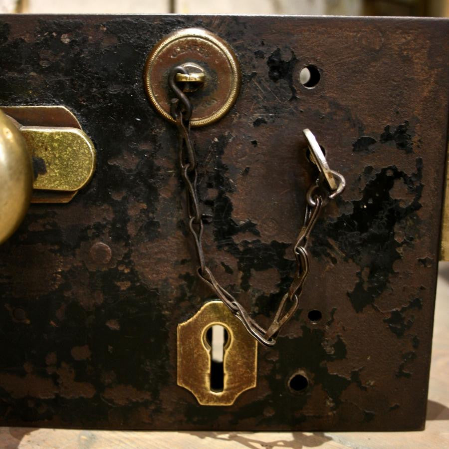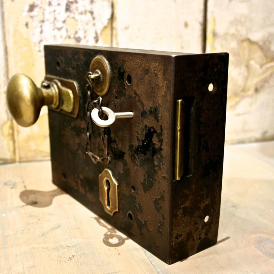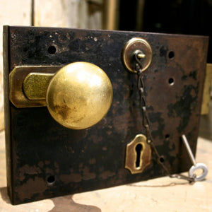 This original nineteenth century lock and key, which includes a working latch and brass handle, was made by the distinguished manufacturer Joseph Bates.