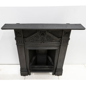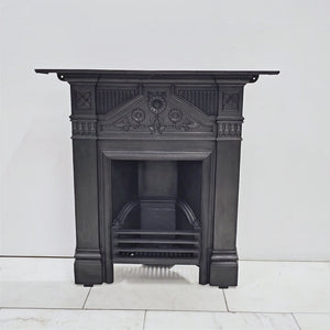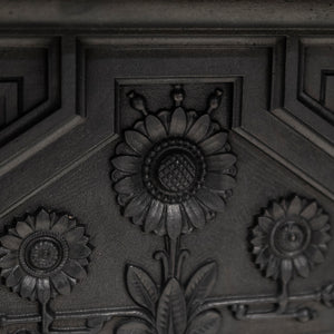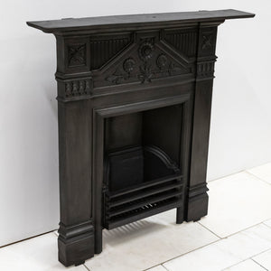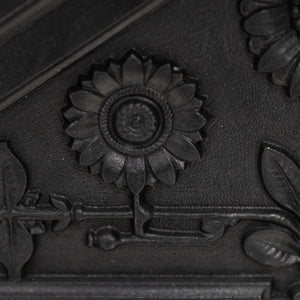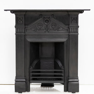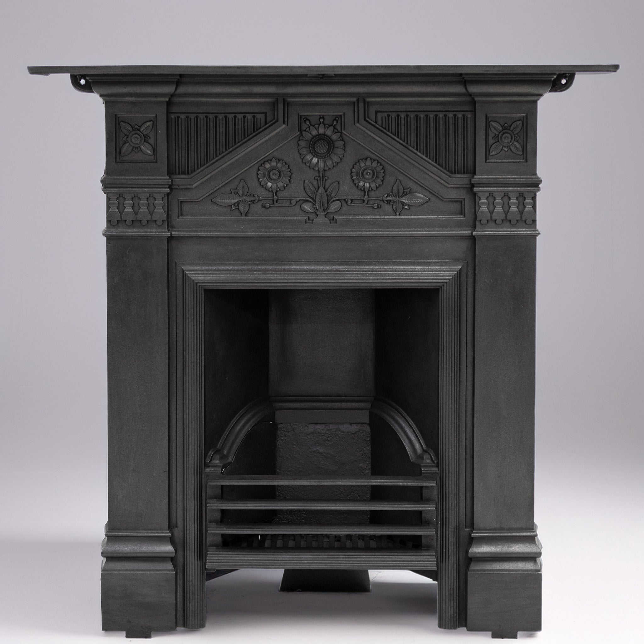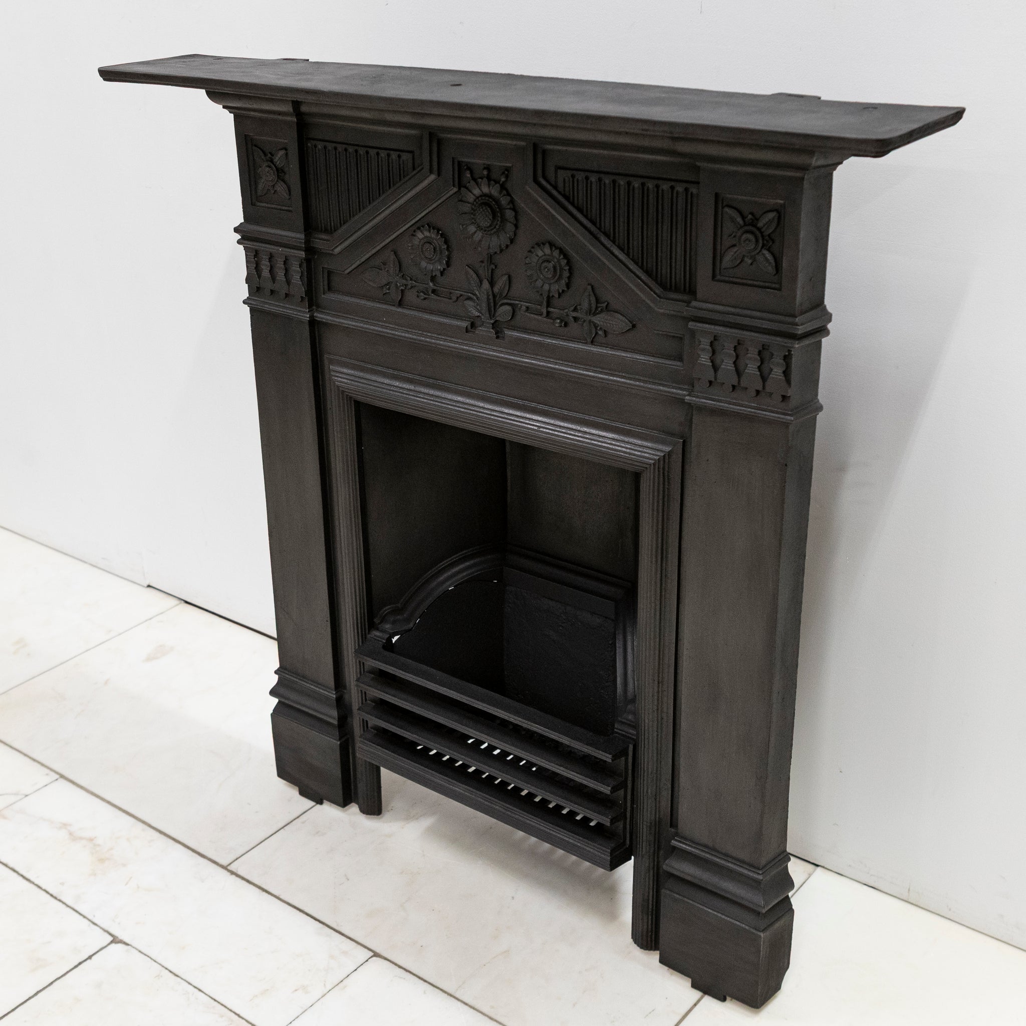 An antique cast iron combination fireplace featuring a triptych of daisy motifs above the hood, with an integral three-bar basket.