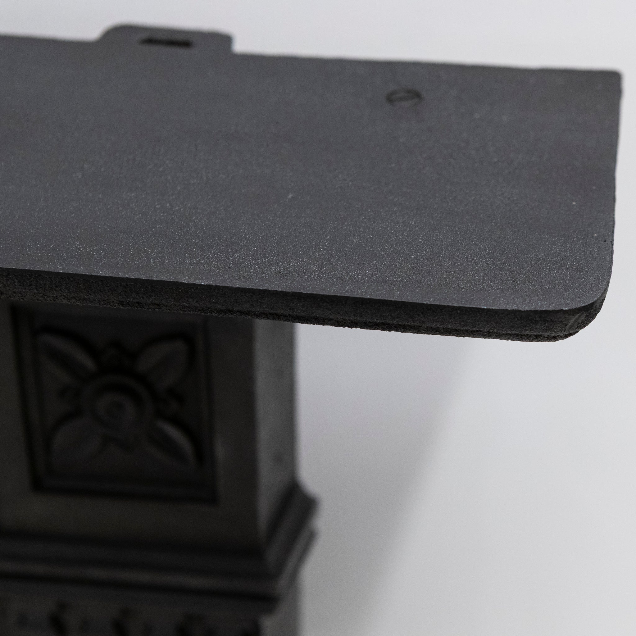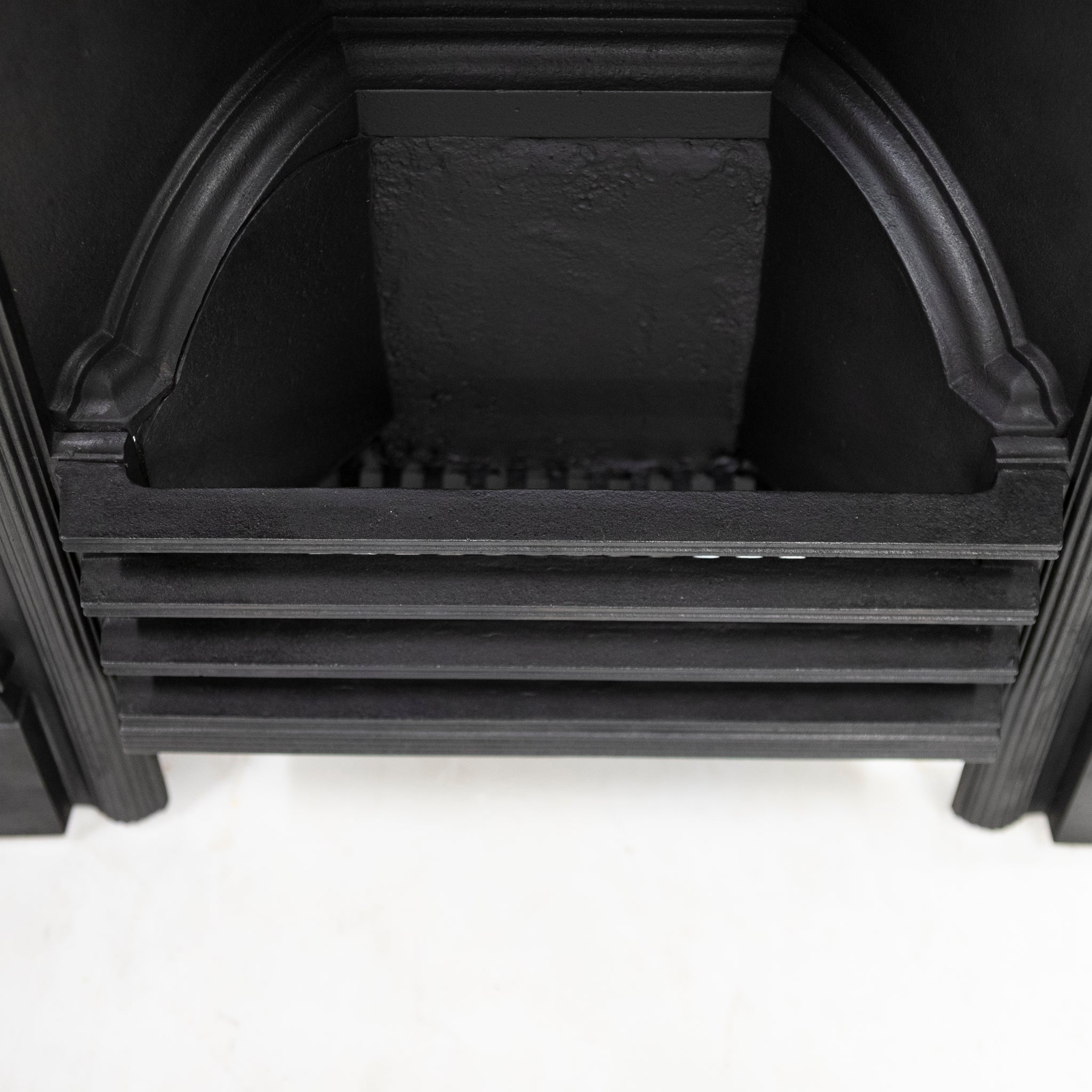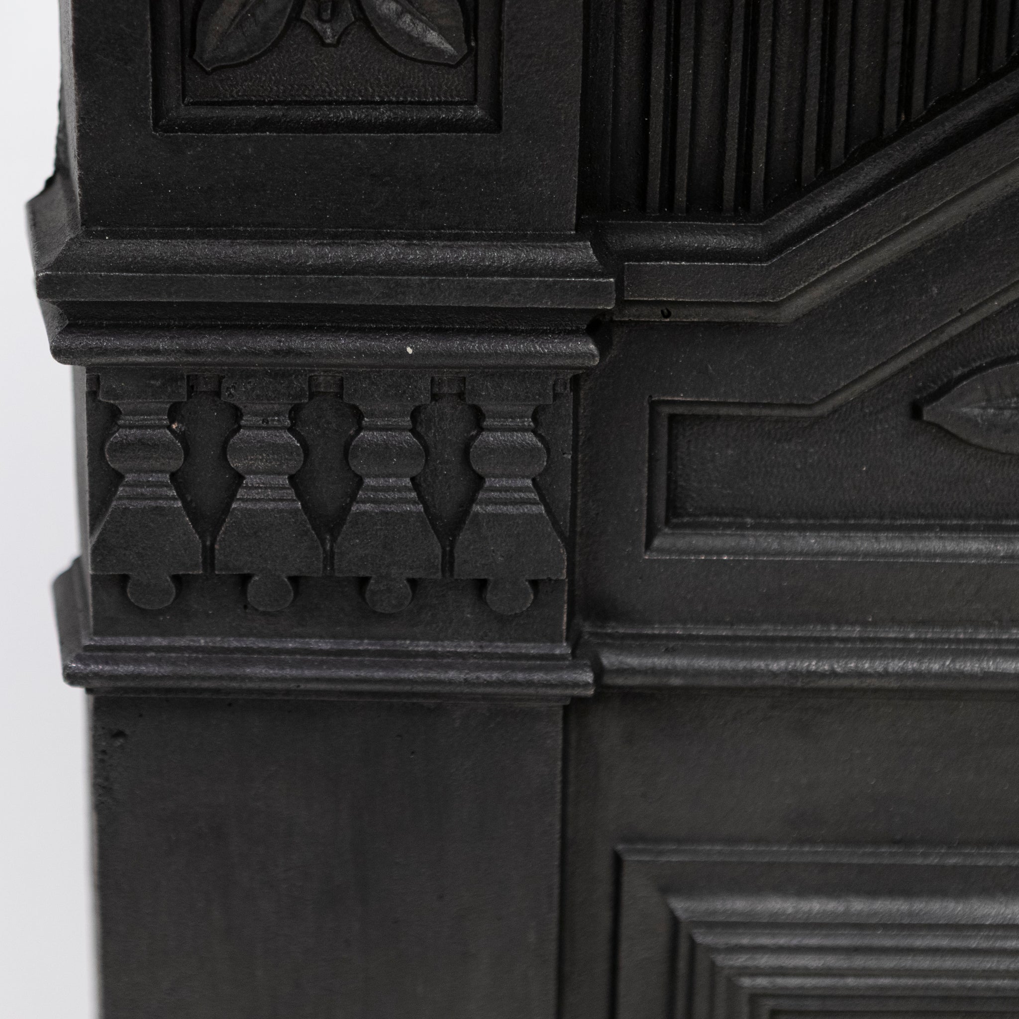 An antique cast iron combination fireplace featuring a triptych of daisy motifs above the hood, with an integral three-bar basket.