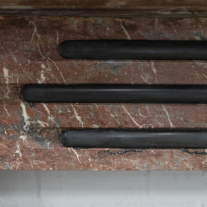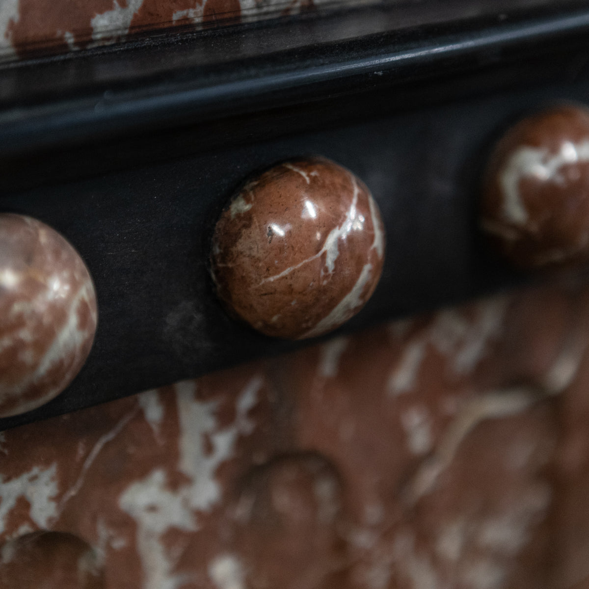 The thumbnail details run down the jambs are accentuated and inlaid with deep profile Belgian Black marble. The black marble inlay is also echoed through the lintel and flanked by a black marble floral motif that rests at the top of each jamb.
