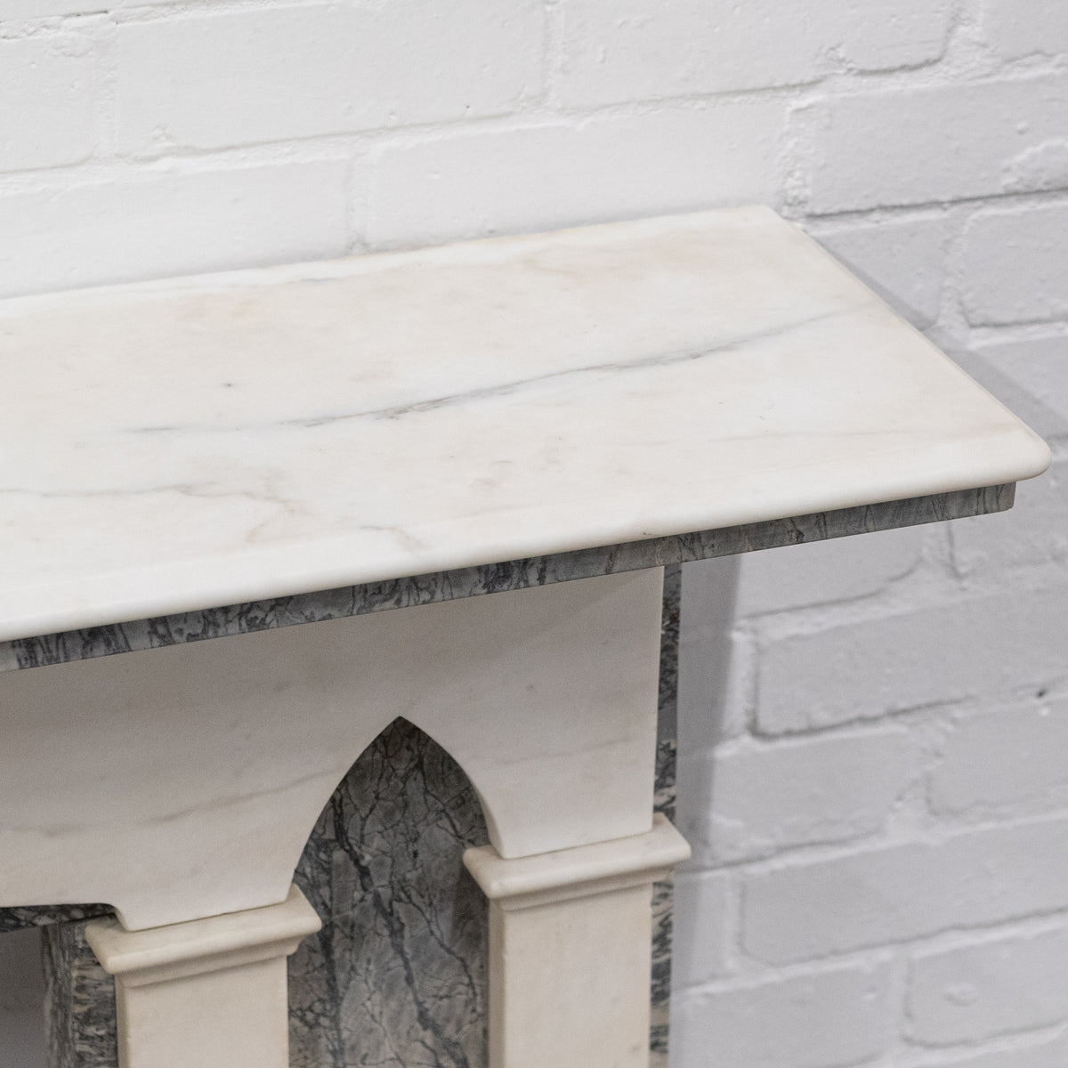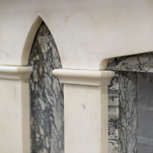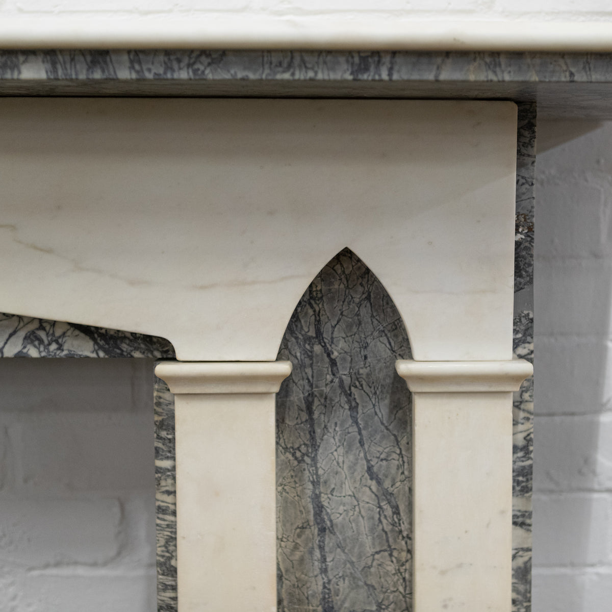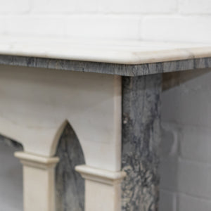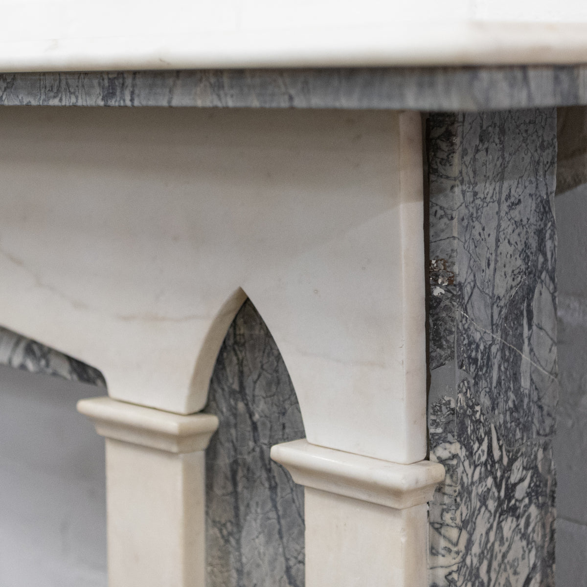 This antique piece is crafted from fine Grey Bardiglio Marble overlayed with a striking Statuary marble. A very handsome piece that has pointed gothic arches to the top of each jamb and central lintel. The unique chimneypiece has an elegant bevelled shelf that also teams the two marble types together.