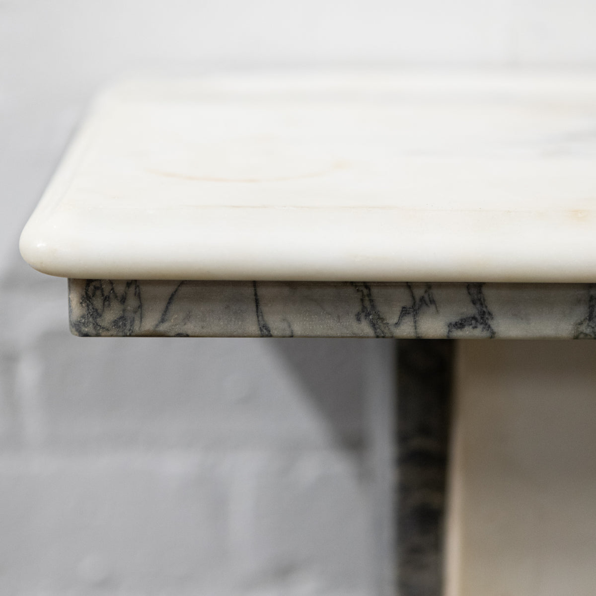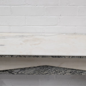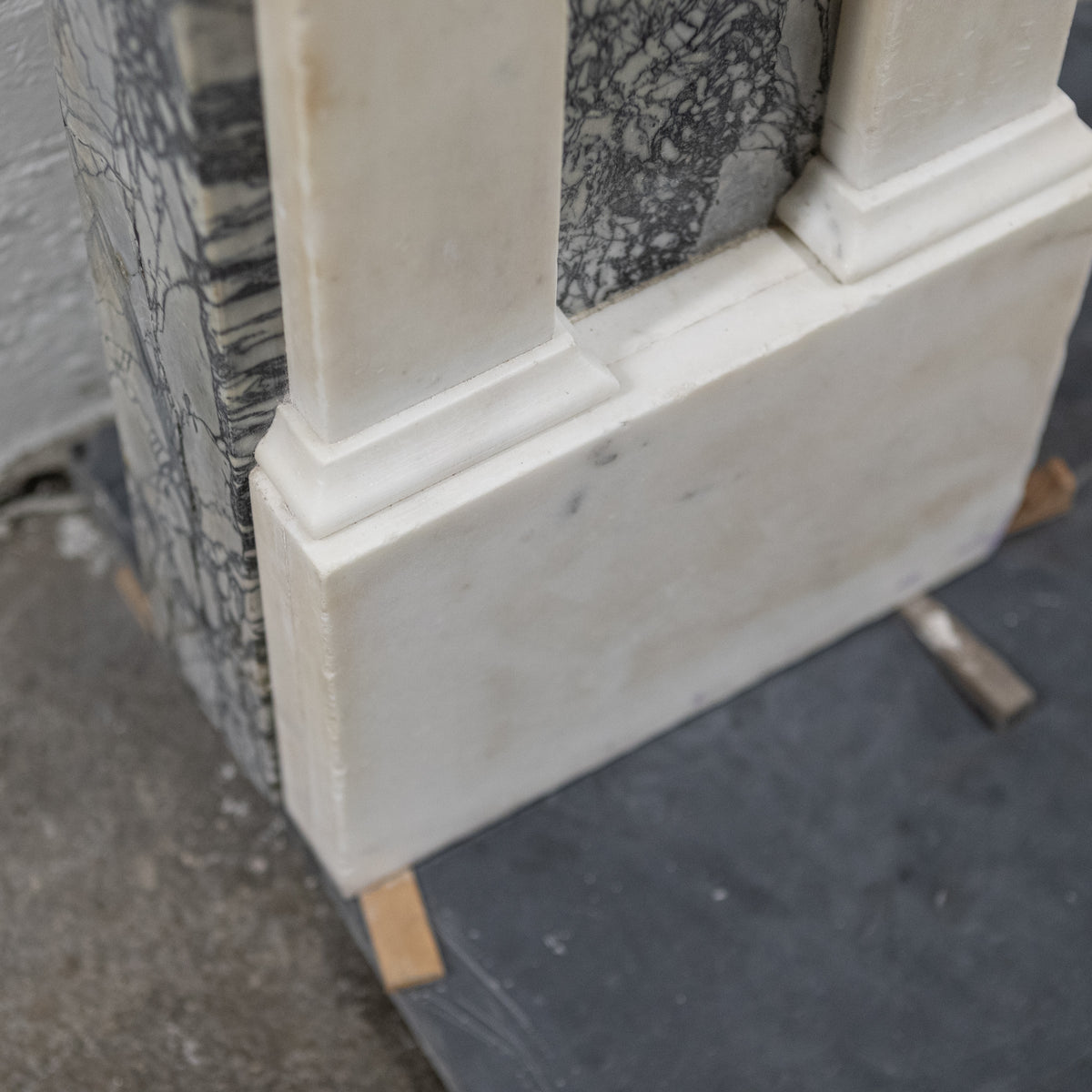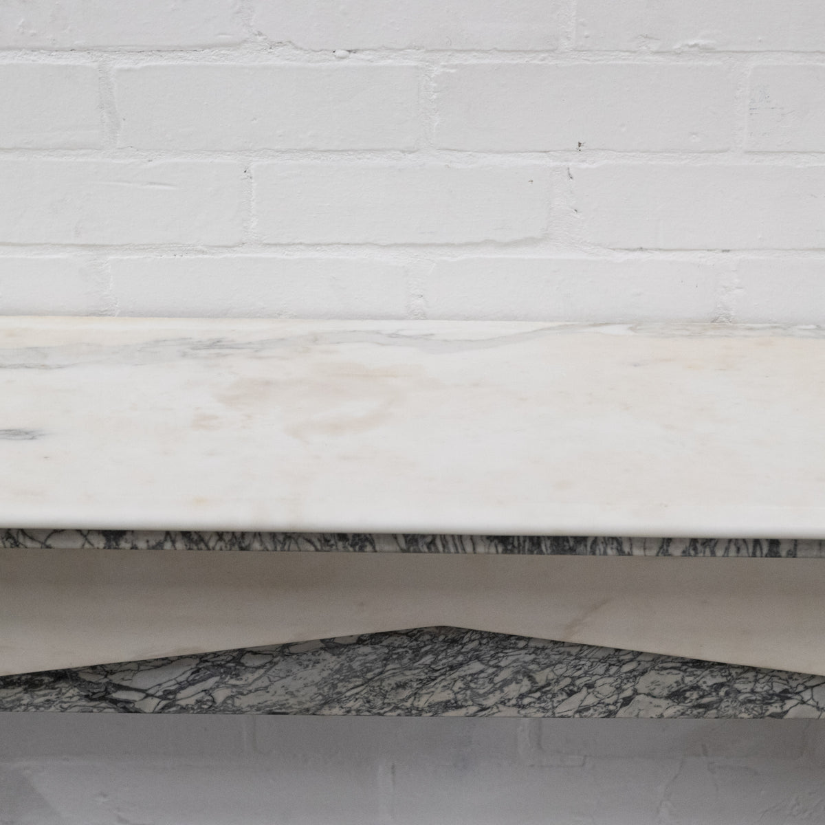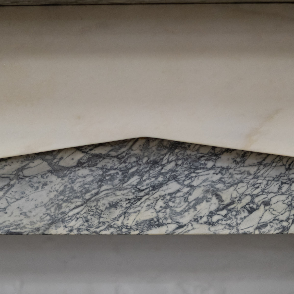 This antique piece is crafted from fine Grey Bardiglio Marble overlayed with a striking Statuary marble. A very handsome piece that has pointed gothic arches to the top of each jamb and central lintel. The unique chimneypiece has an elegant bevelled shelf that also teams the two marble types together.