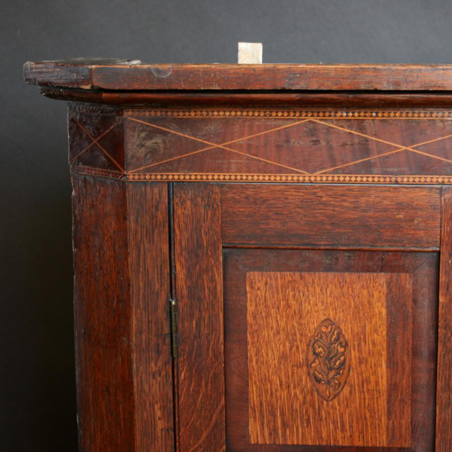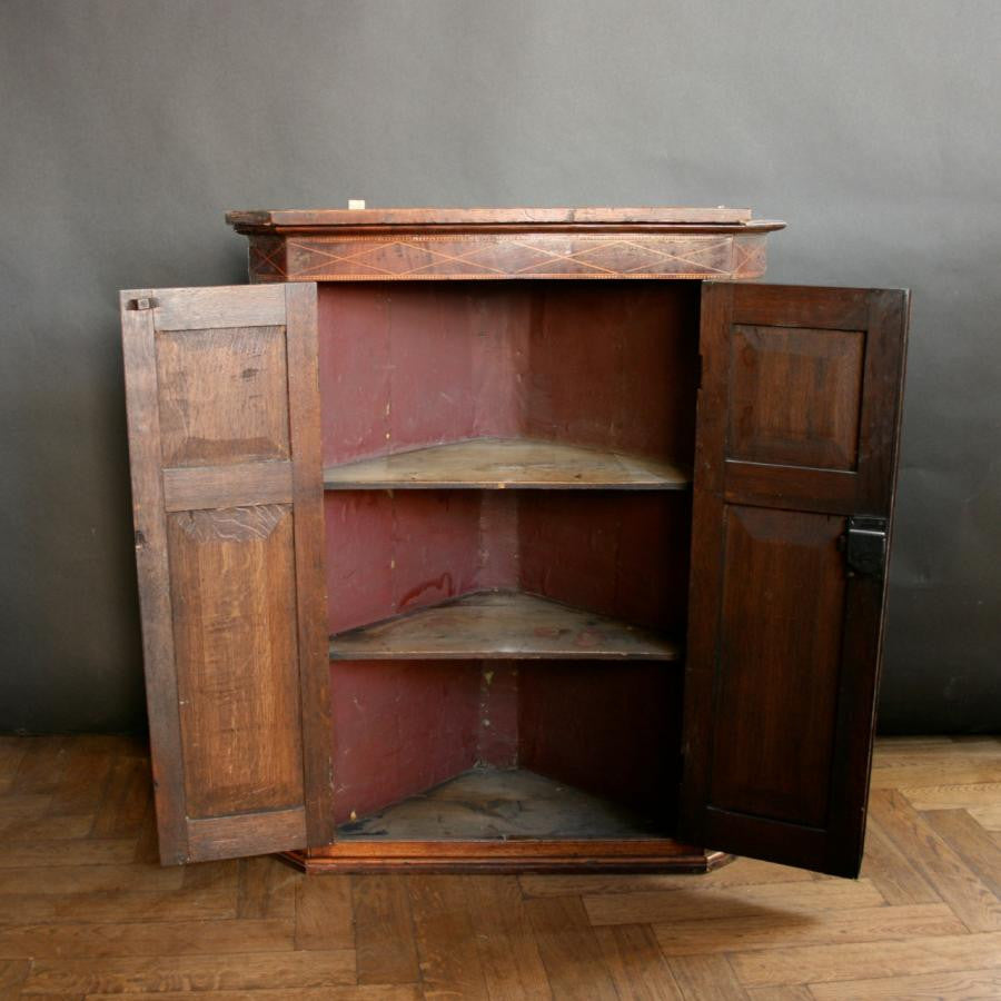 An antique Georgian corner wall cabinet in oak. Behind double doors, this wonderfully original piece of furniture contains three shelves. A central flower motif is displayed in each of the reeded door panels, whilst cross band detailing is featured across the top of this piece.