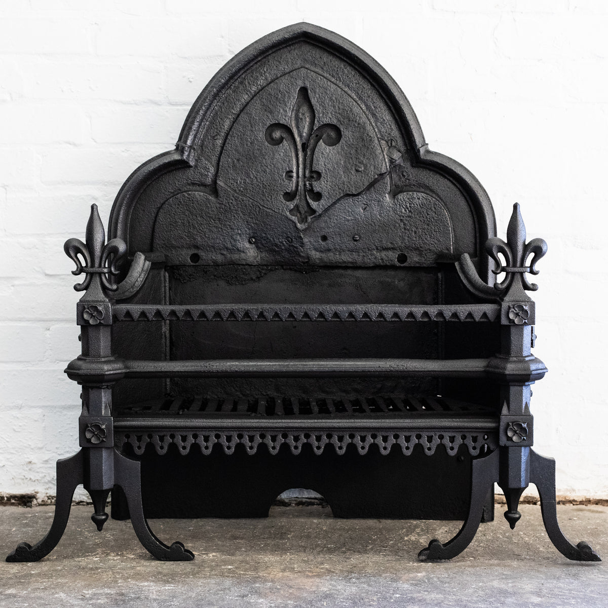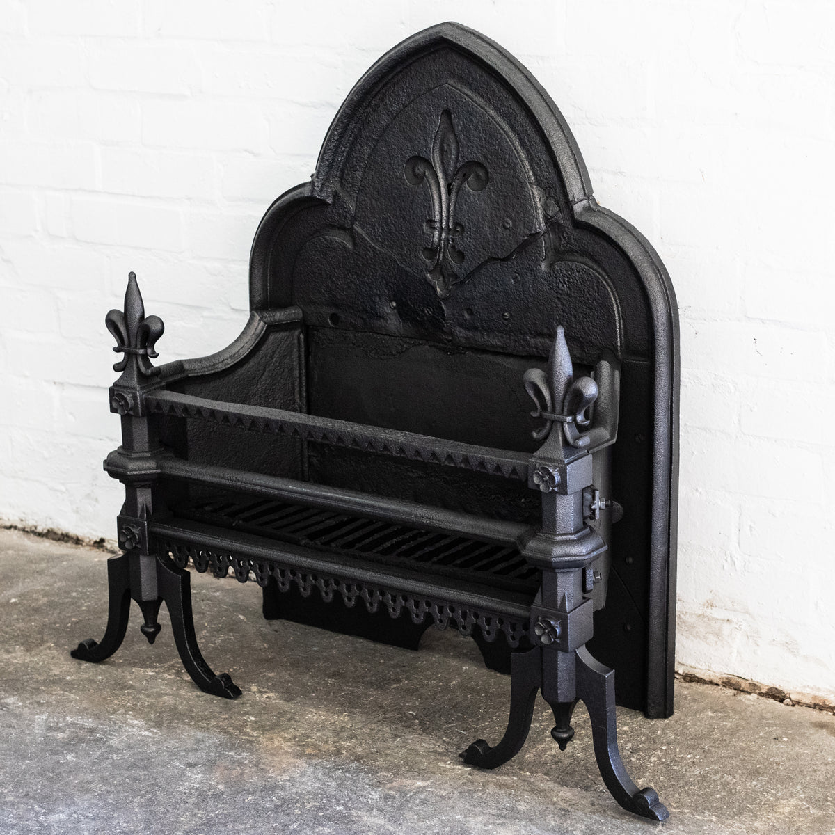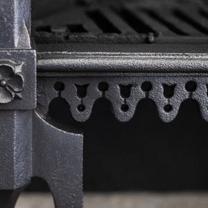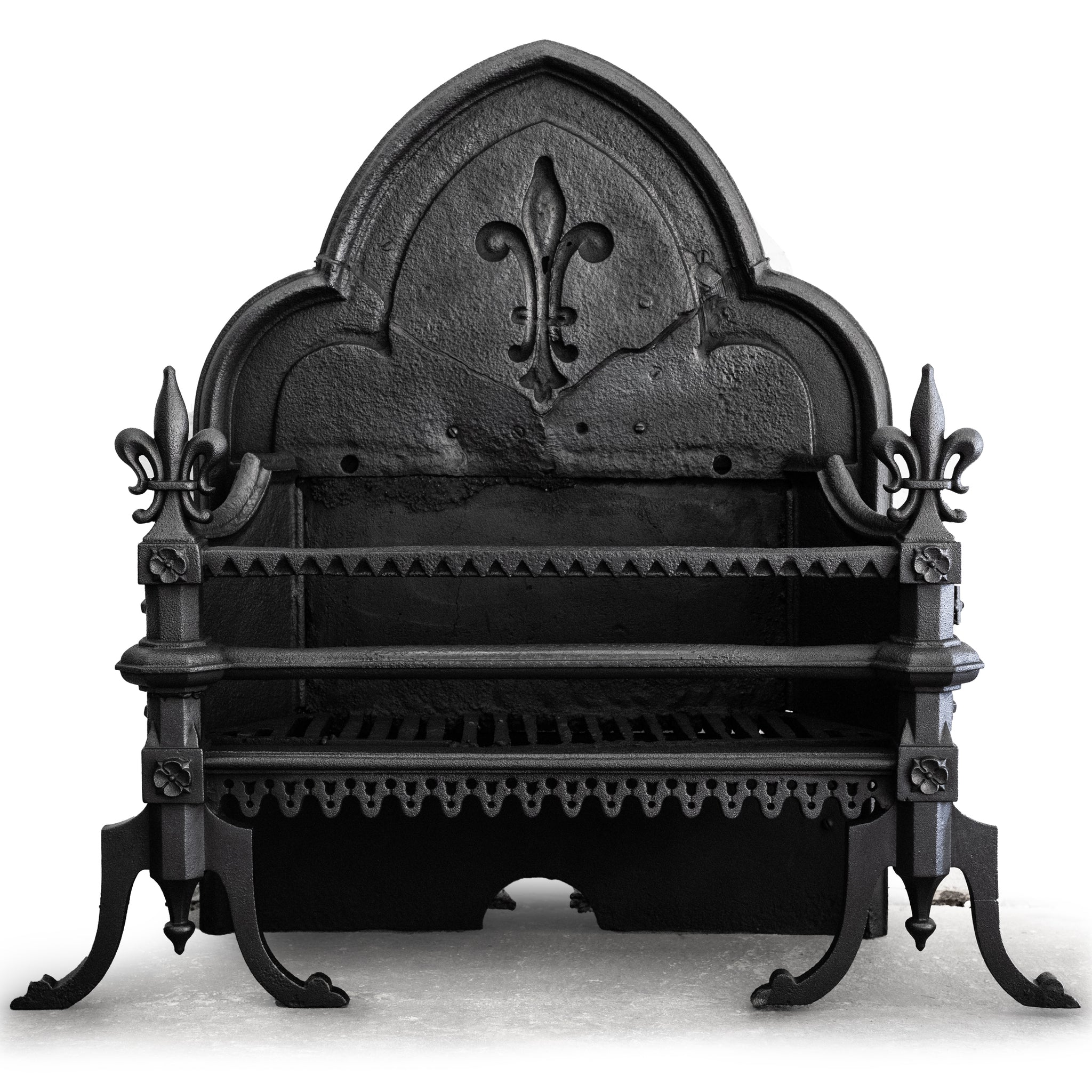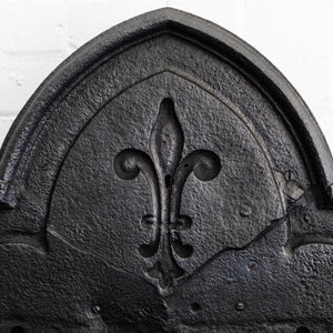 This large Gothic Revival cast iron fire basket has a high double-arched fireback with ornate period details throughout.