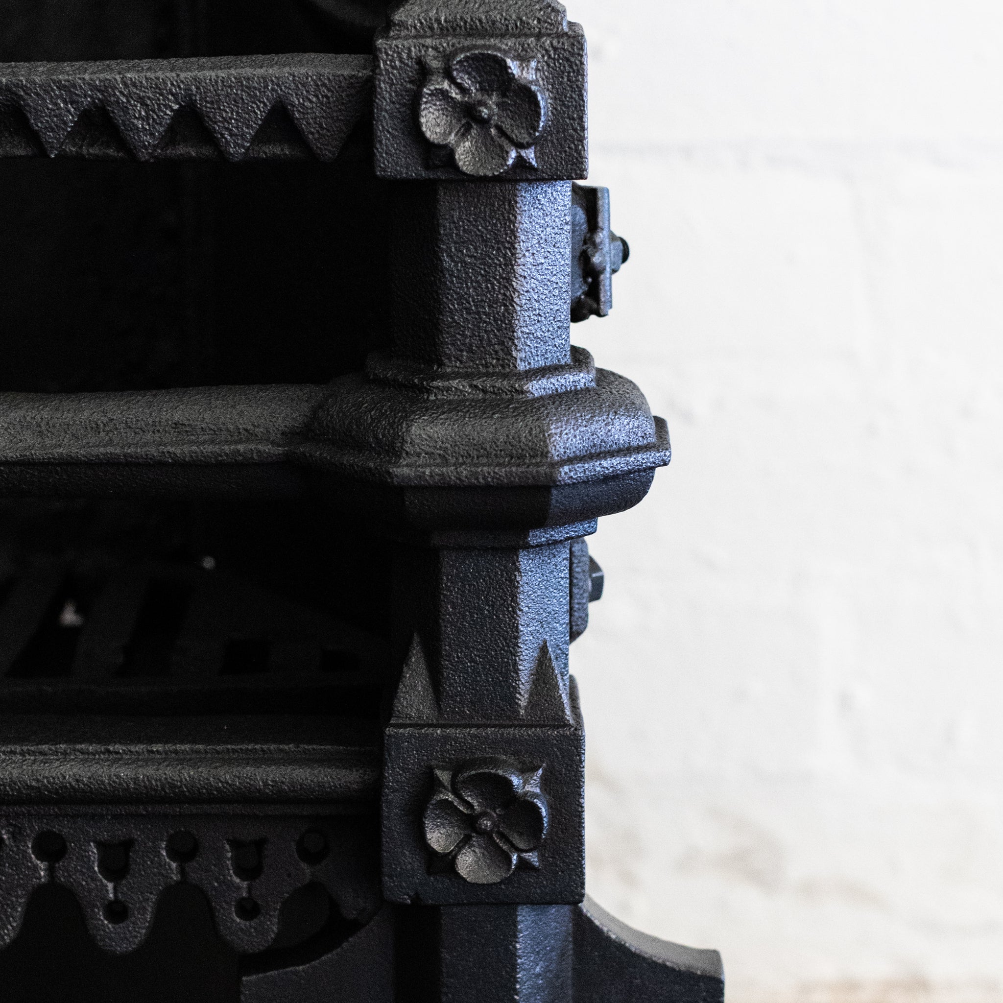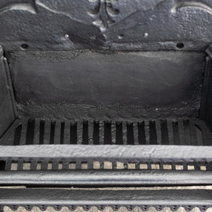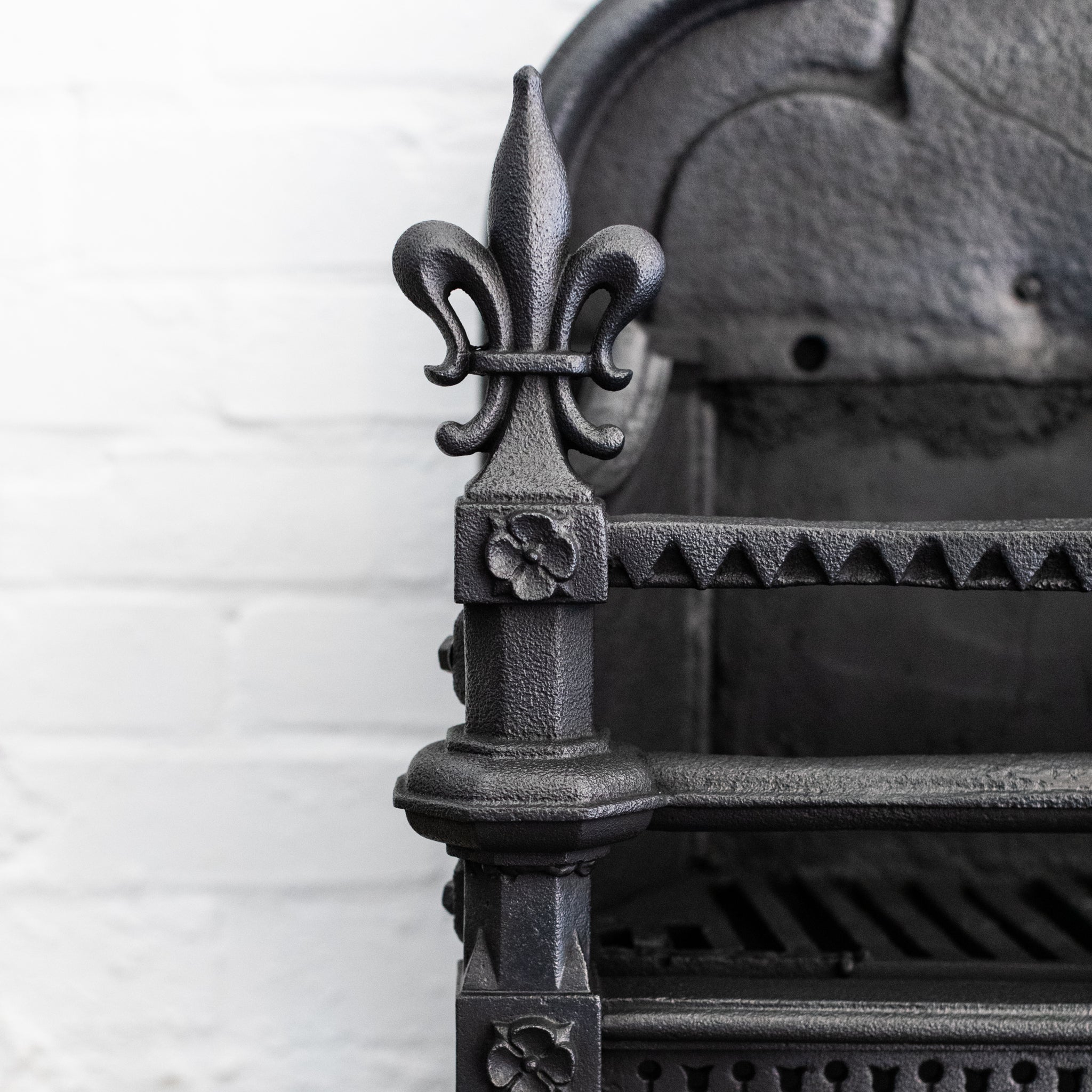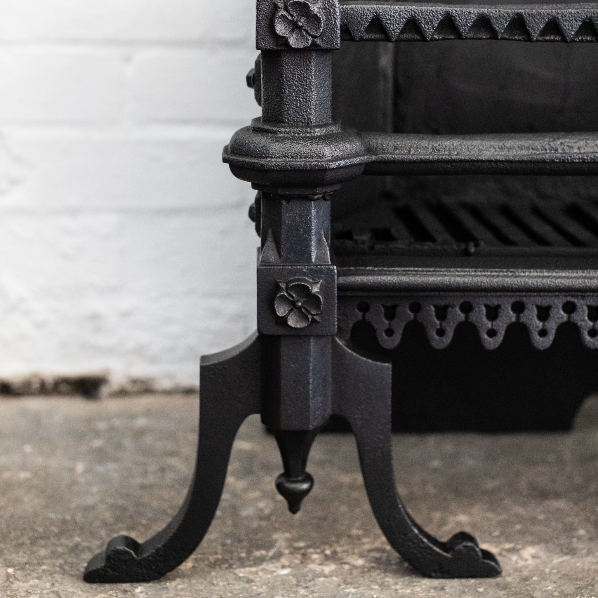 This large Gothic Revival cast iron fire basket has a high double-arched fireback with ornate period details throughout.