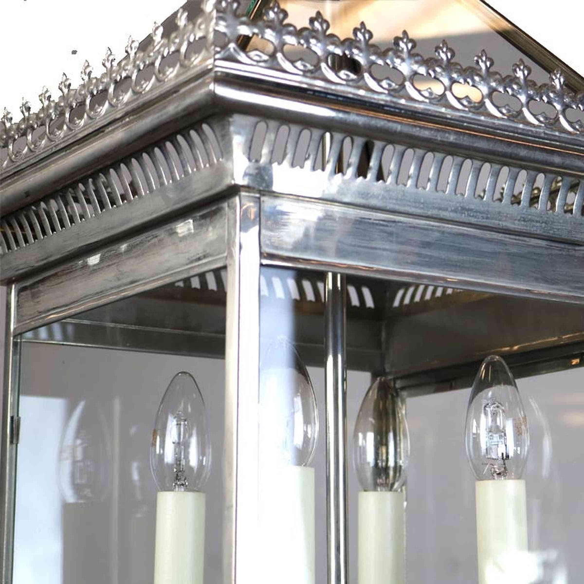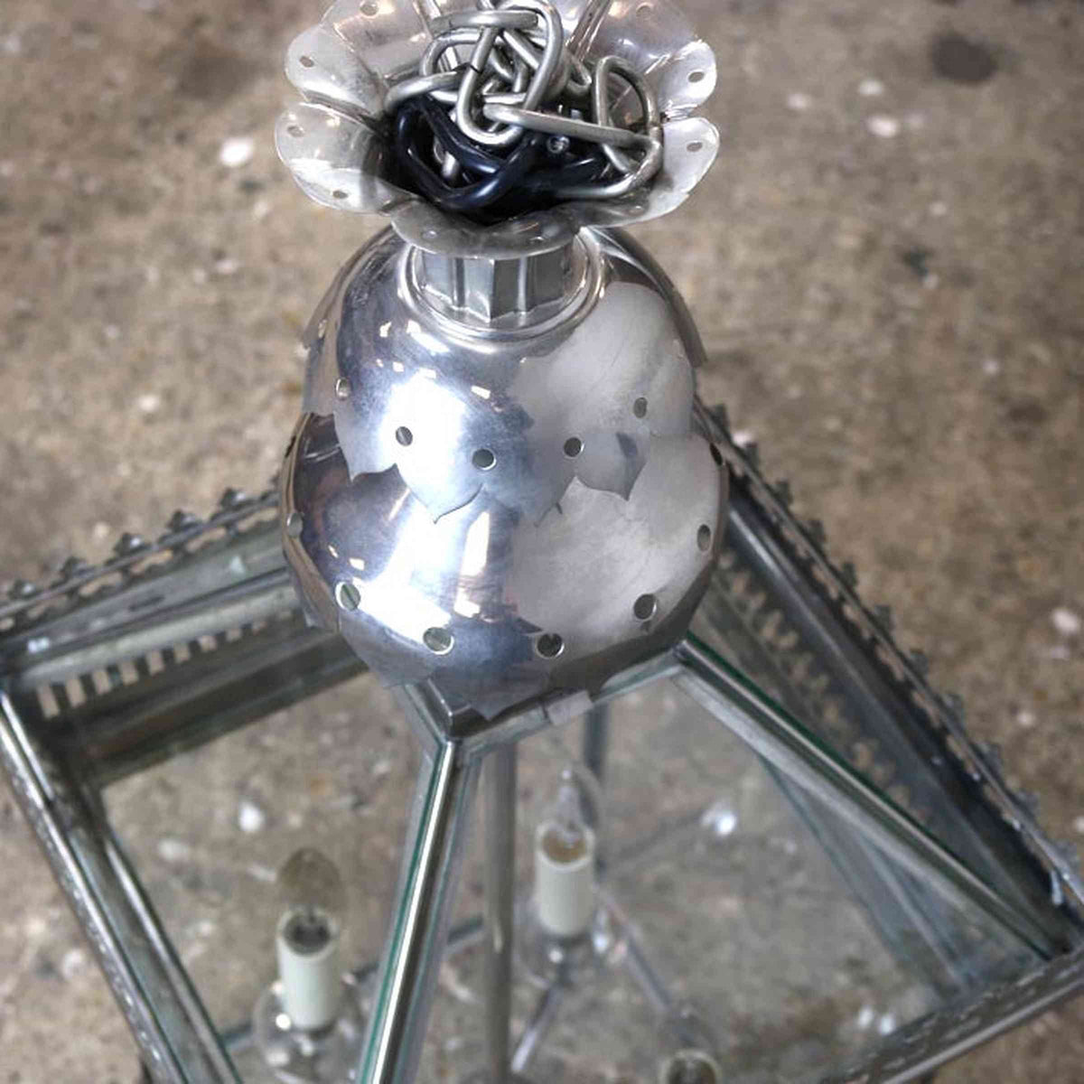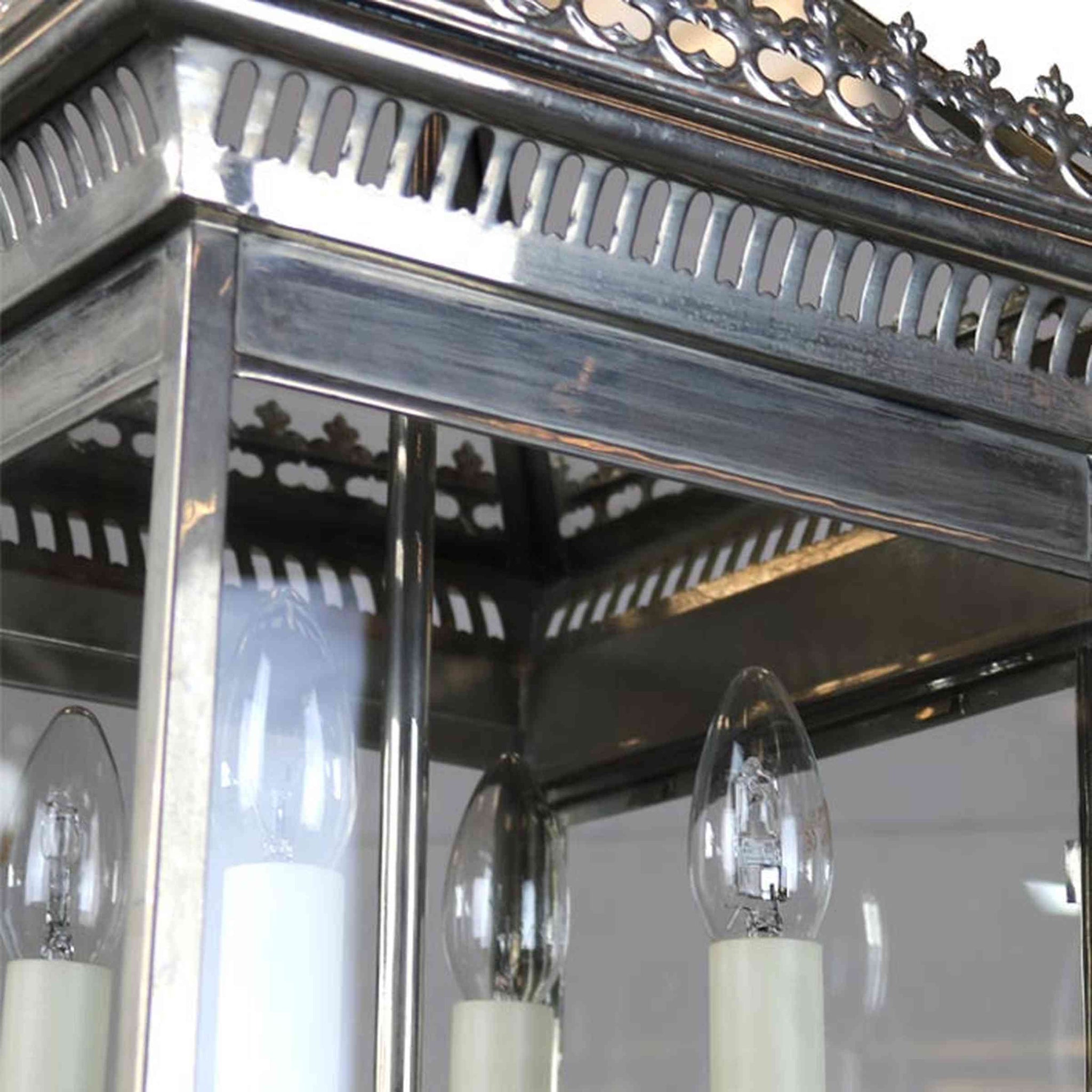 A reclaimed chrome and glass lantern, gothic in style with candle bulb holders and spearhead detailing.