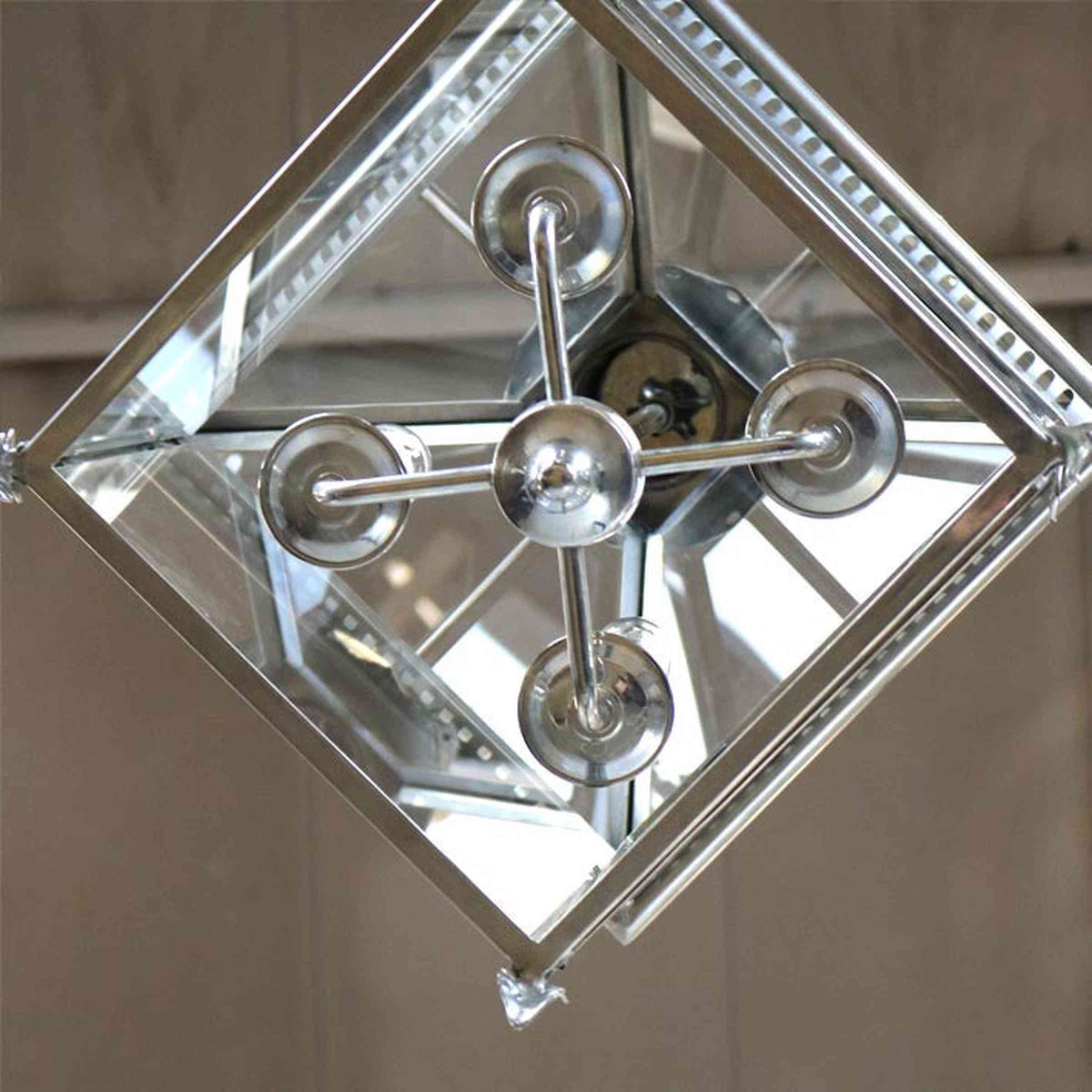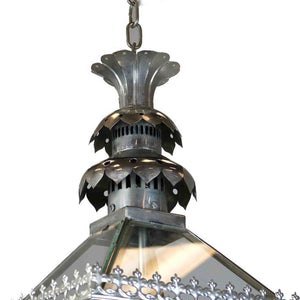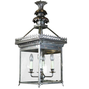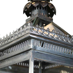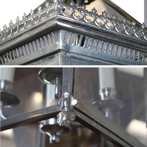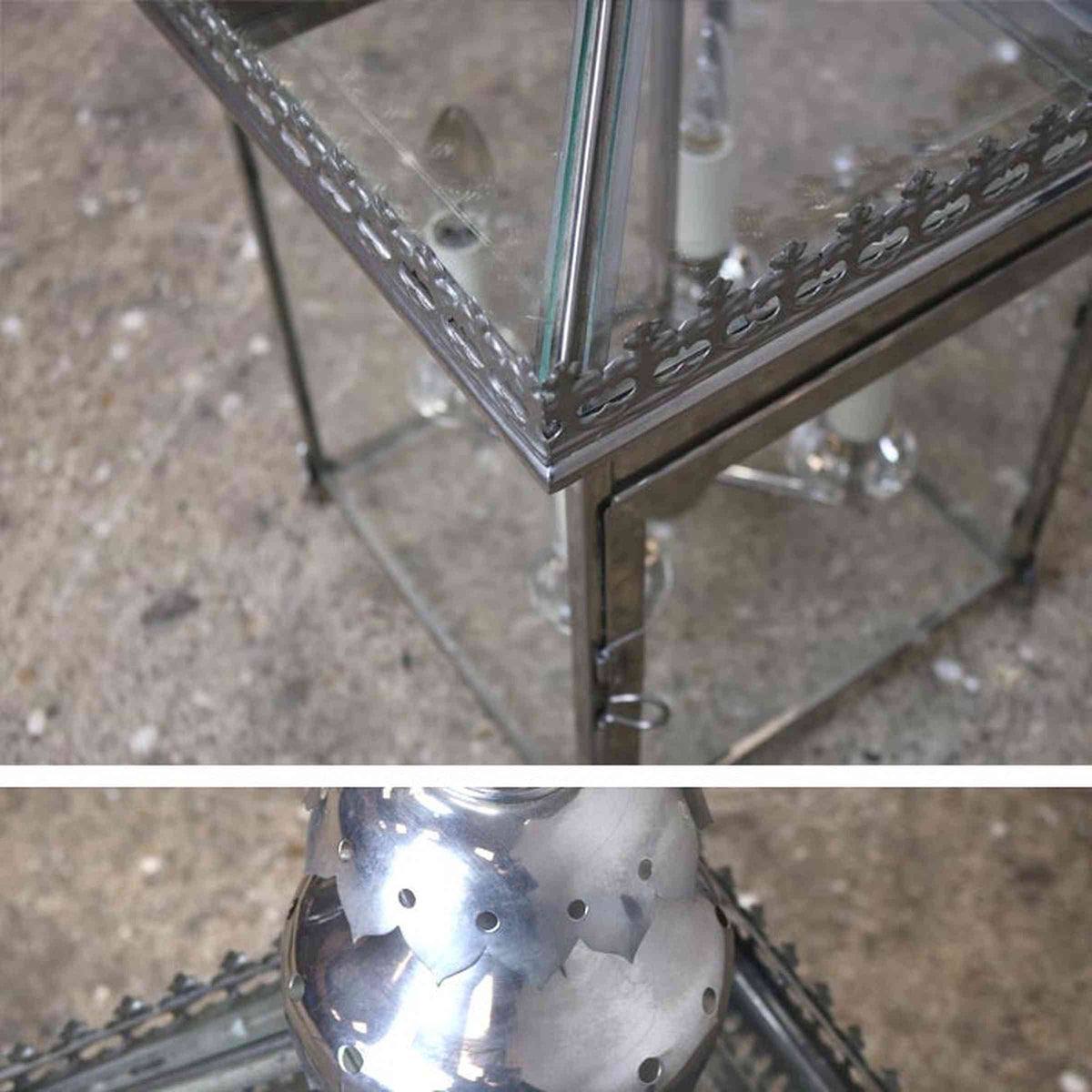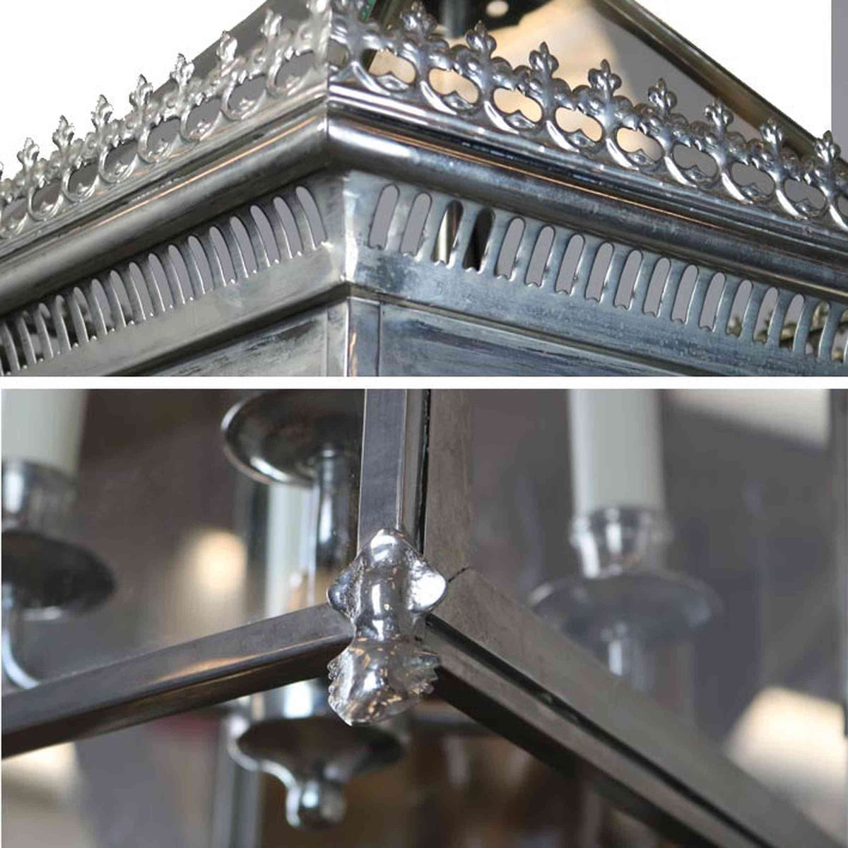 A reclaimed chrome and glass lantern, gothic in style with candle bulb holders and spearhead detailing.