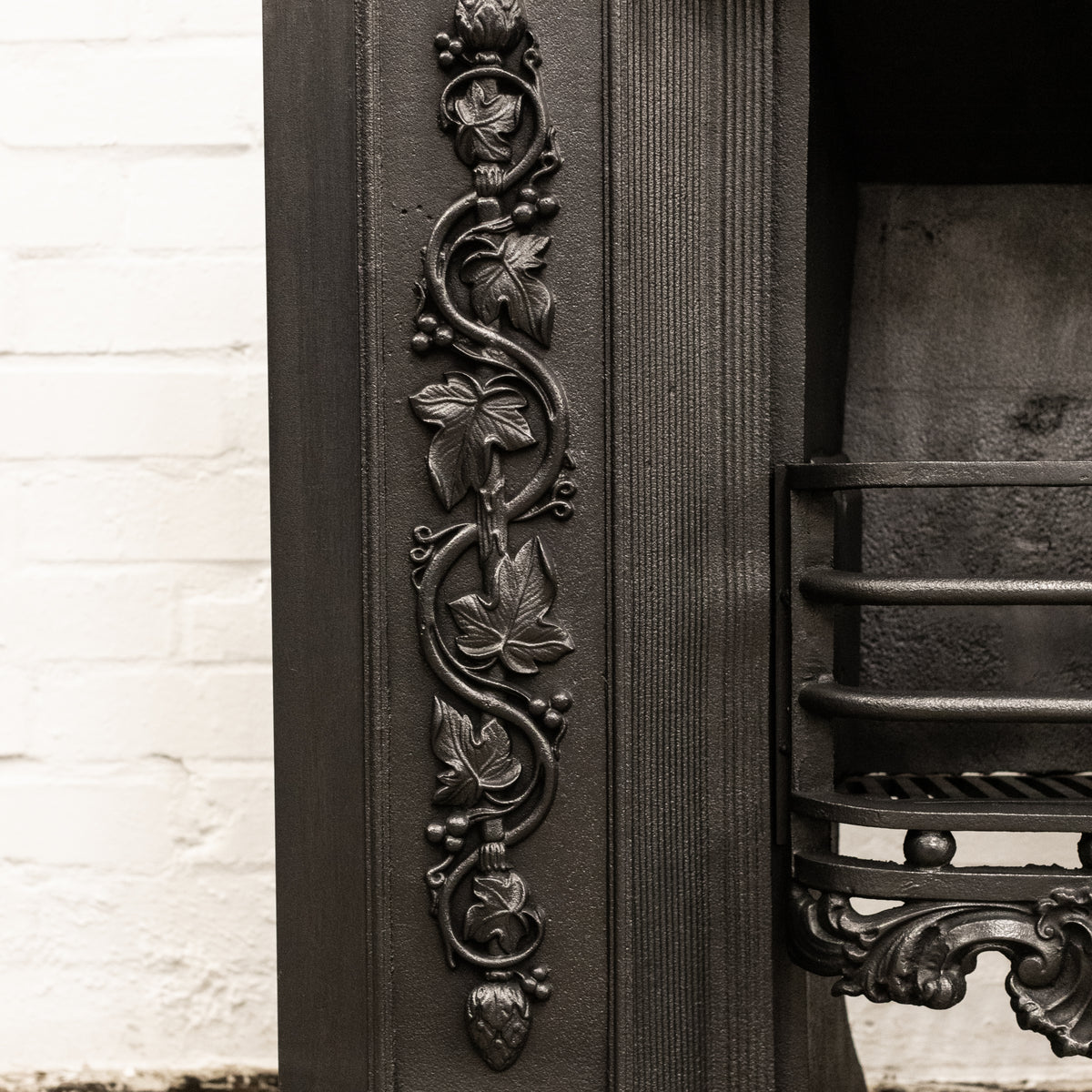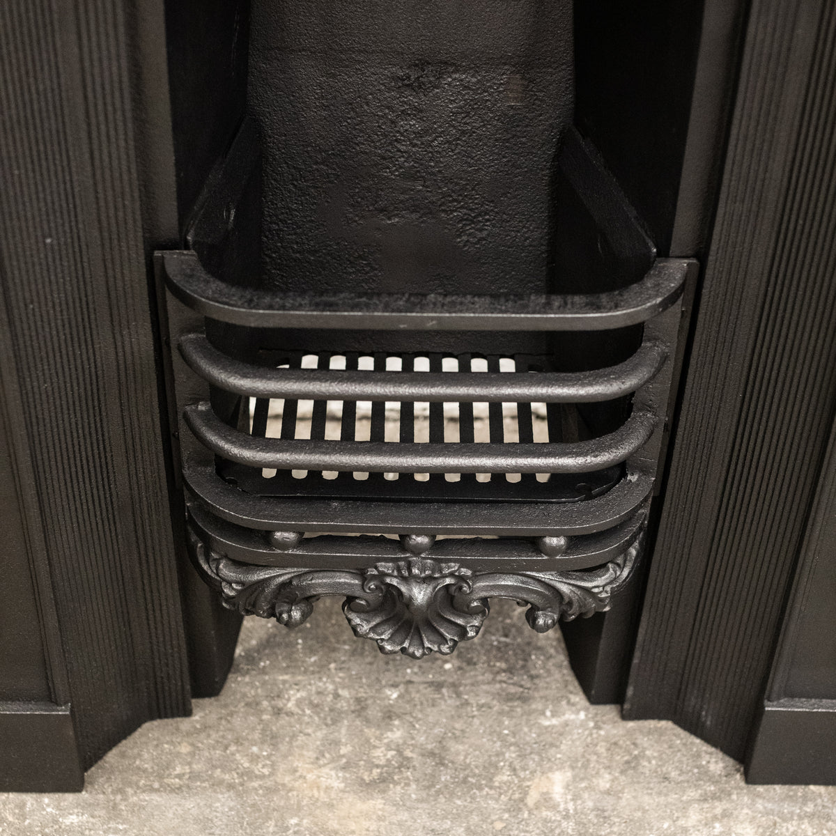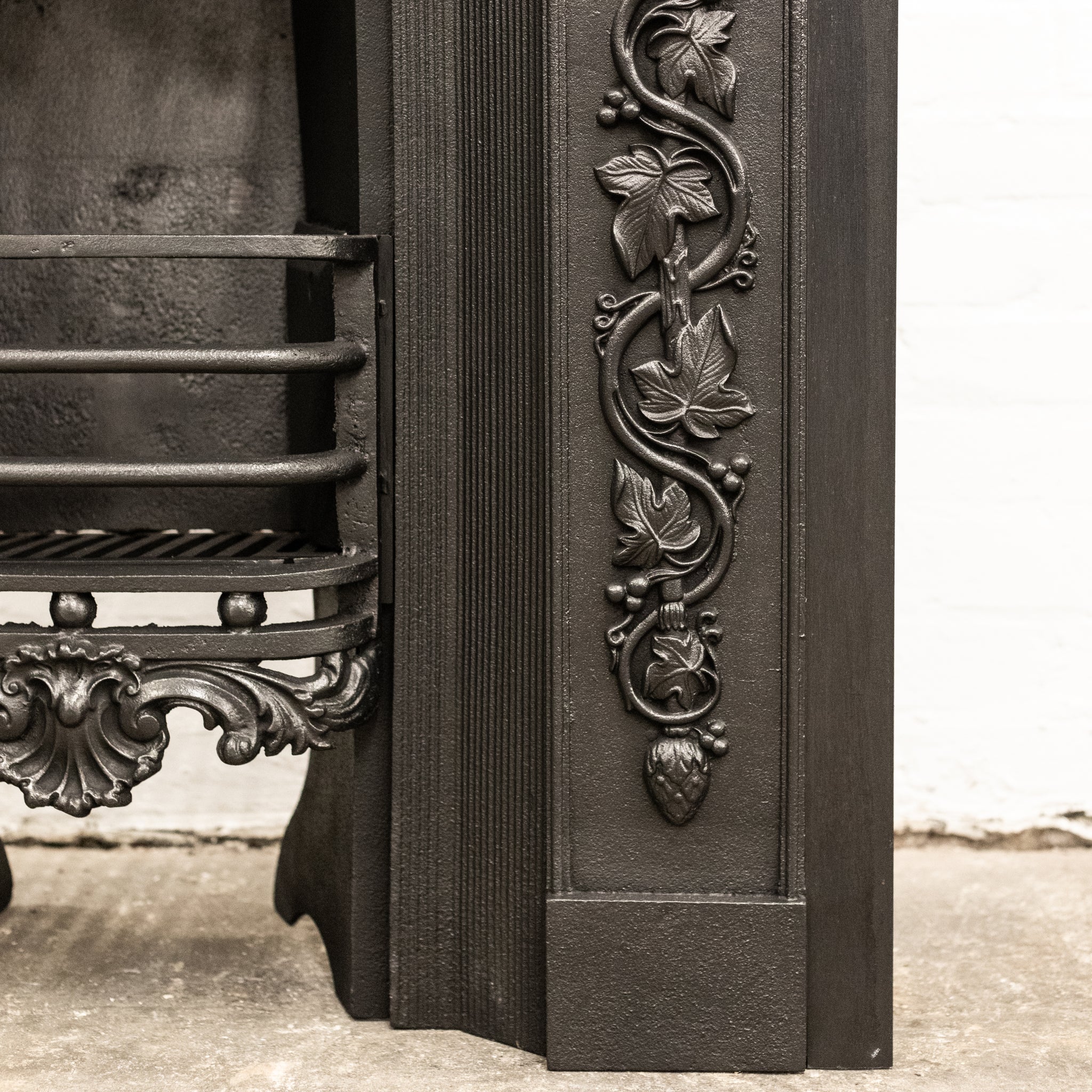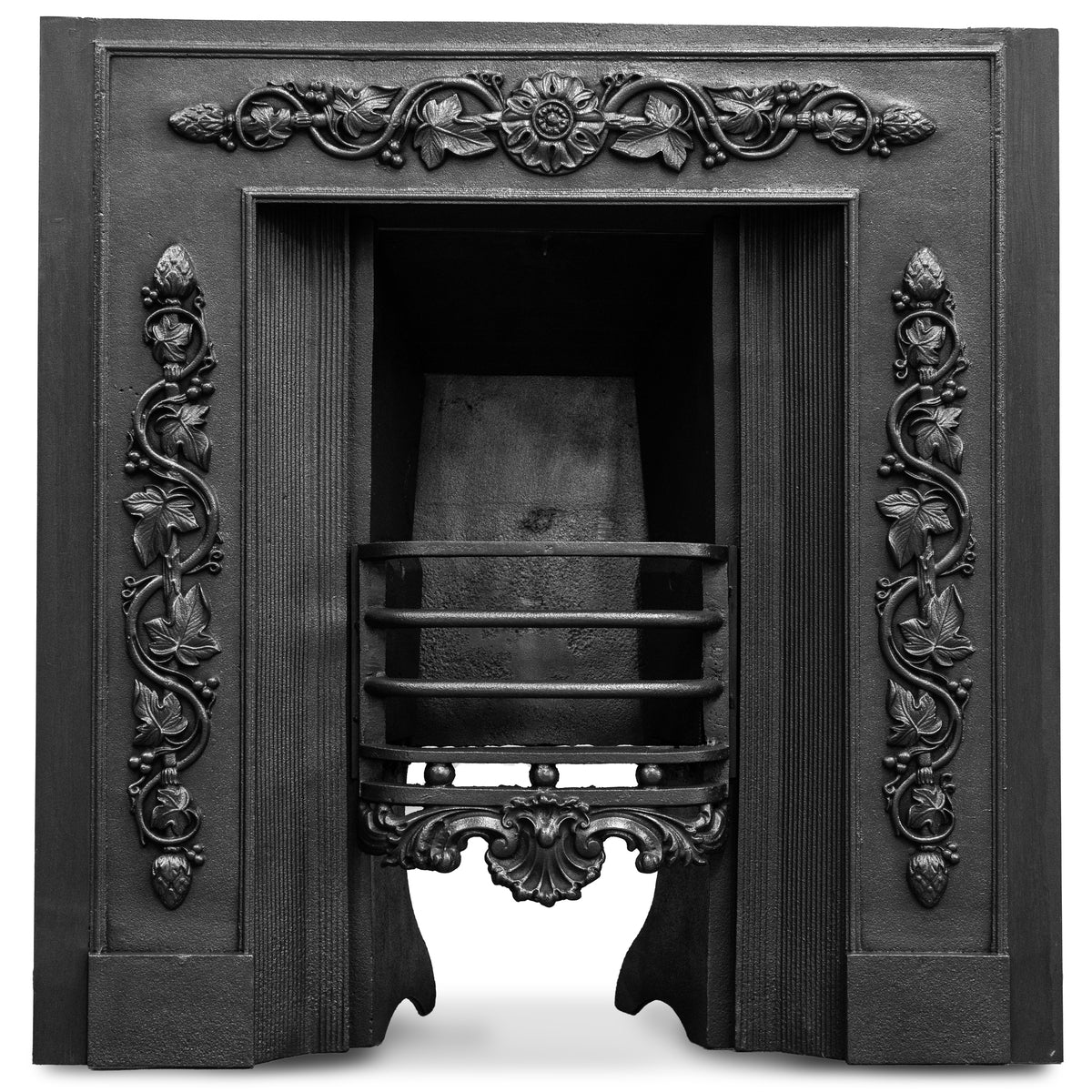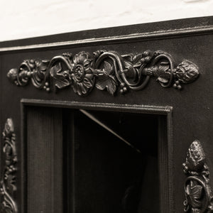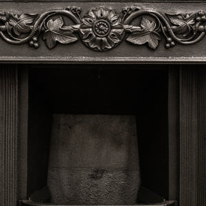 The original fireplace insert features decorative top and side panels of flowing foliates and florals, there is also ornate detailing to the base of the basket.