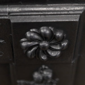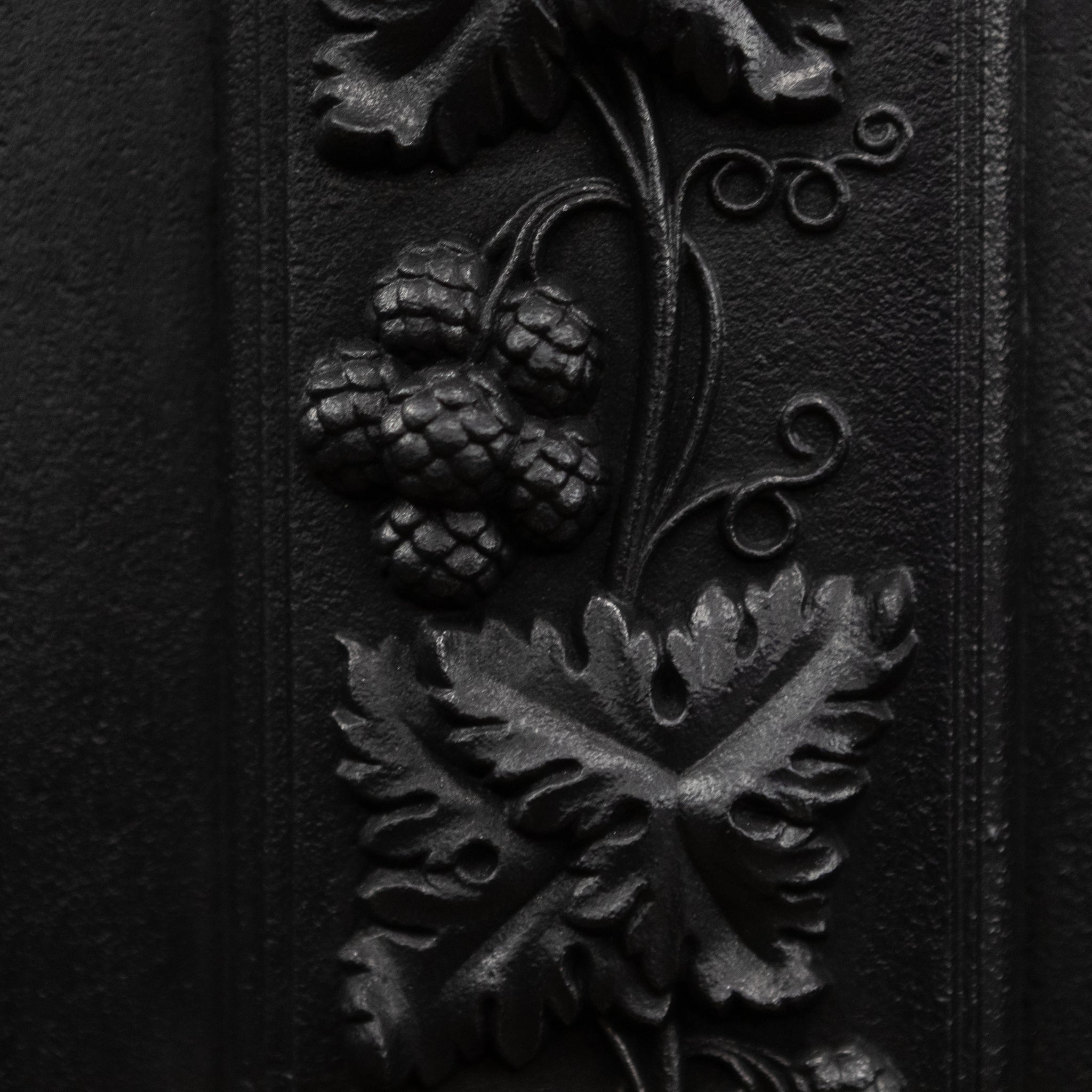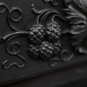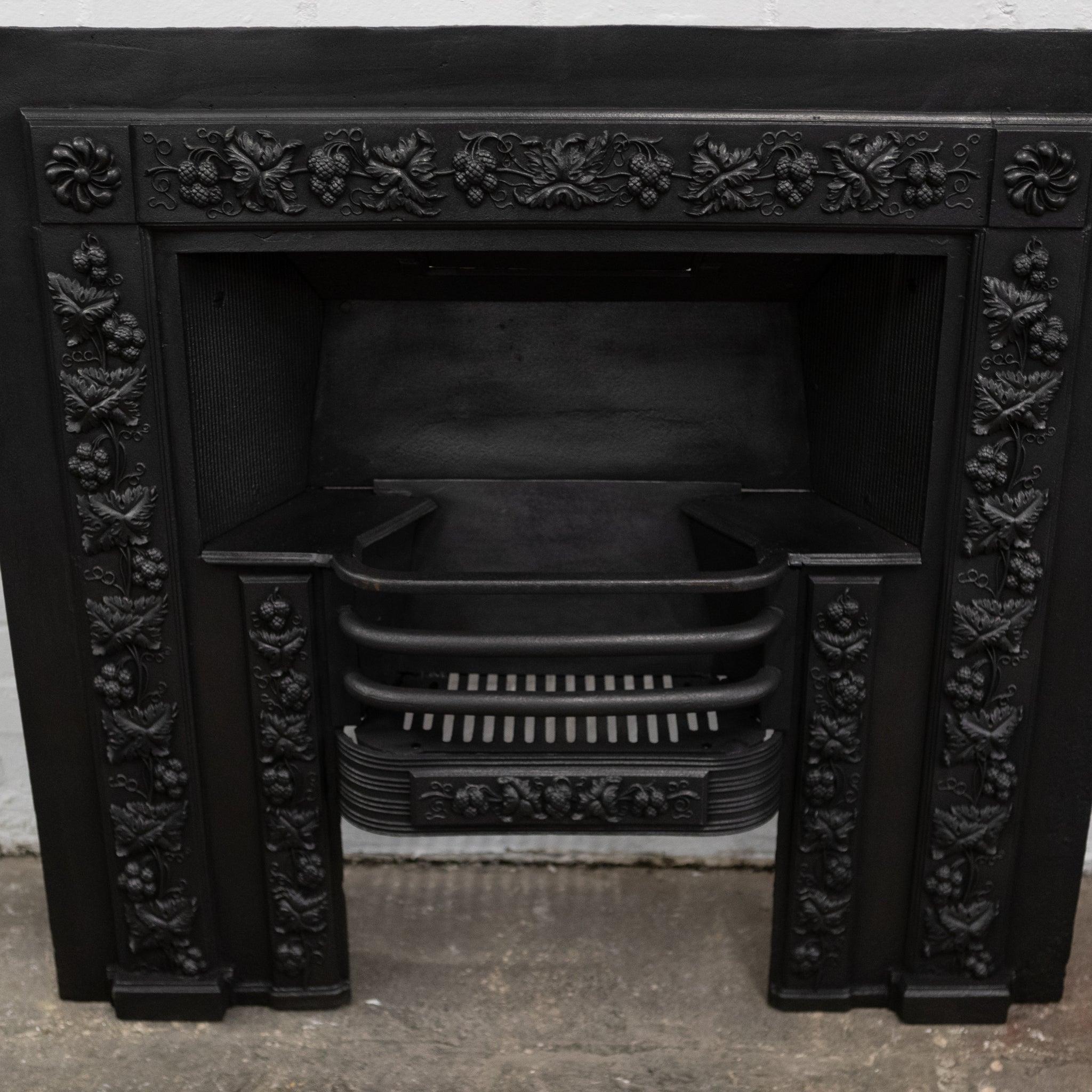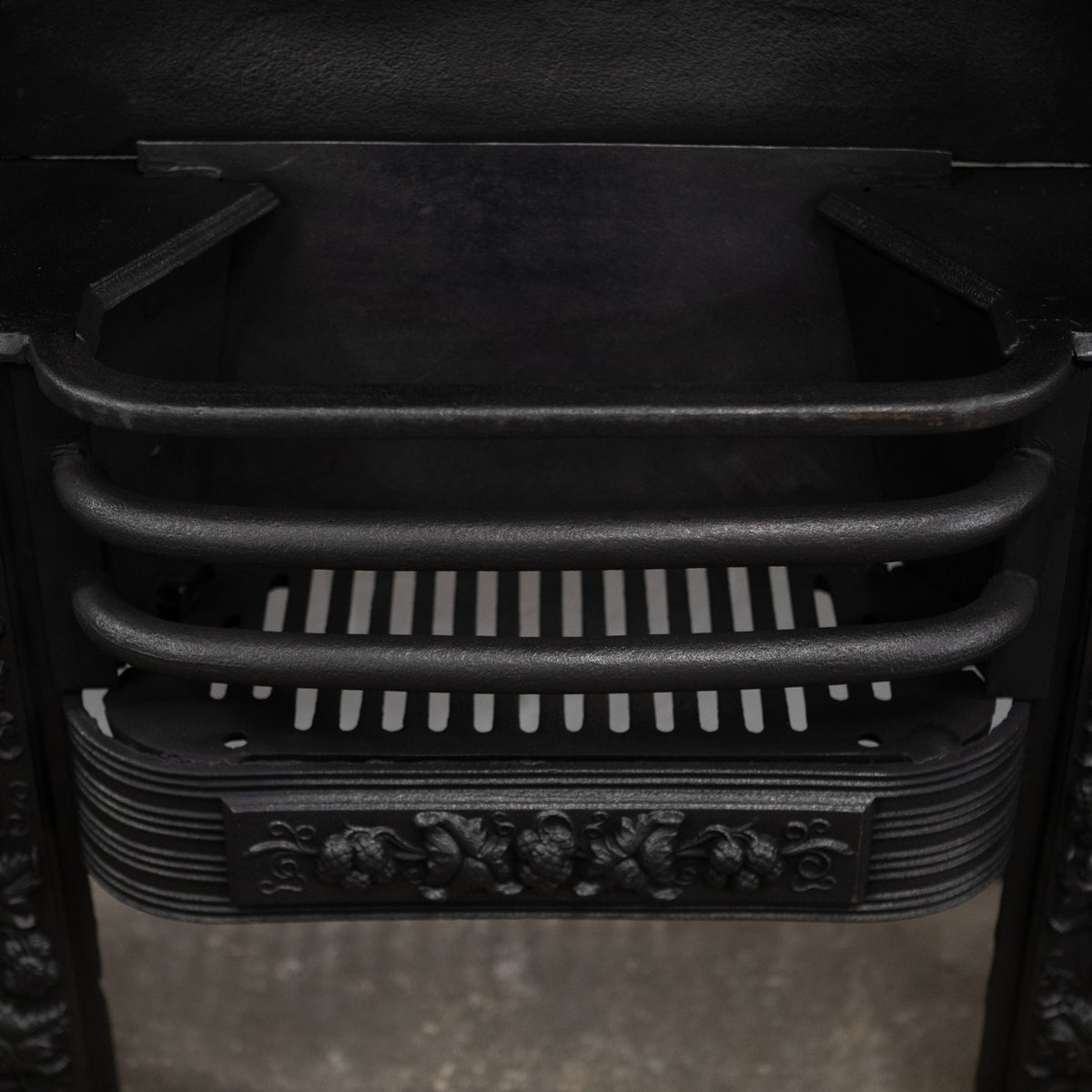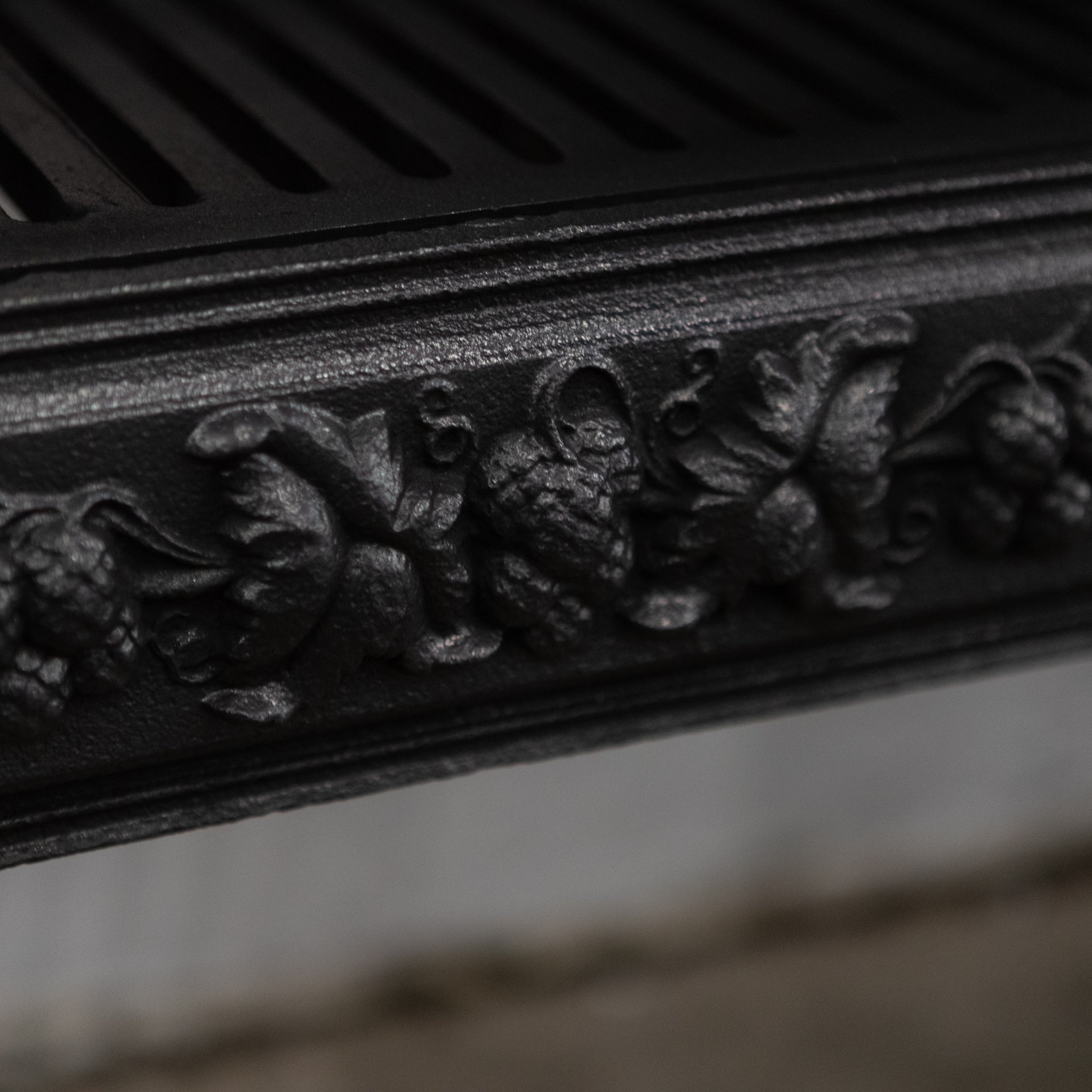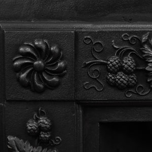 Adorned with cast iron floral and fruit motifs, the hob grate offers a very grand chimneypiece feature. These charming flamboyant designs are typical of the Regency period The 3 bar integral basket also has wonderful detailing to the base.