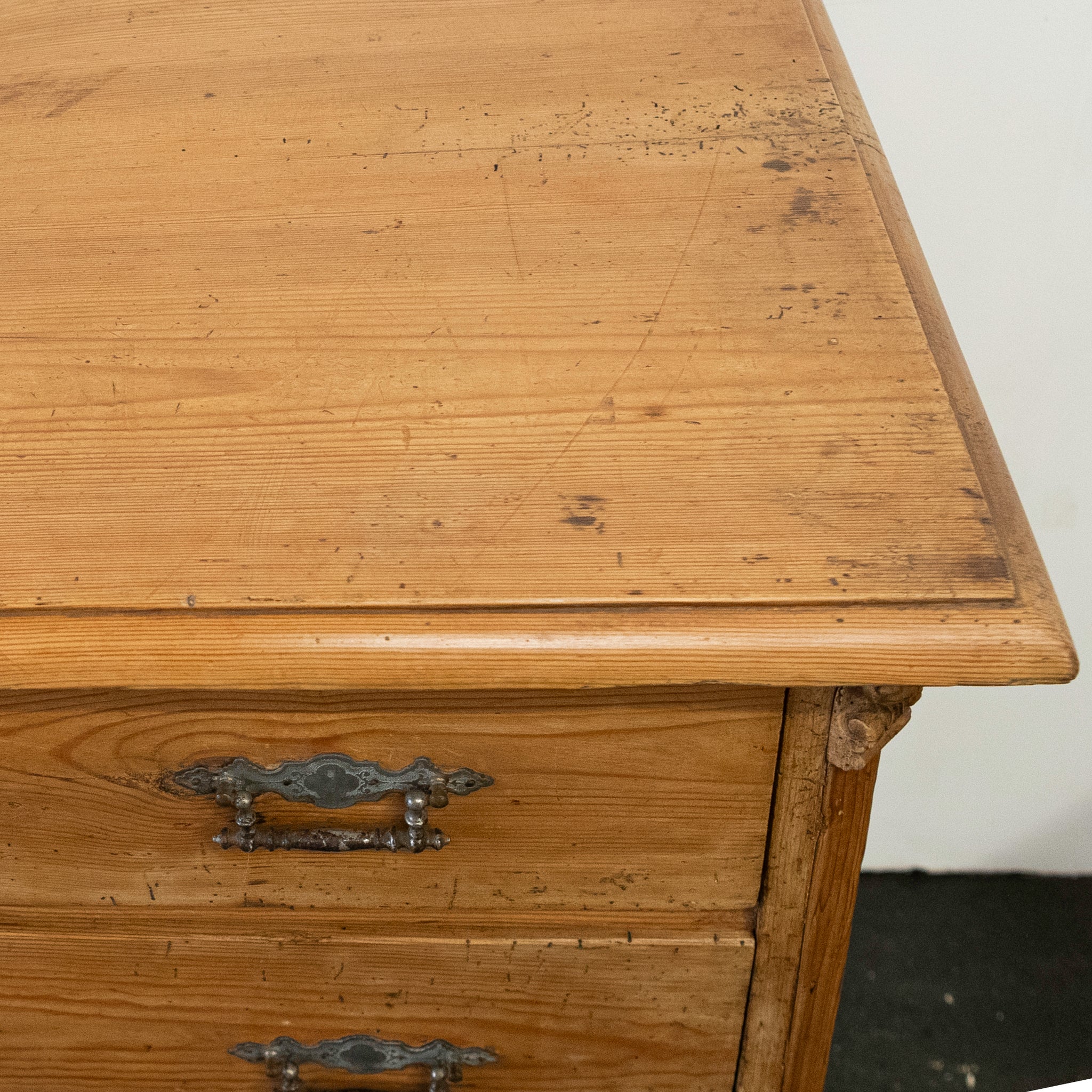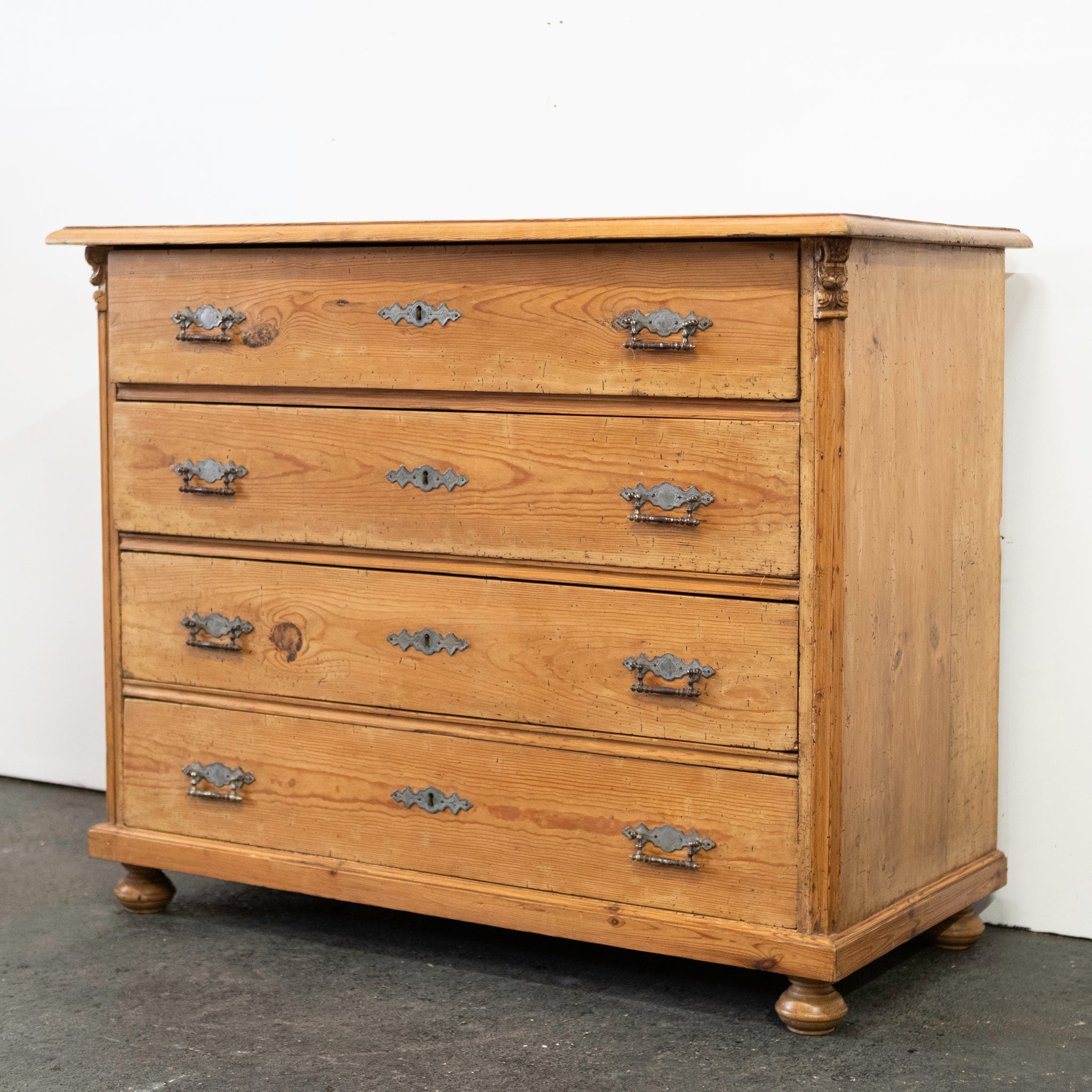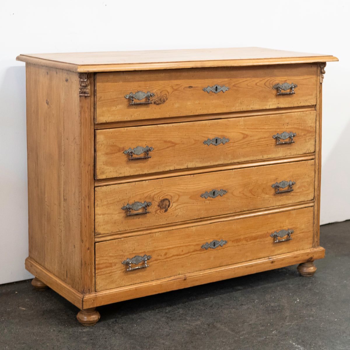 The antique solid pine chest consists of 4 drawers with orignal metal hardware intact, the Continental piece provides an ample storage solution. Flanked with finely carved corbels and resting on bun feet.