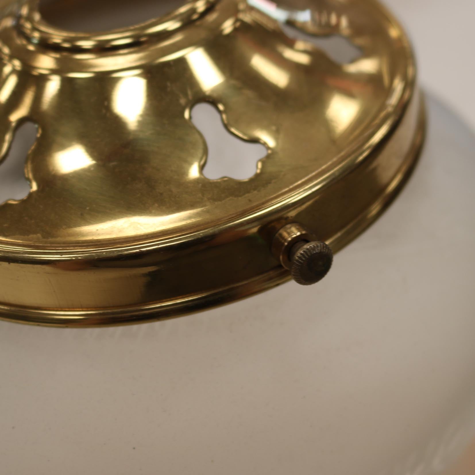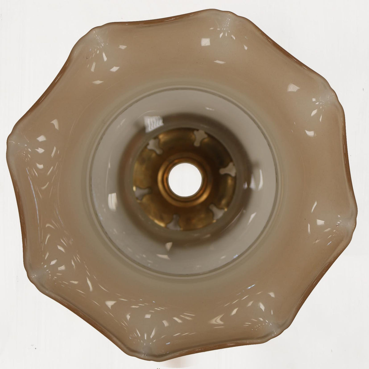 The petal shaped shades have etched surface decoration and are topped with a decorative fretted brass top ring.