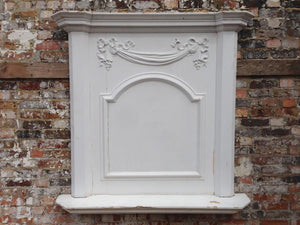 An antique Regency fireplace overmantel in painted pine. This elegant fireplace overmantel features a pair of bow and swag motifs, as well as a curved reeded panel.