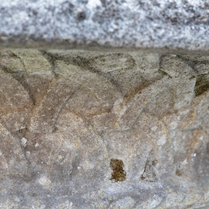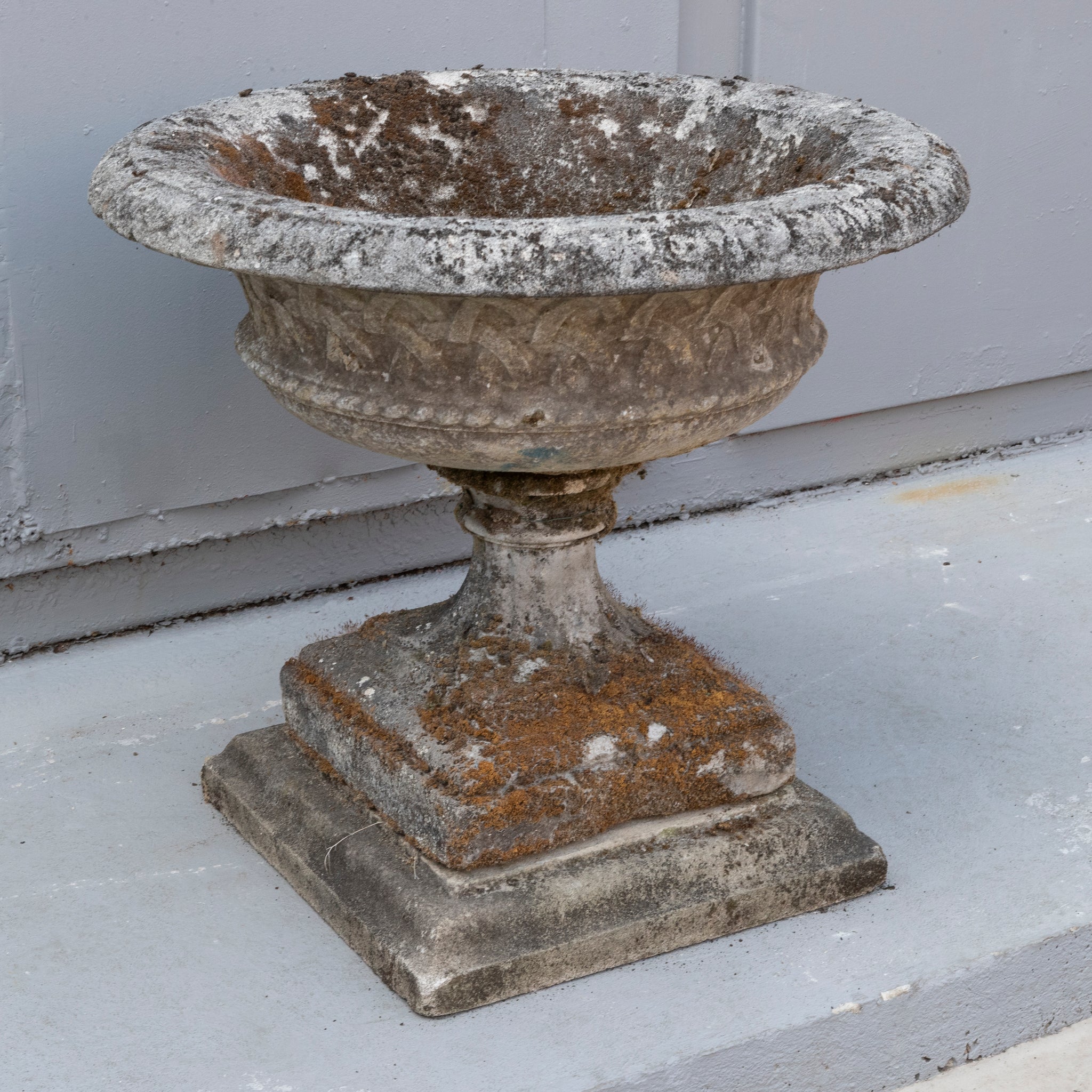 An antique reclaimed garden urn, the piece has a waisted shallow bowl with everted rim and trellis banding, leaf moulded socle and square base.