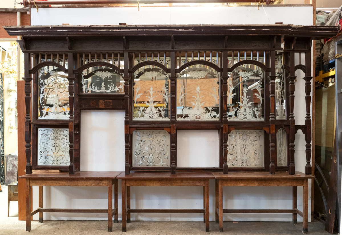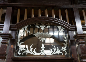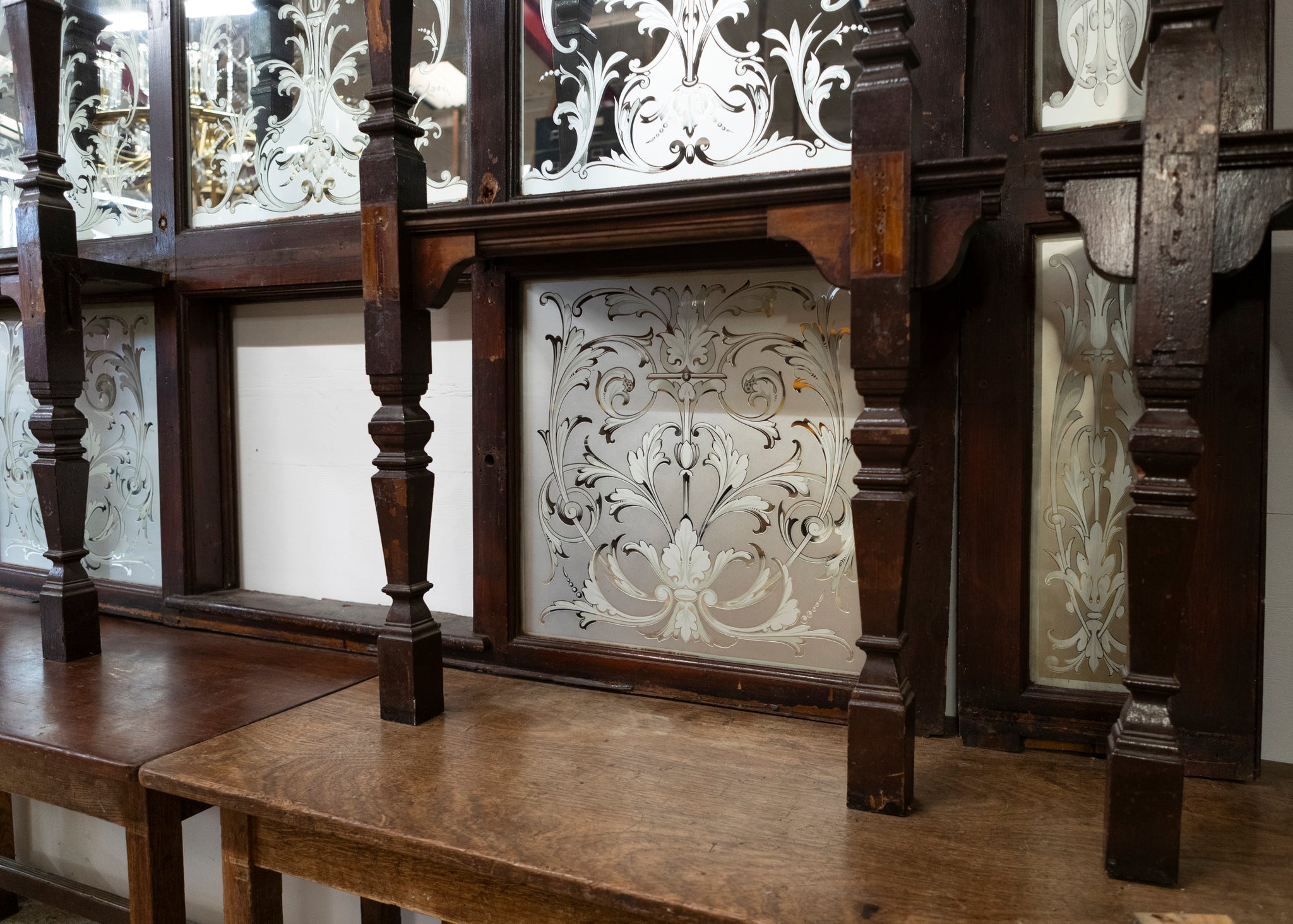A rare and original piece, this Victorian back-fitting has mirrored glass etched with intricate details.