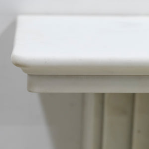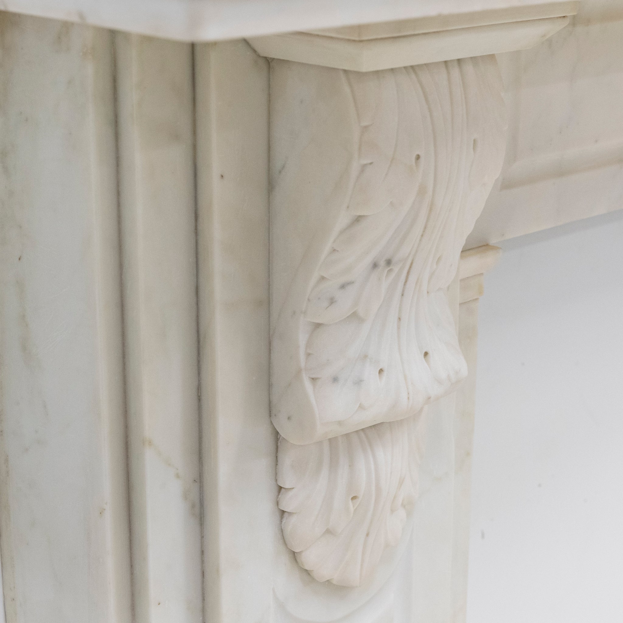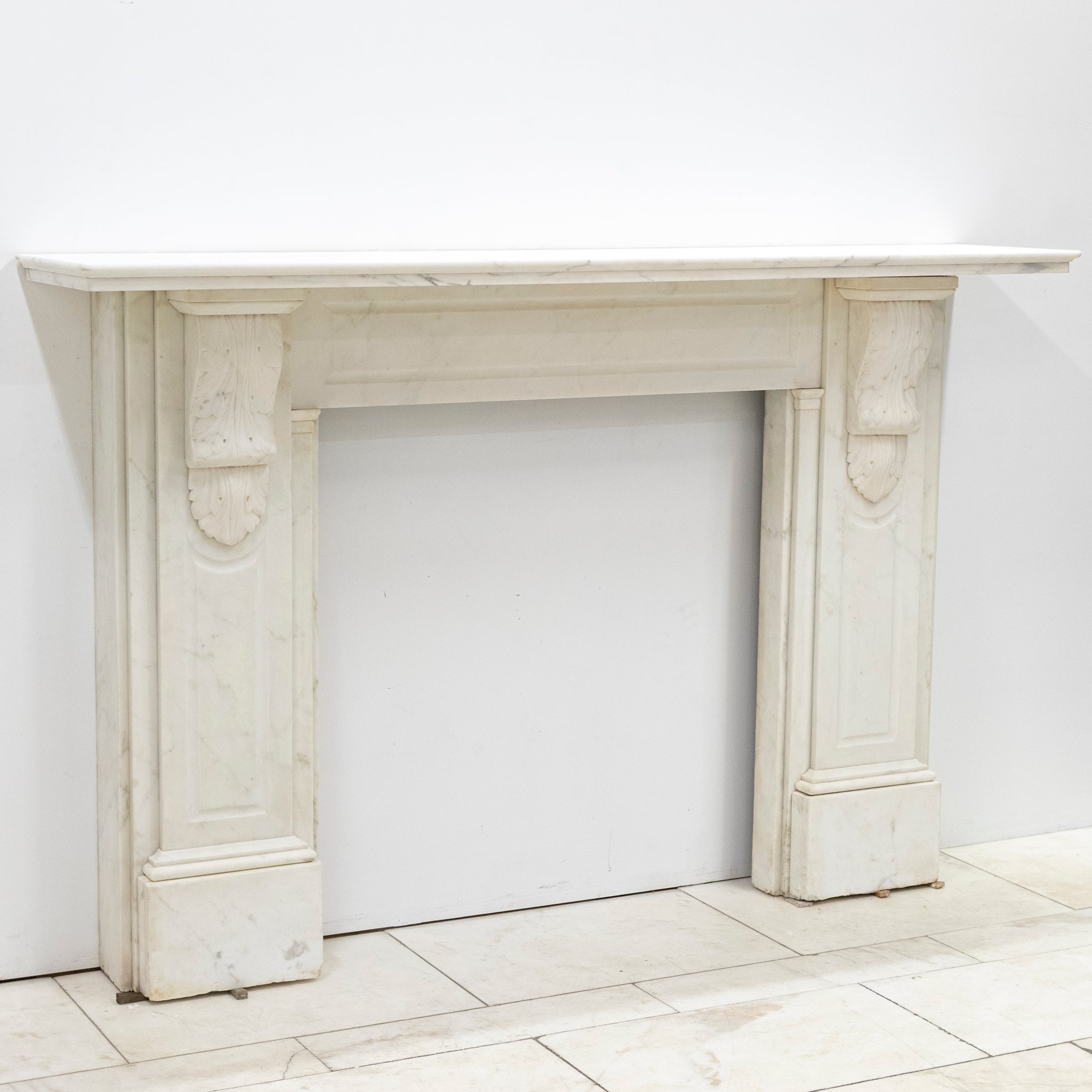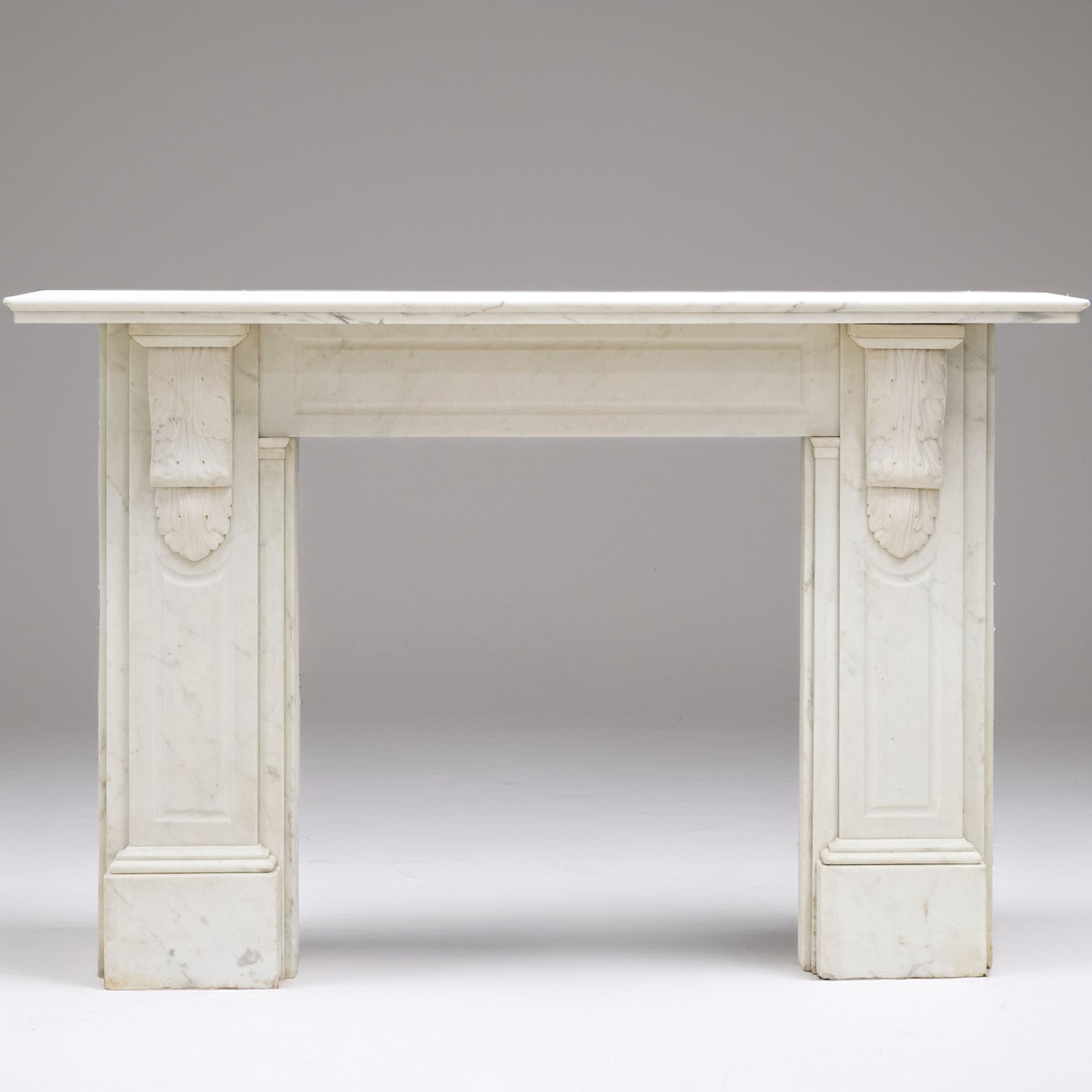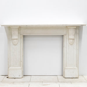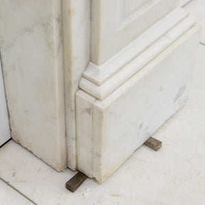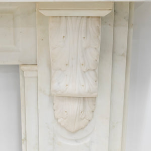 This exceptional large 19th-century Victorian fireplace surround is masterfully carved in Statuary marble, embodying the refinement and craftsmanship of the era. The mantel features ornate corbels. The frieze and jambs and panelled details.