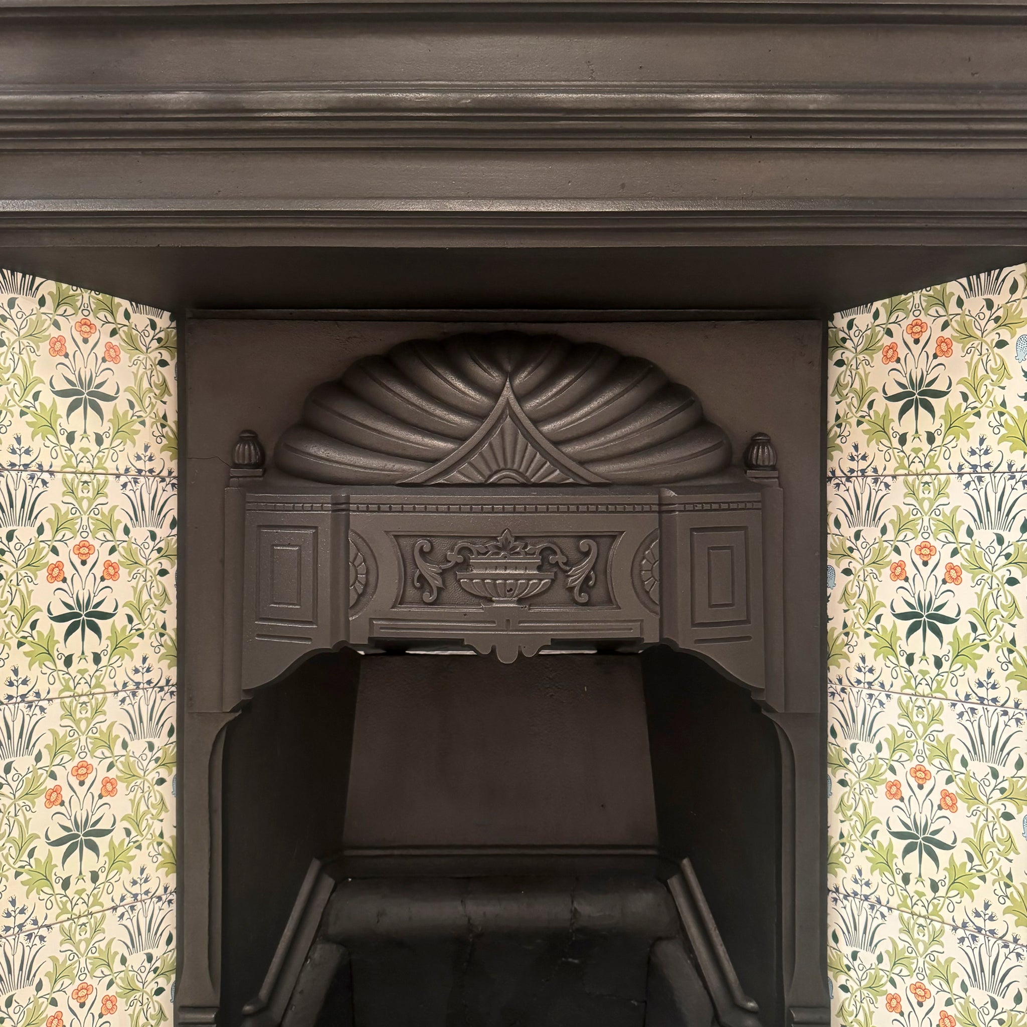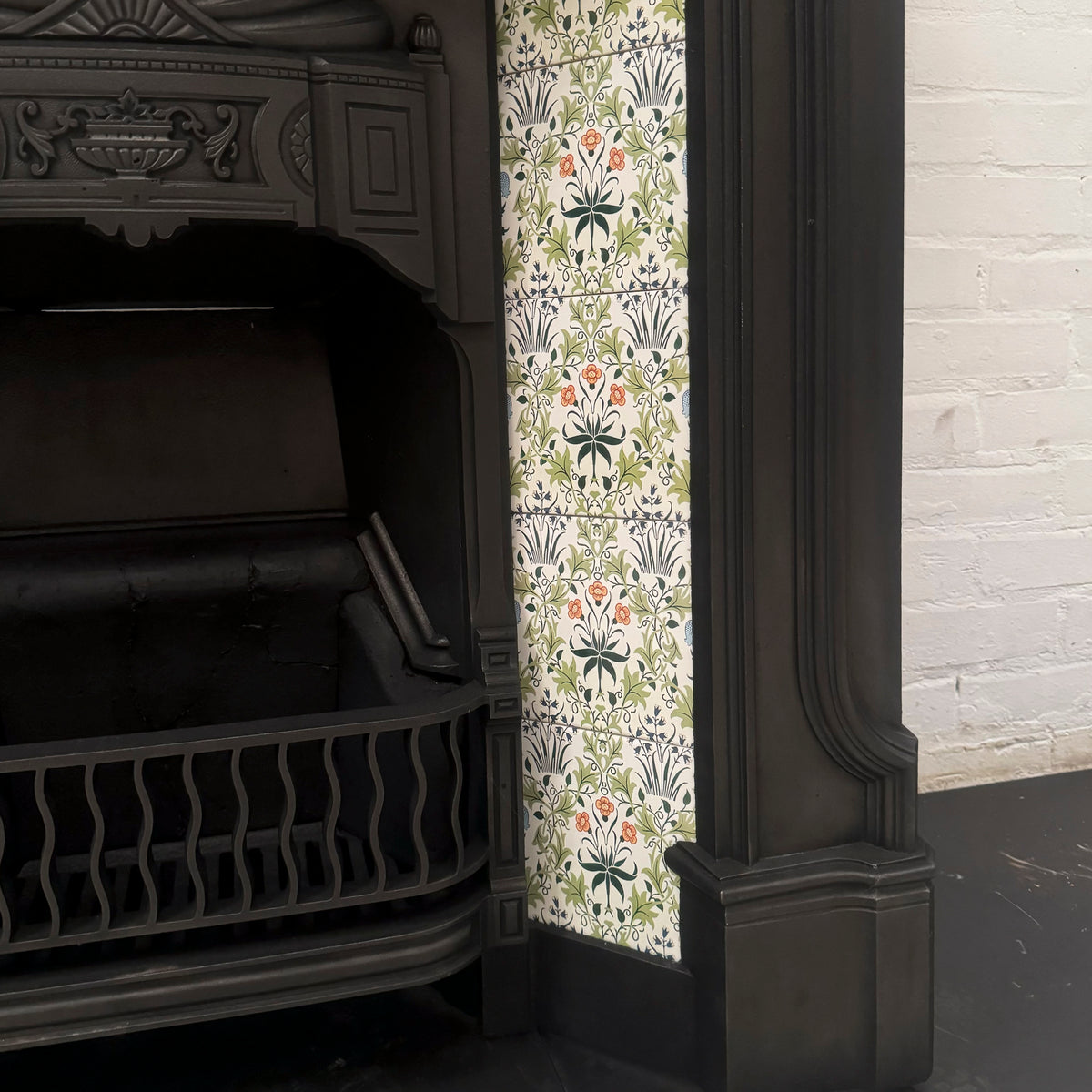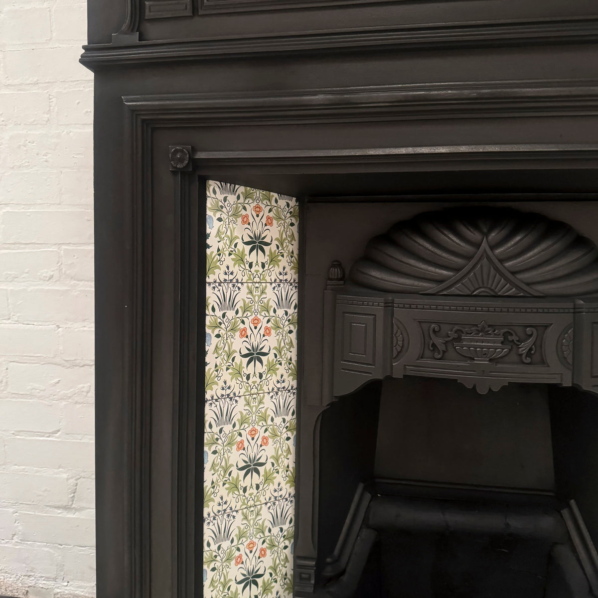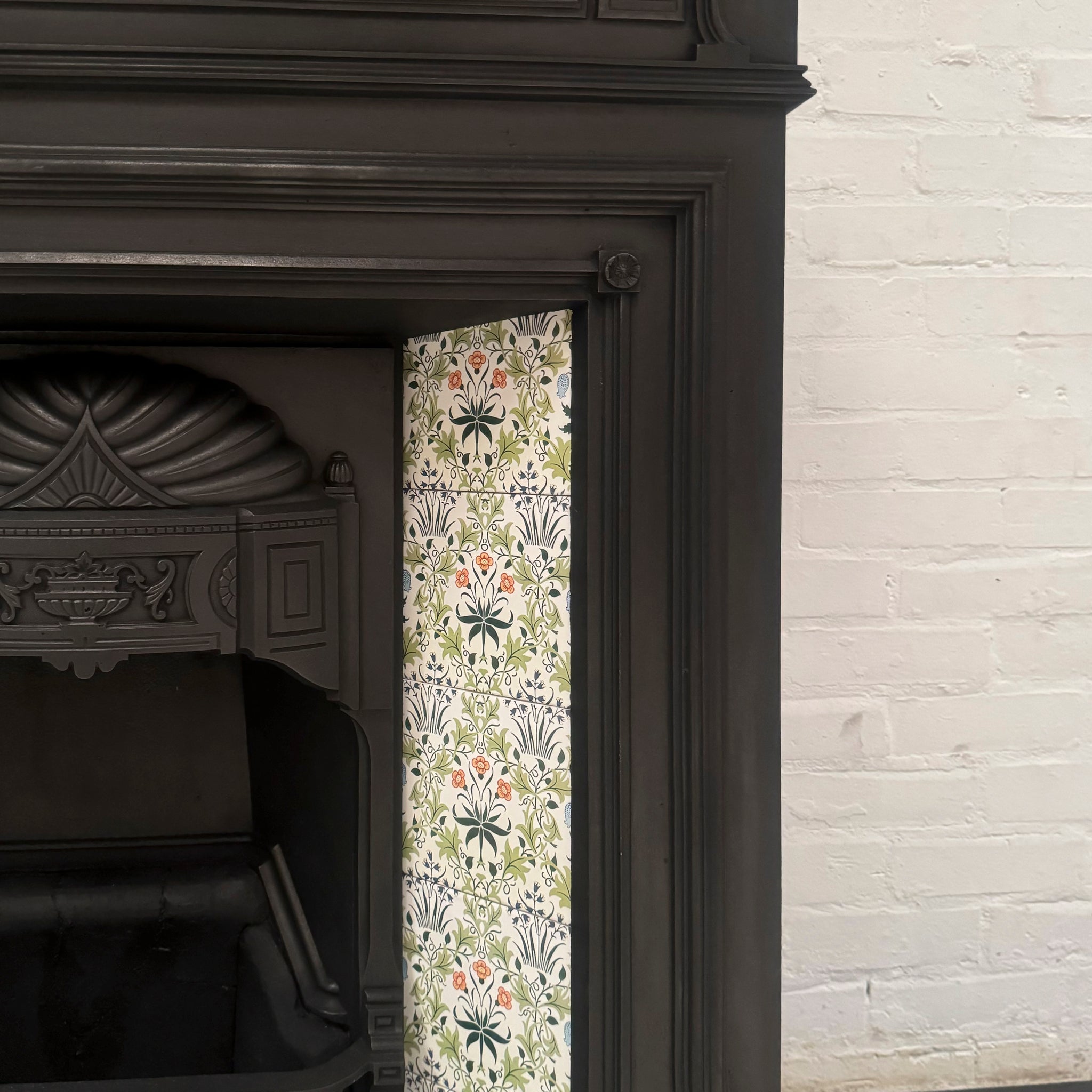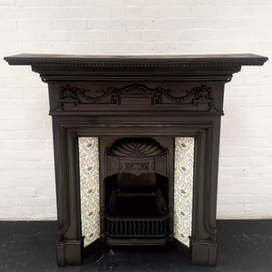 An Antique Victorian Combination Fireplace with decorative floral tiles .