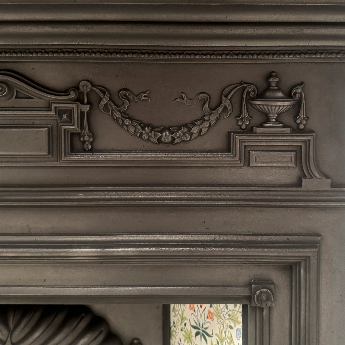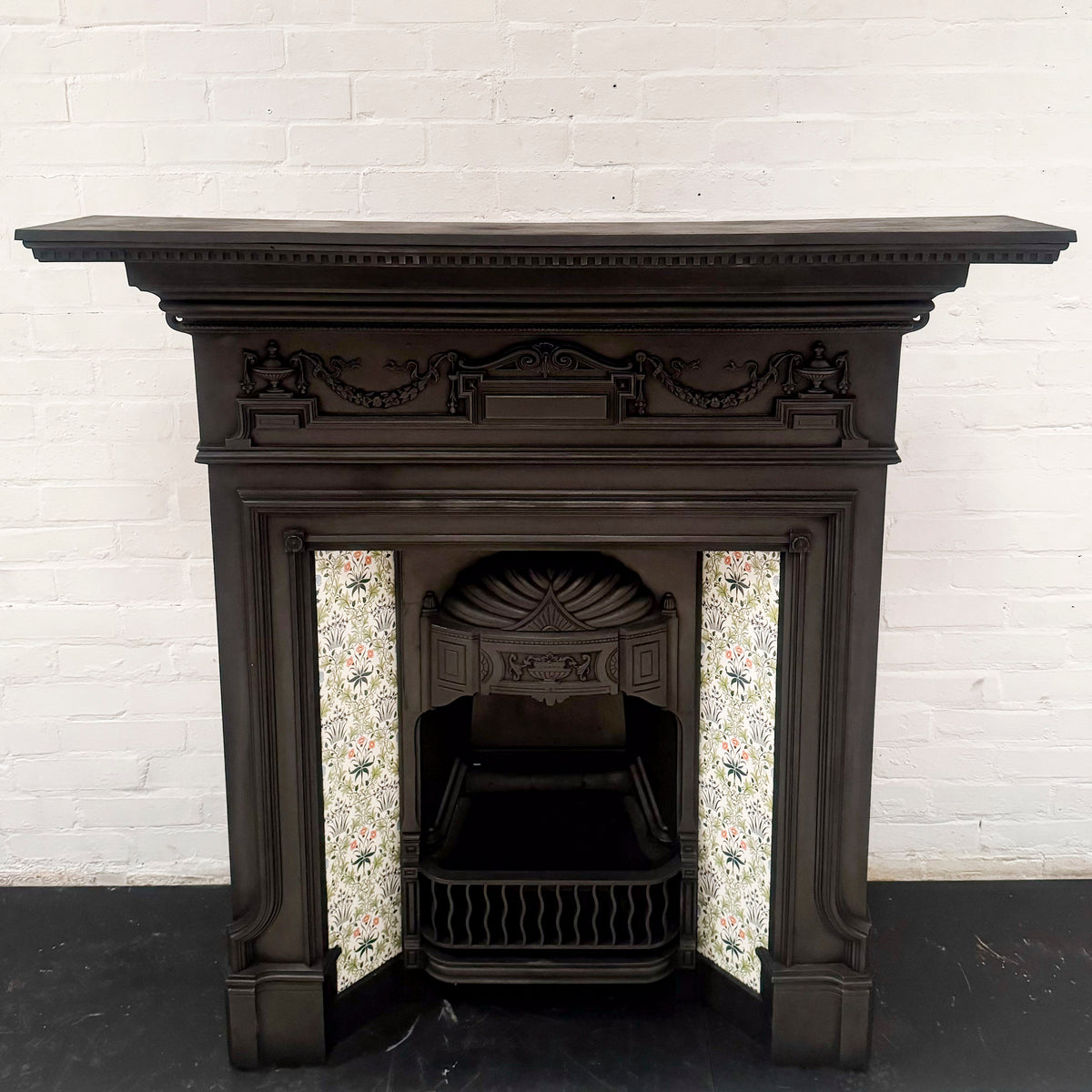 Ornate decorative motifs of swags and urns sit underneath the mantle, creating an eye-catching feature to the fireplace. The intricate details of the fire compliments the detailed colourful tiles, making this a beautiful attraction to any room.