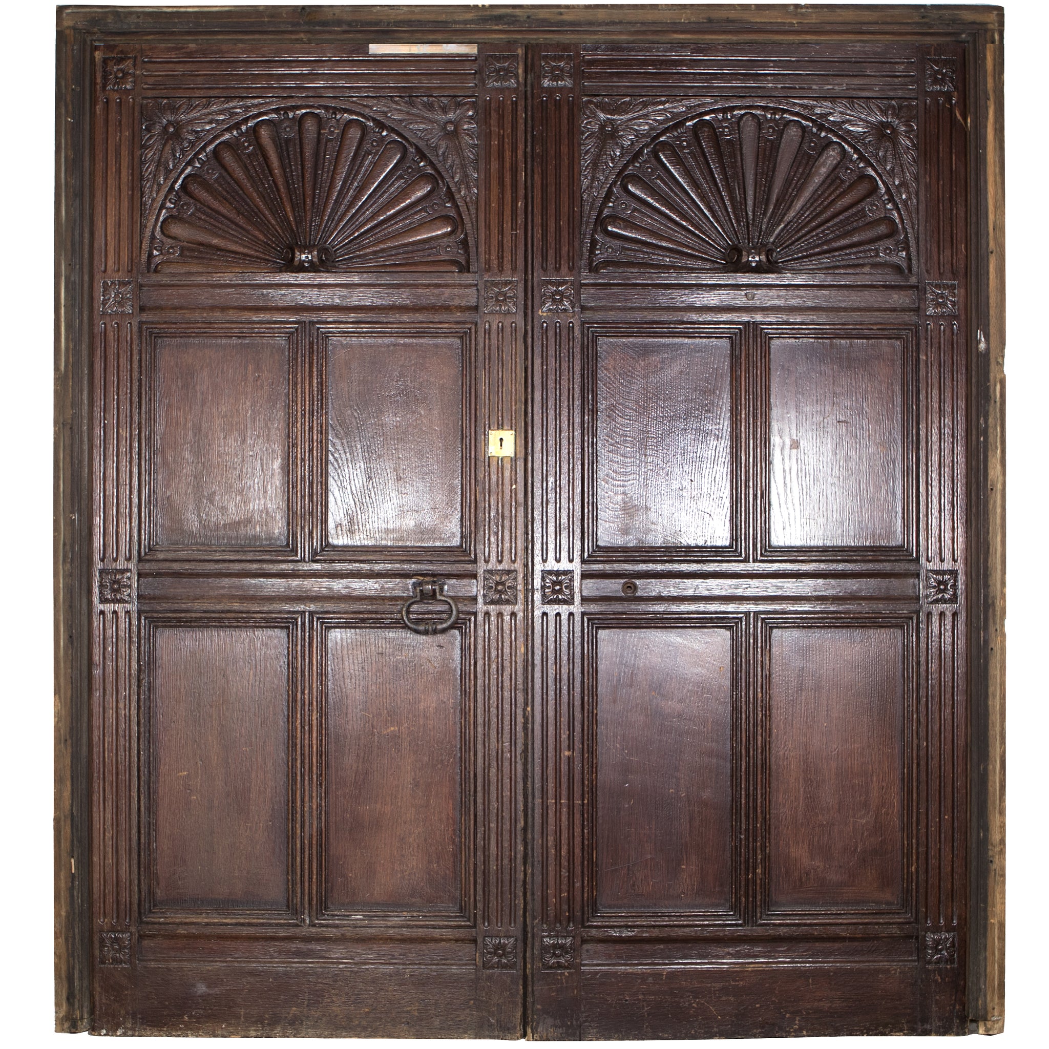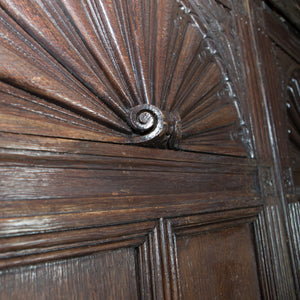 These large and impressive double doors are hand-carved from Oak in a Tudor style and were reclaimed from the foyer entrance of the world-famous King Edward VII Hospital, noted for its associated with the British Royal family.