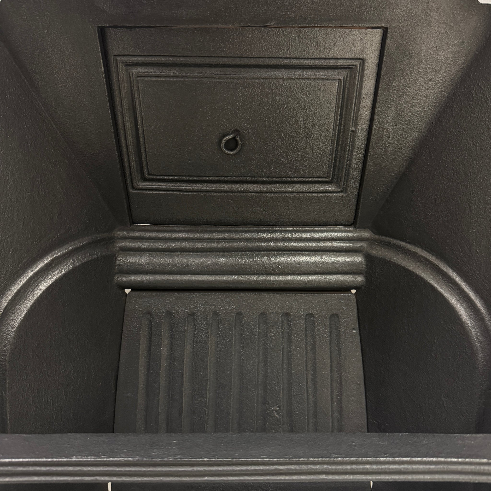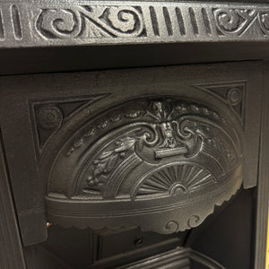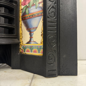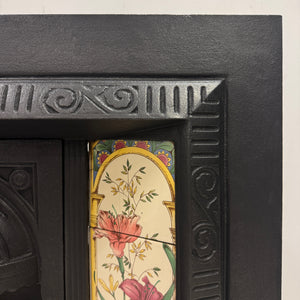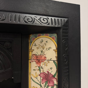 This piece showcases the exquisite craftsmanship and decorative flair of the late 19th century. From the finely detailed casting to the vivid botanical tile design in rich tones of red, yellow, and green. Fully refurbished and finished in a traditional black polish.