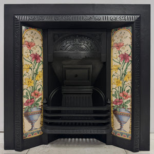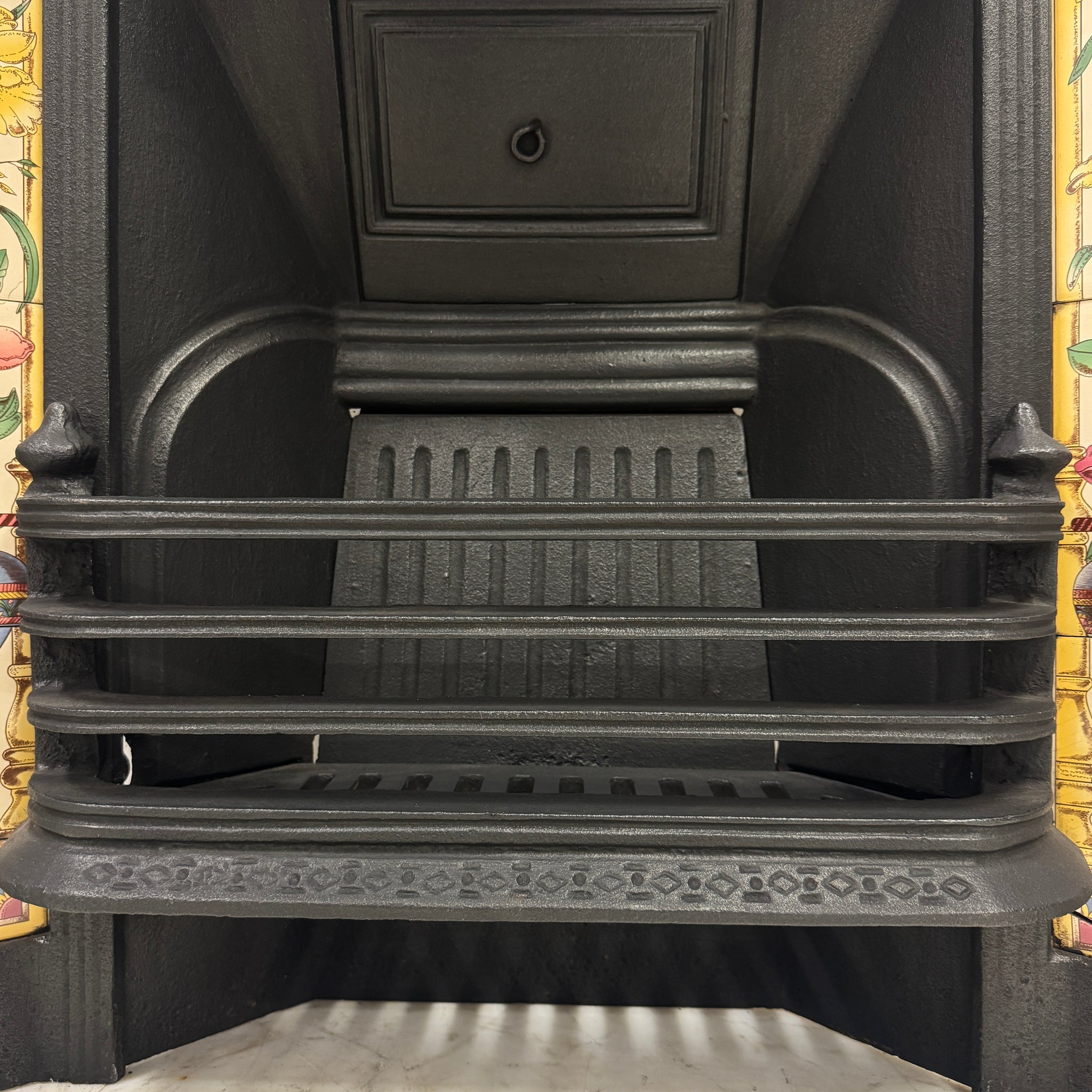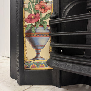 A beautifully restored Victorian cast iron fireplace insert, featuring an ornate sunburst hood and a vibrant set of original hand-painted floral tiles.