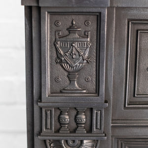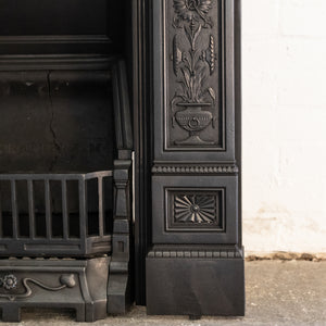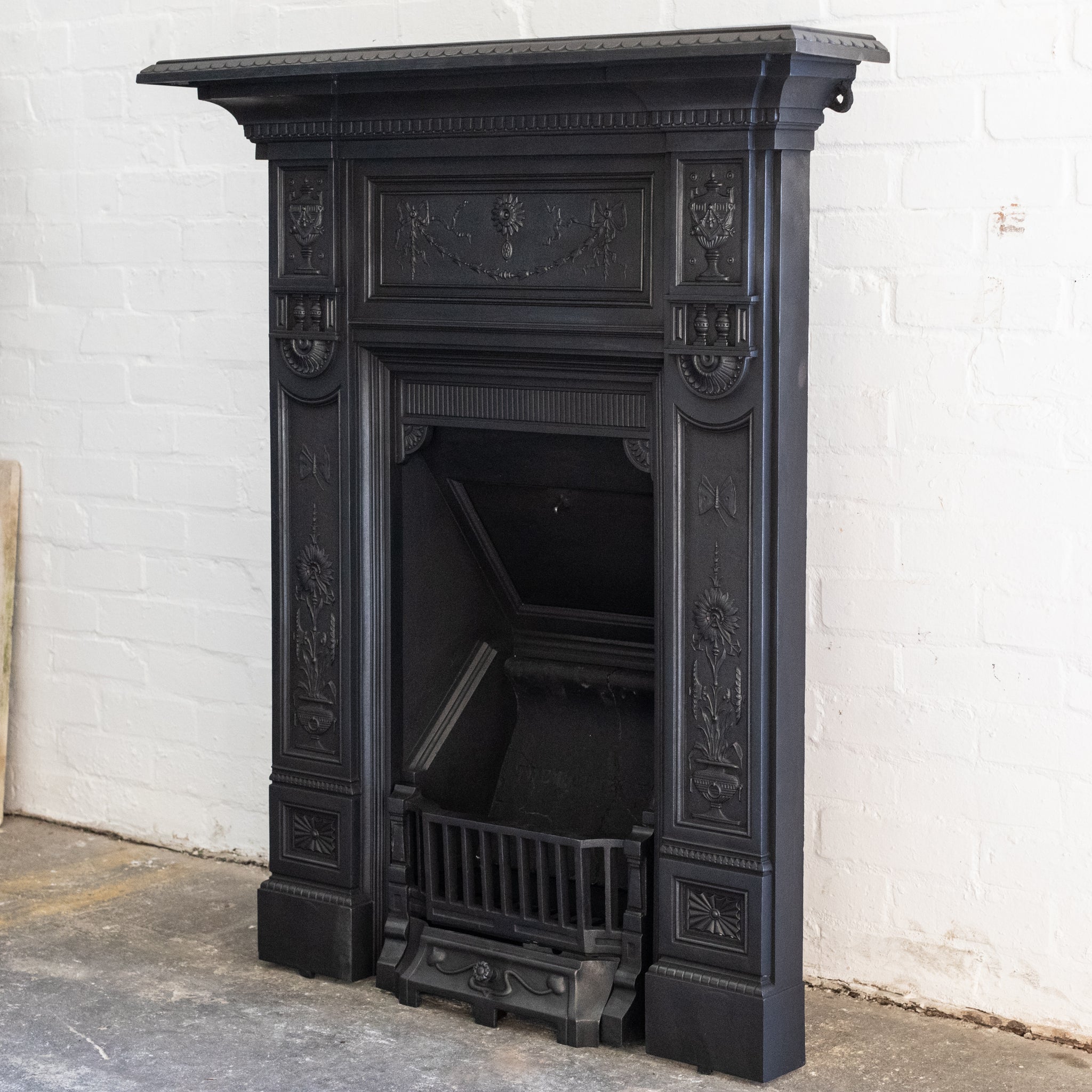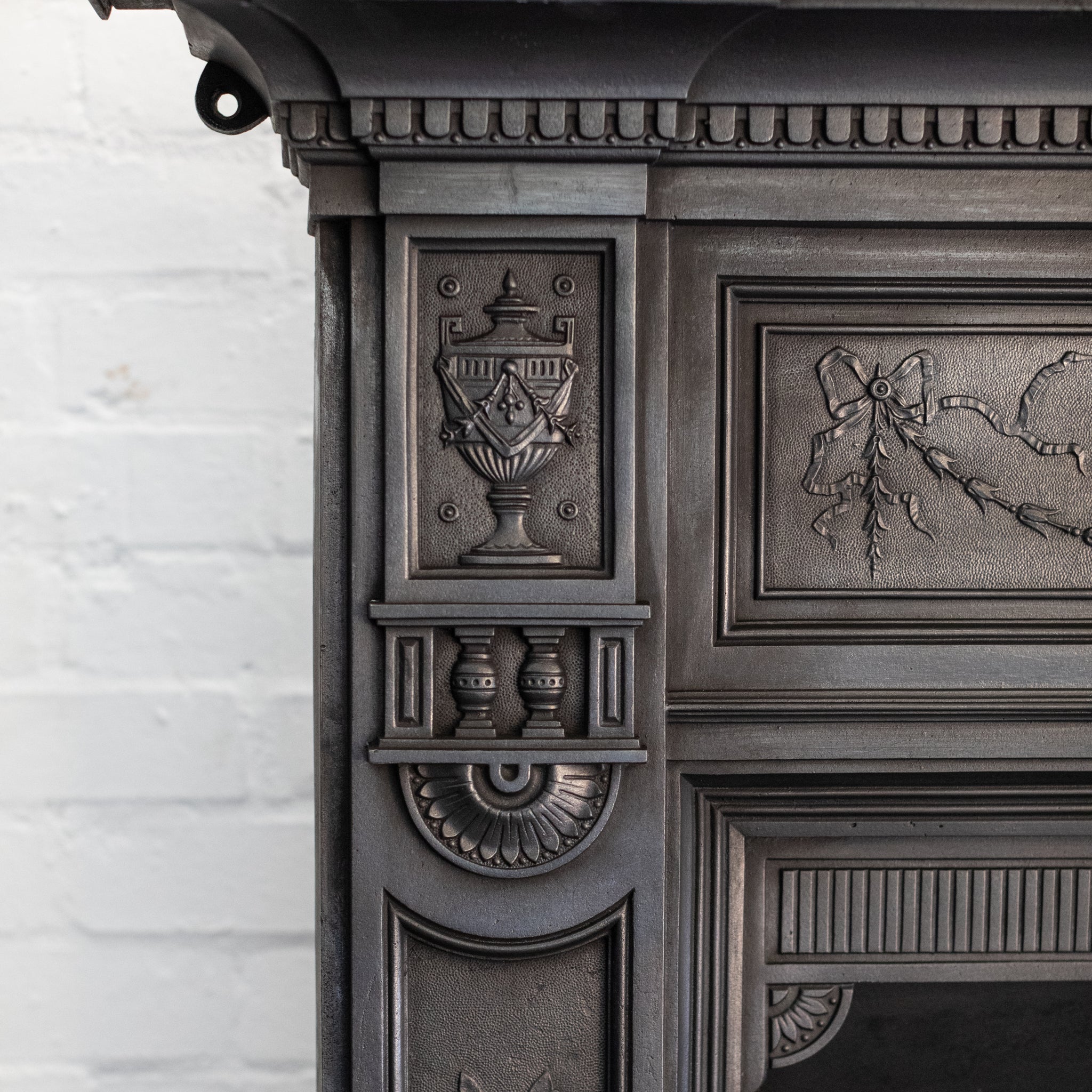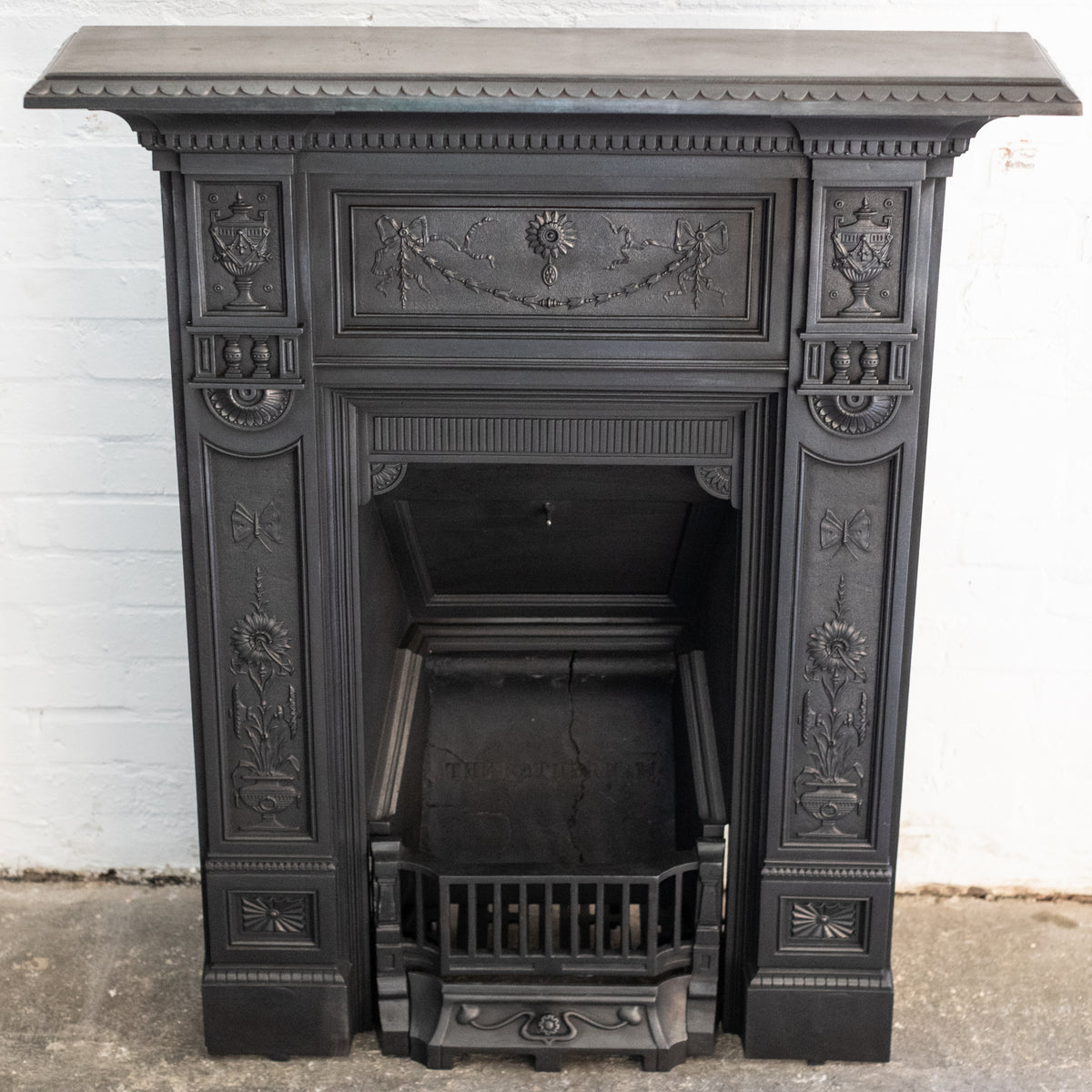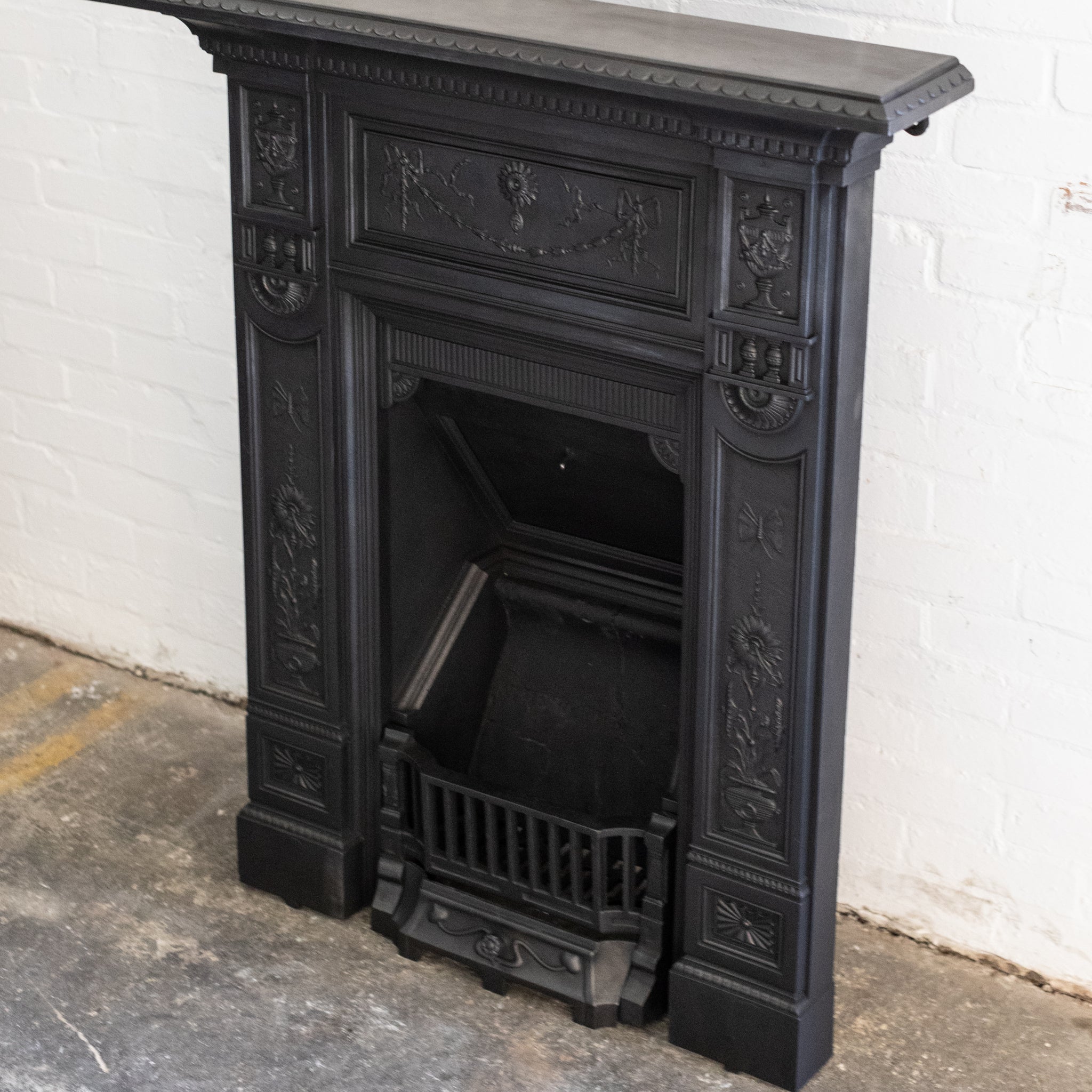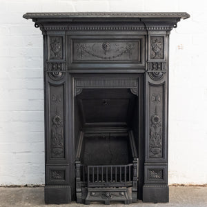 Fully restored in-house this original Cast Iron Combination Fireplace has ornate details of florals, urns, swags and bows.