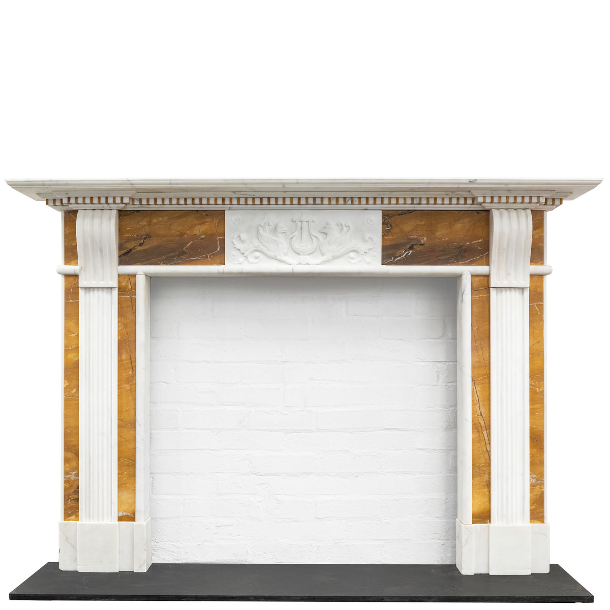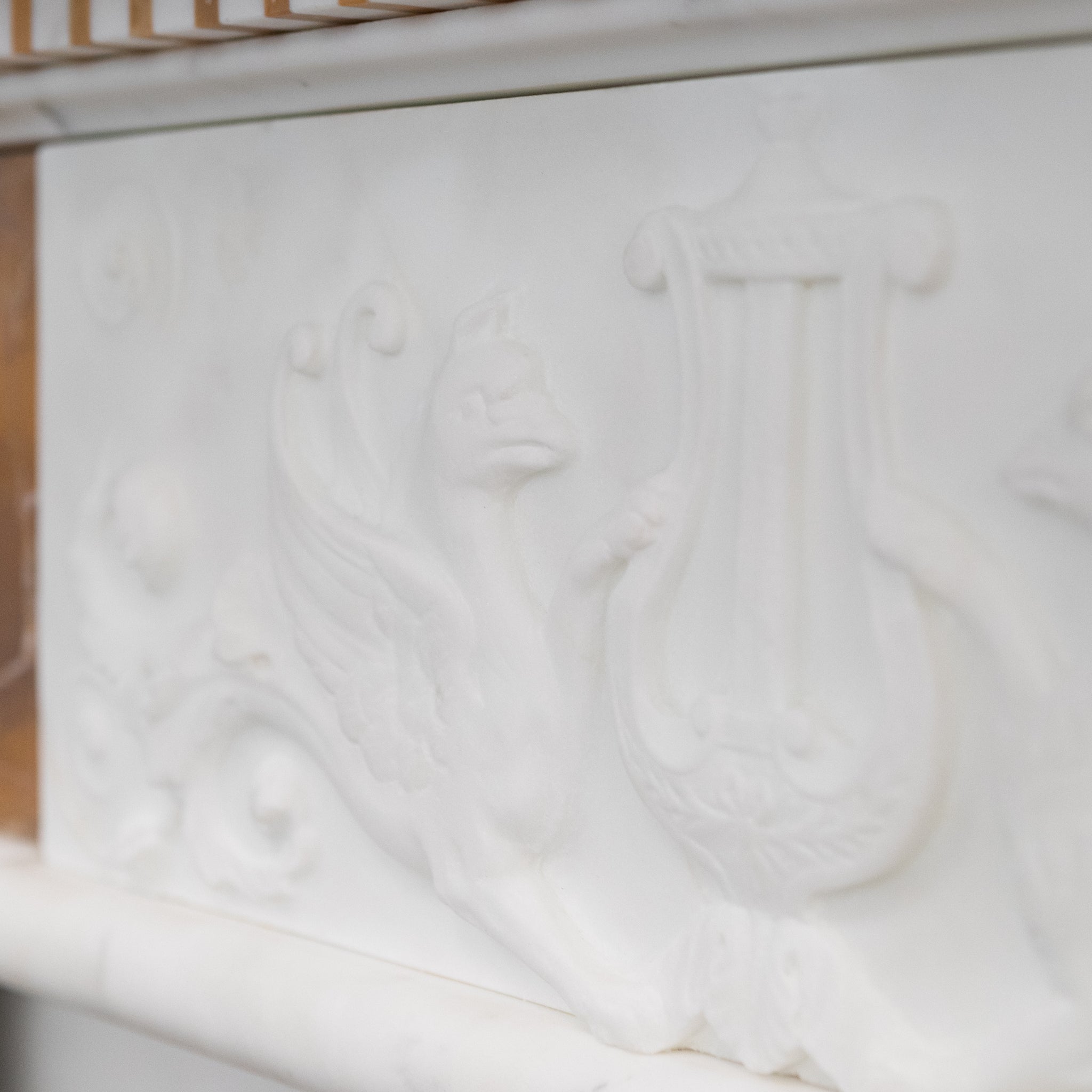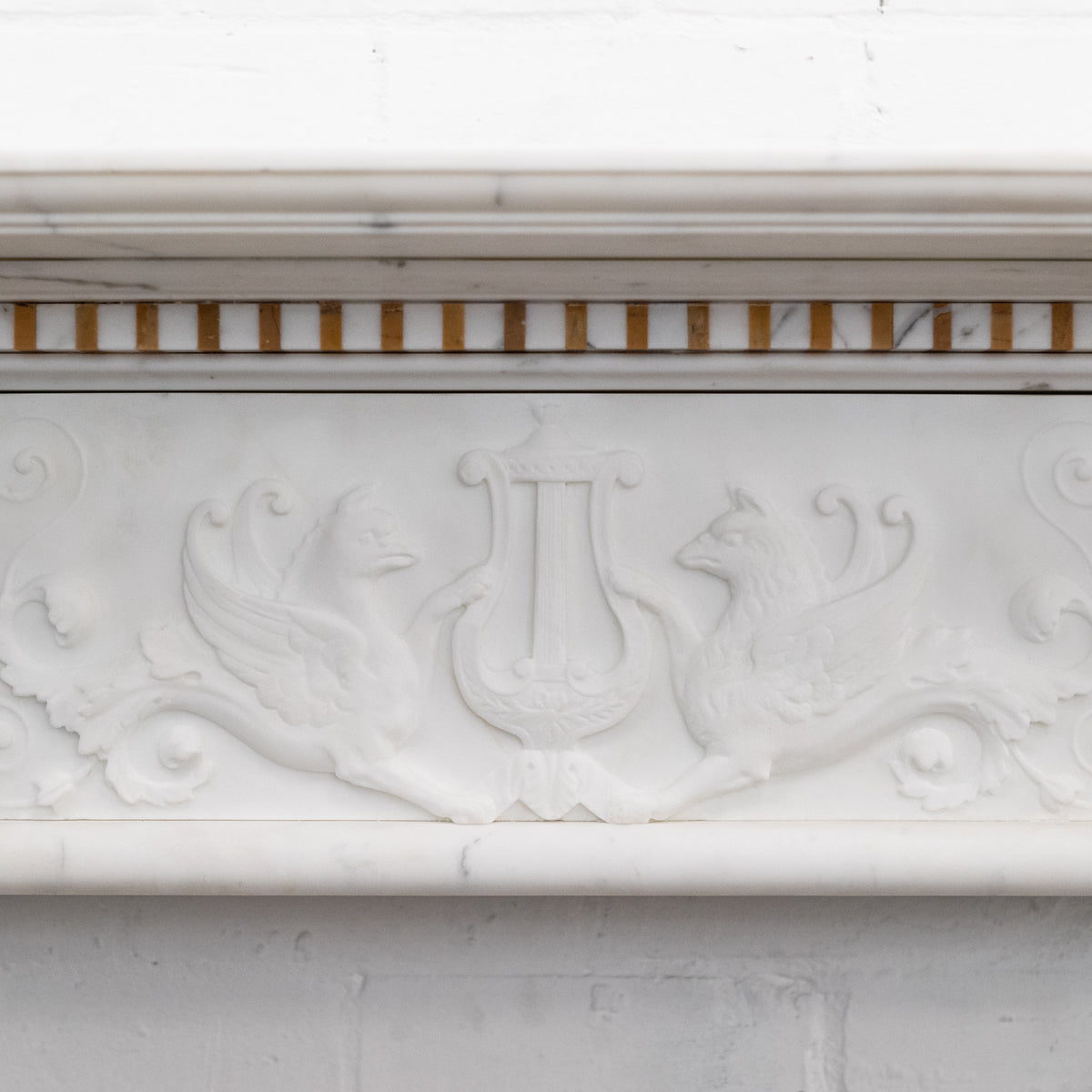 This imposing fire surround features a moulded shelf, as well as fluted columns running down the jambs. The columns are surmounted by subtle fluted corbel supports, whilst the lintel features a central carved frieze that depicts two griffins flanking a classical lute instrument. There is a particularly attractive dentil trim of sienna and statuary marble situated just below the shelf.