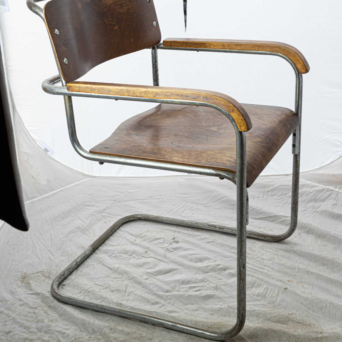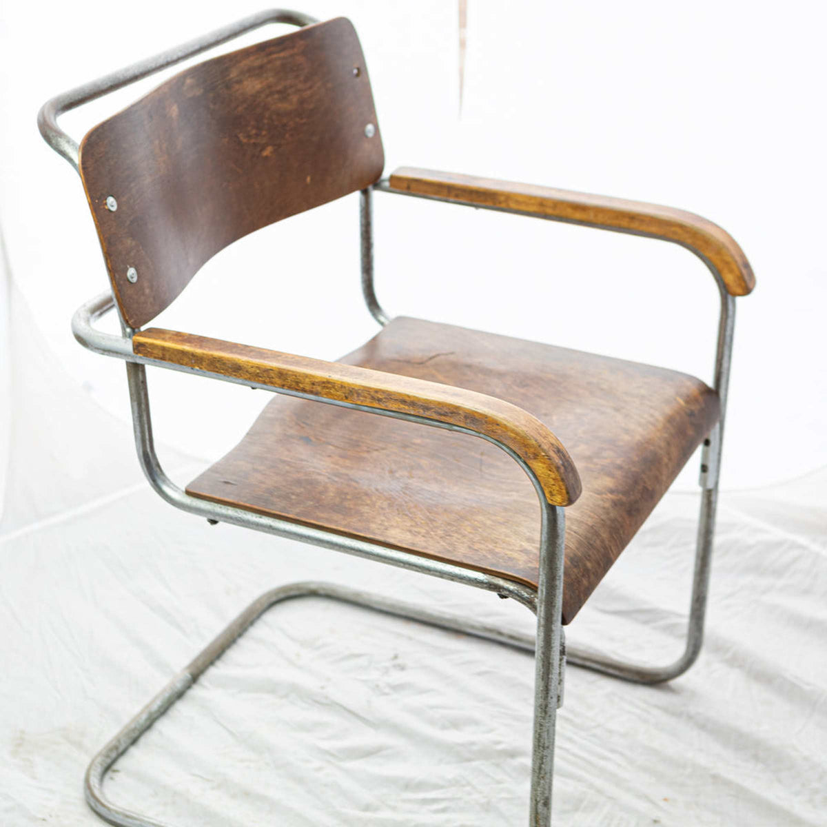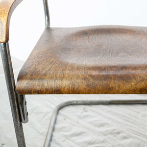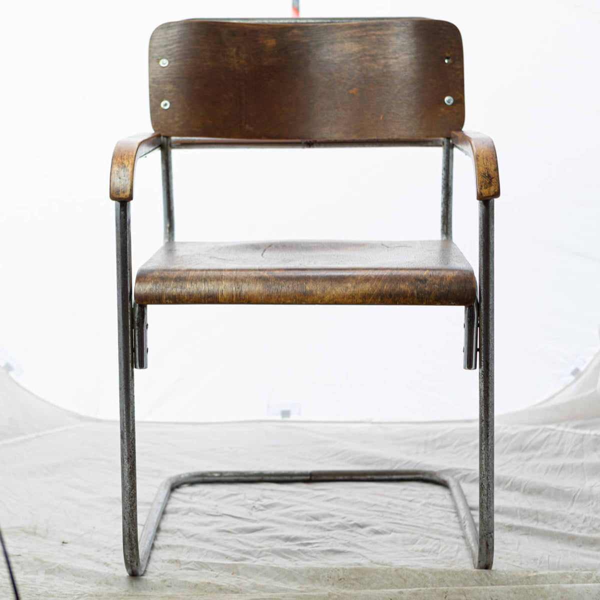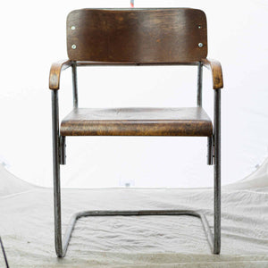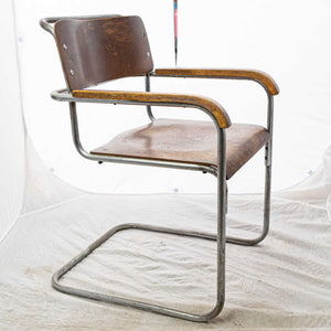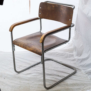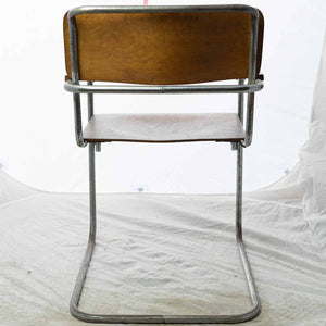 Distinctive and rare, The Bauhaus is a a magnificent chair that offers striking form and iconic style . This particularly rare design has been crafted from a bent wooden seat and chrome base, both of which own a wonderful patina.