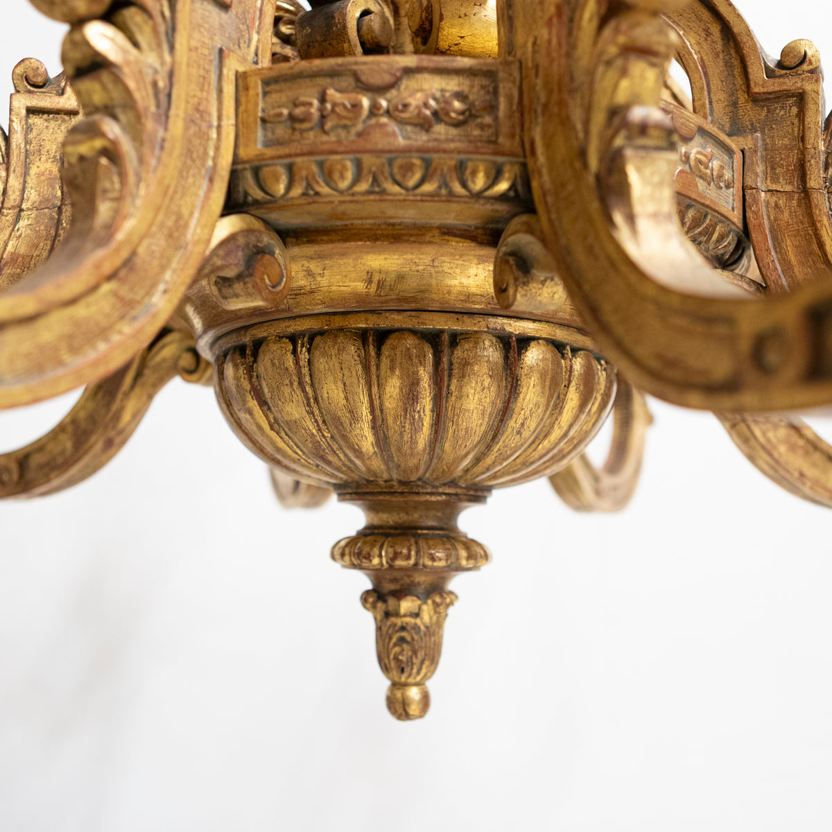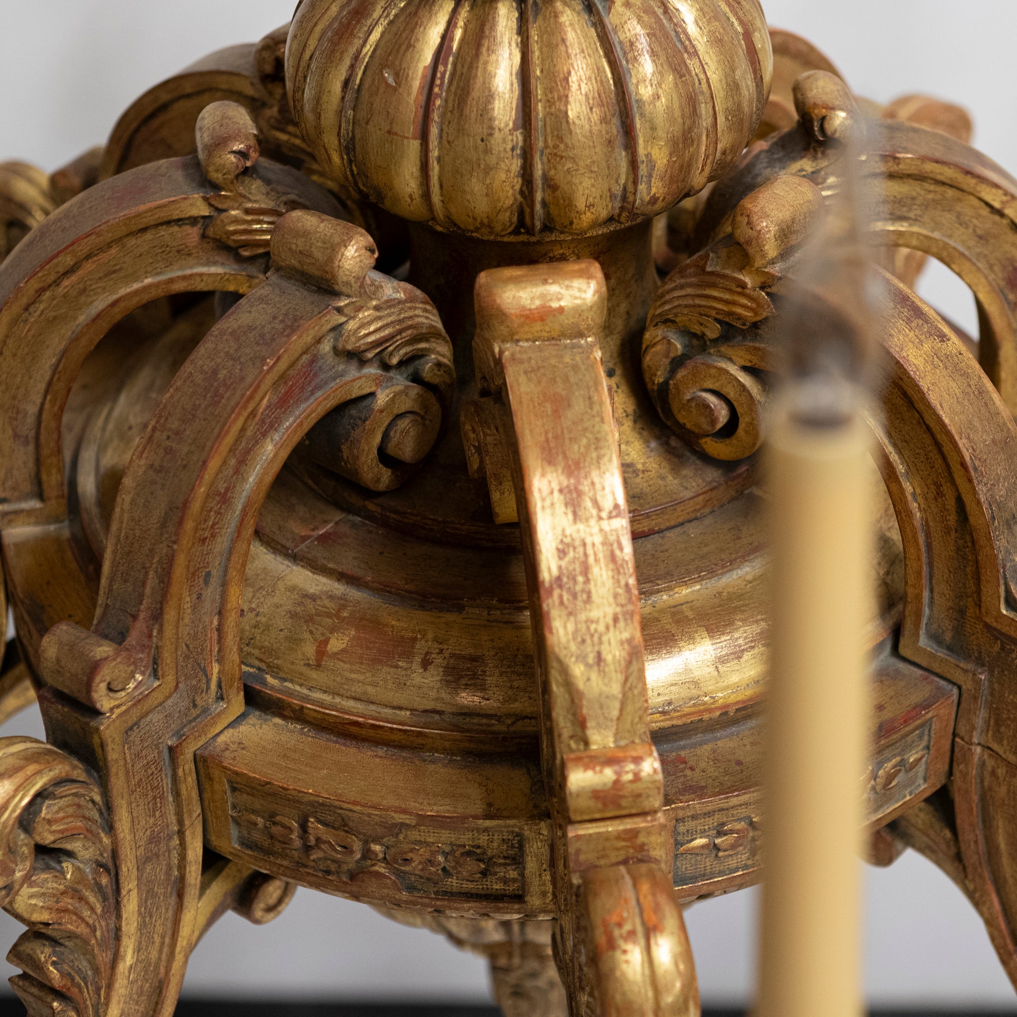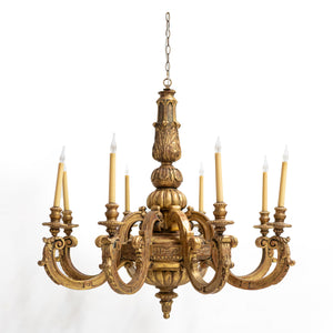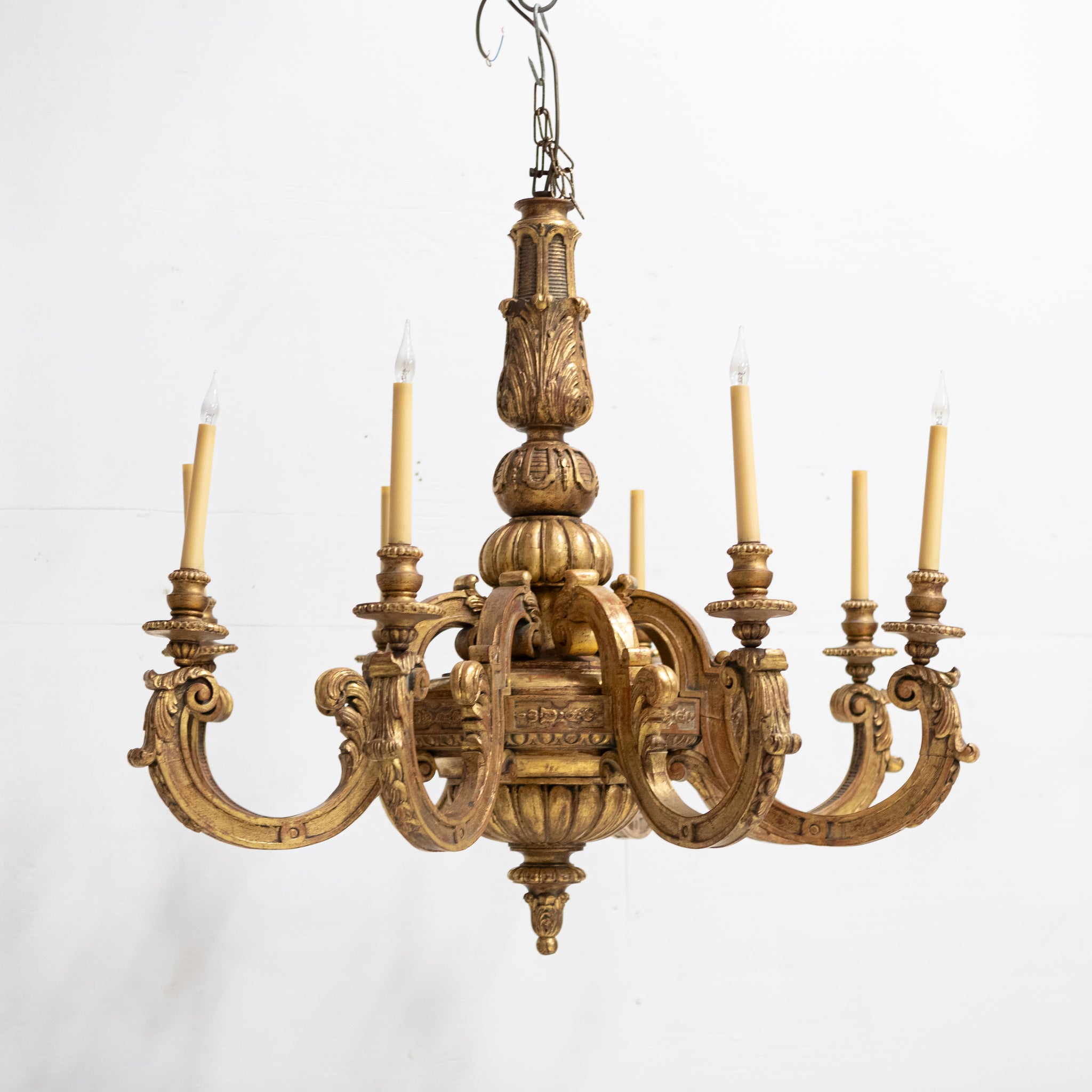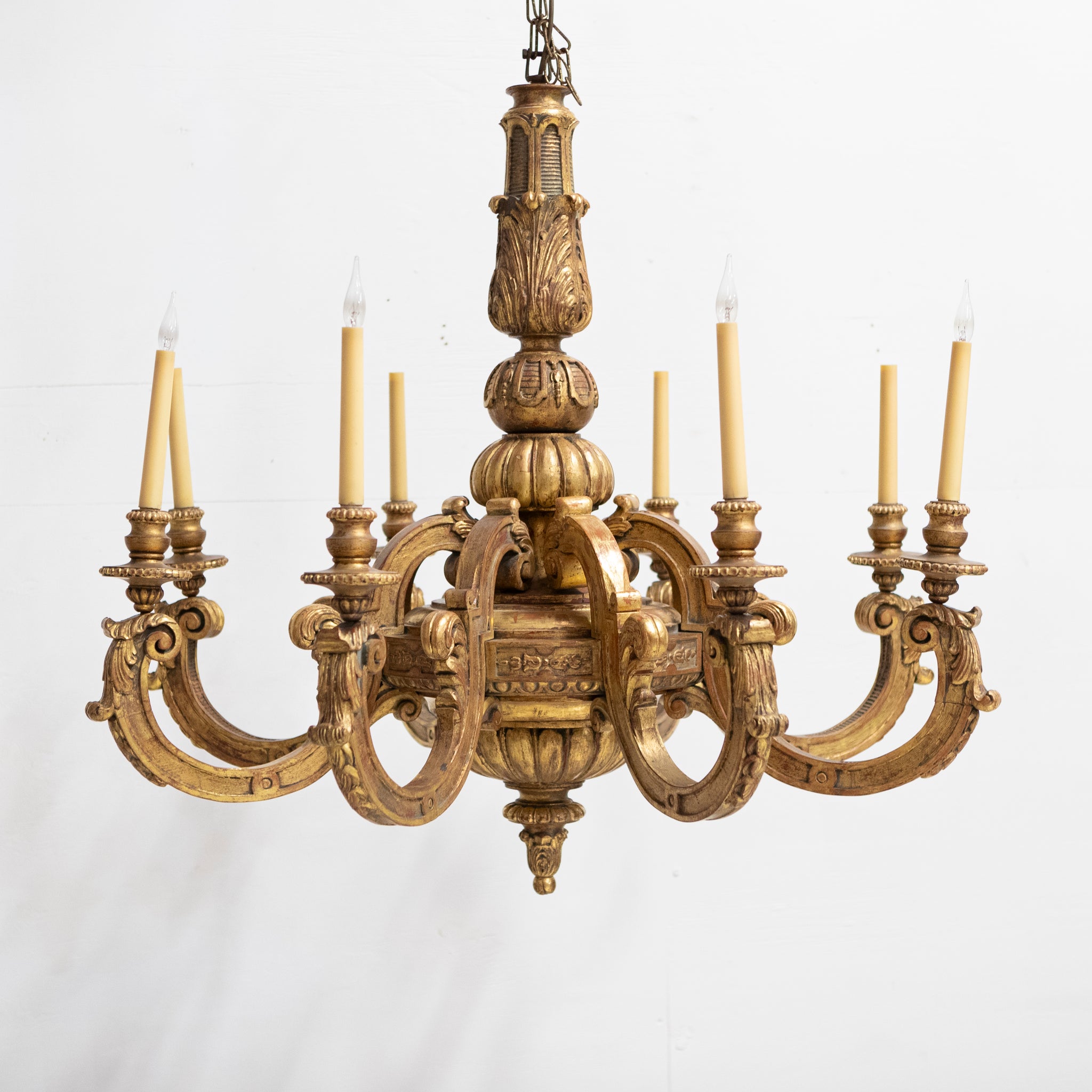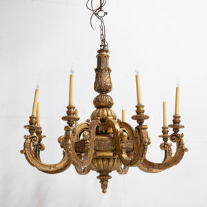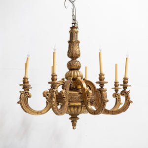 This large mid-19th-century chandelier is composed of 8 ornate giltwood S shape arms.