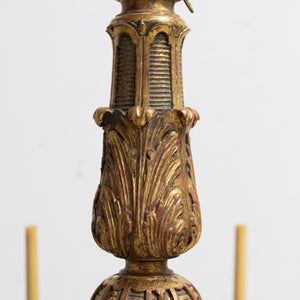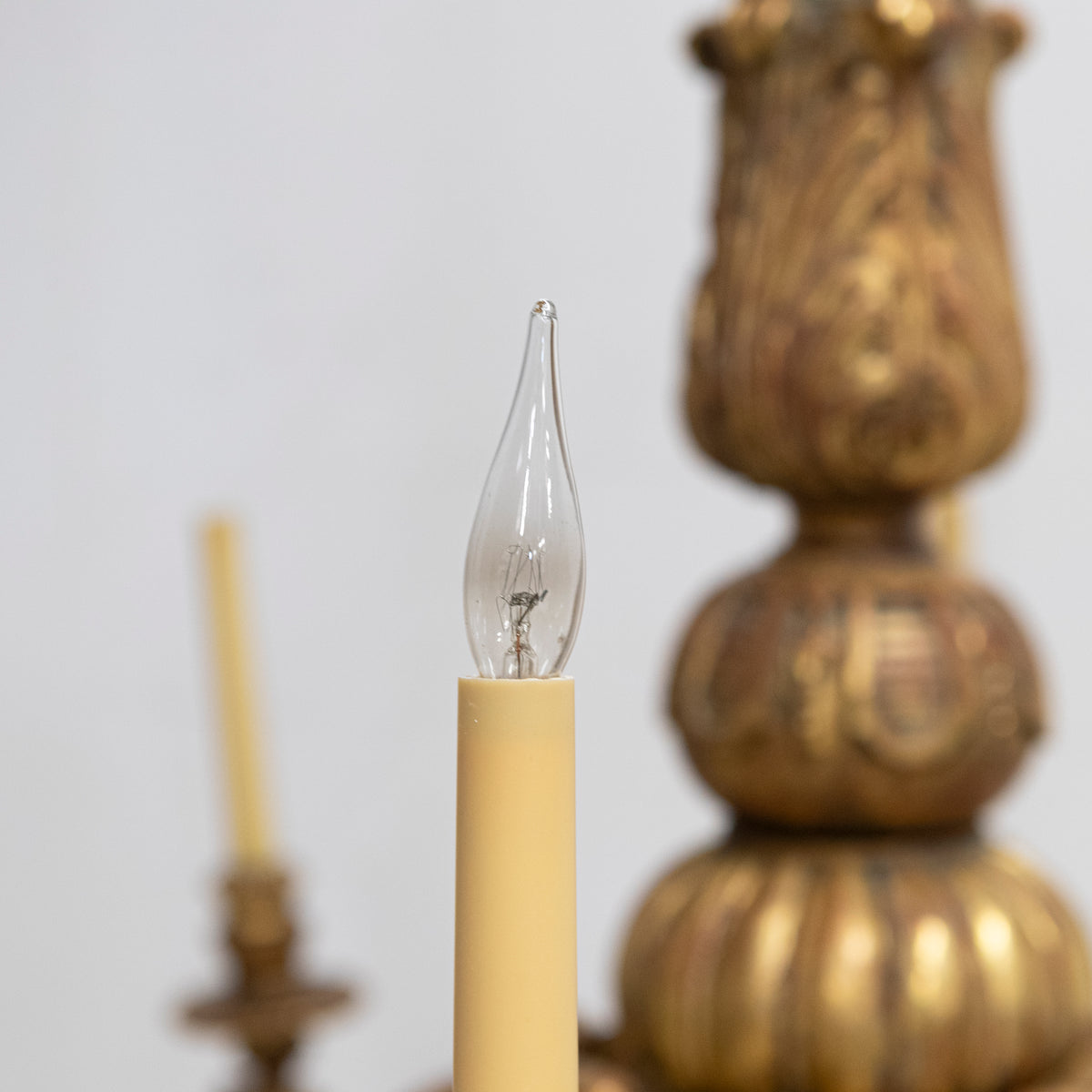 Decorative foliage adorns the scrolling arms with trumpet bobeche drip pans that support tall candles which cradle the lightbulbs. A reeded and bulbous central column with beautiful ornate base and inverted berried terminal. The chandelier has wonderful and authentic patination.