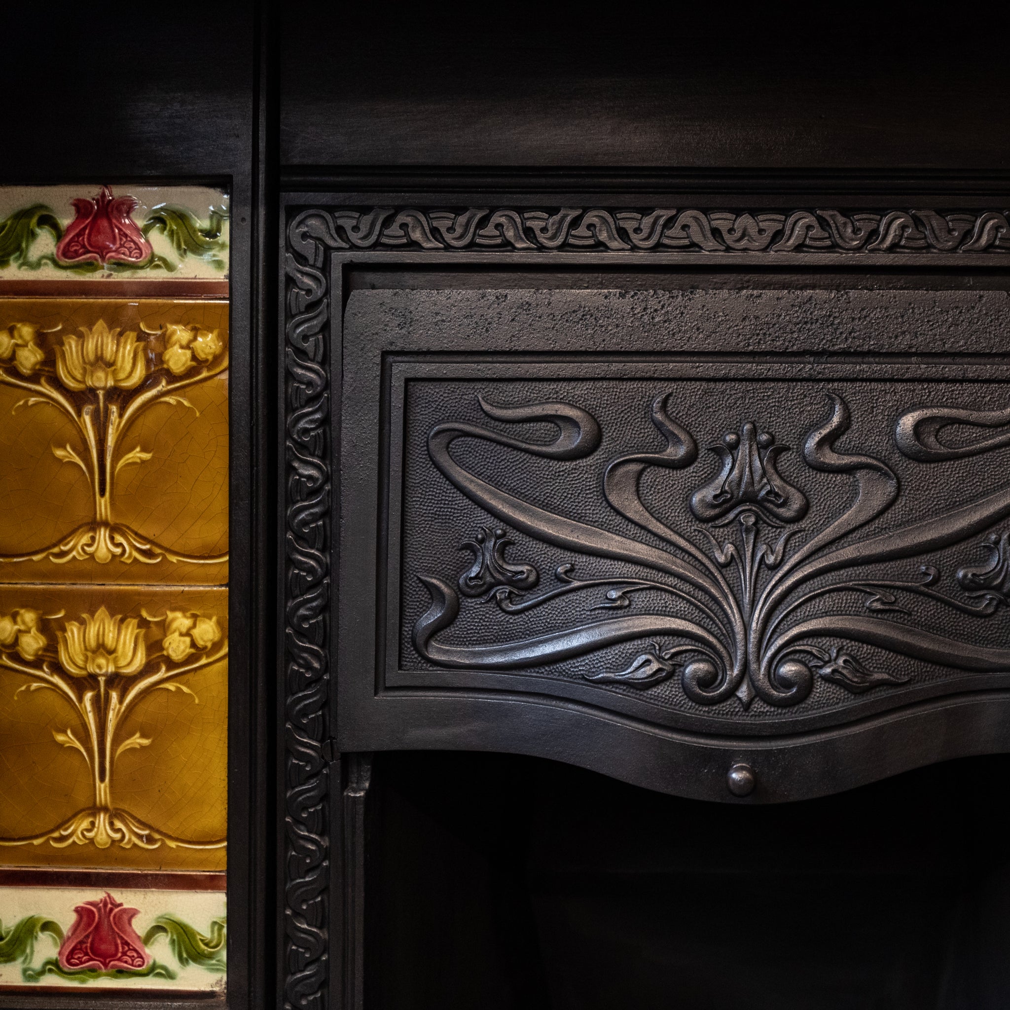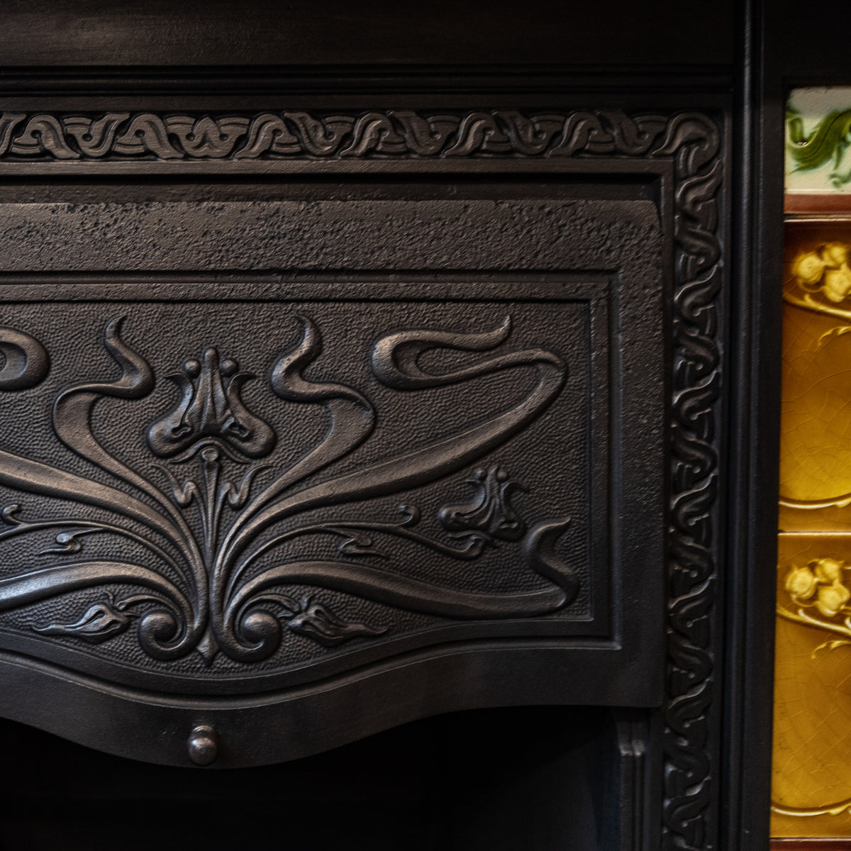 Using floral forms and motifs that the Art Nouveau movement was most famous for the large fireplace insert provides attractive borders and decorated hood.