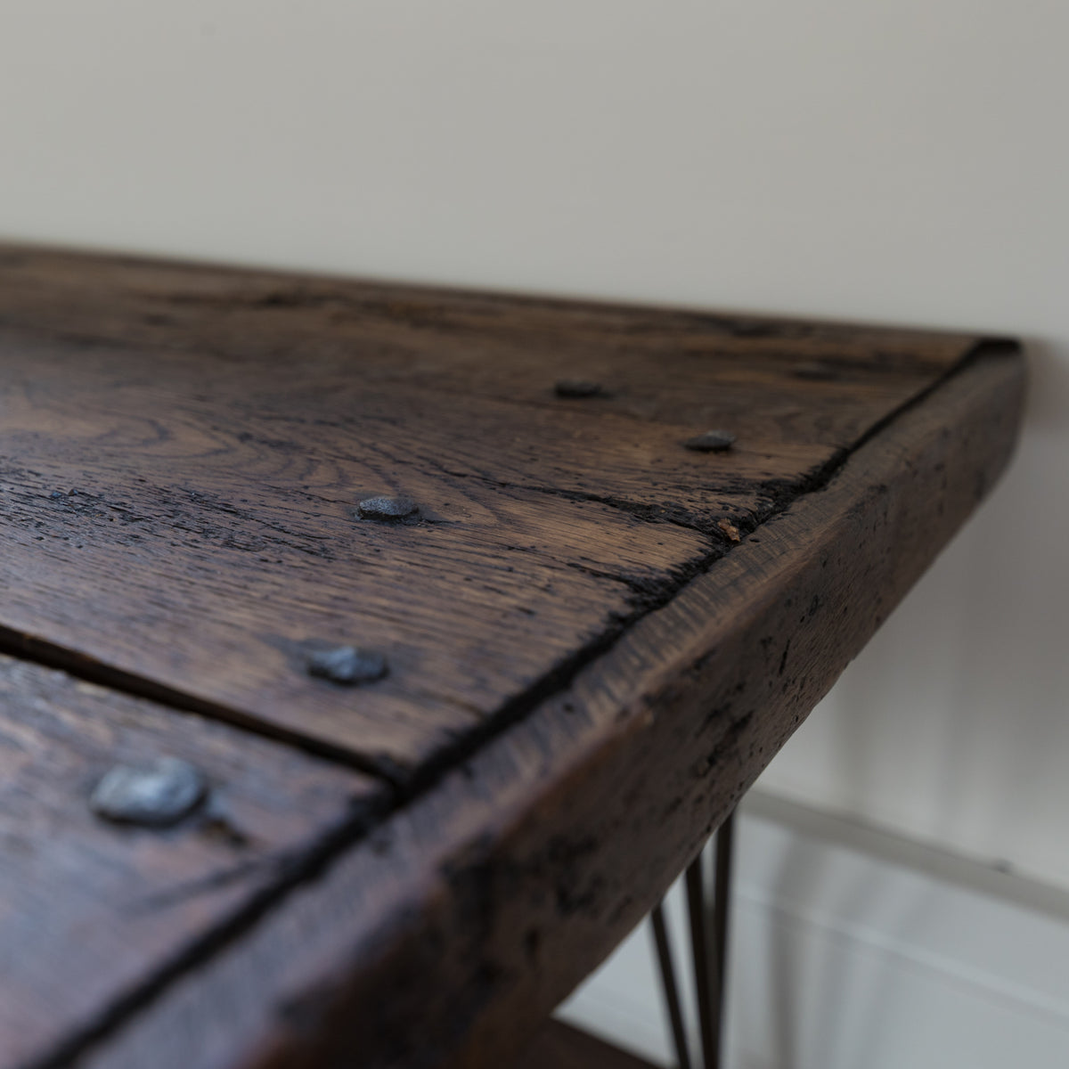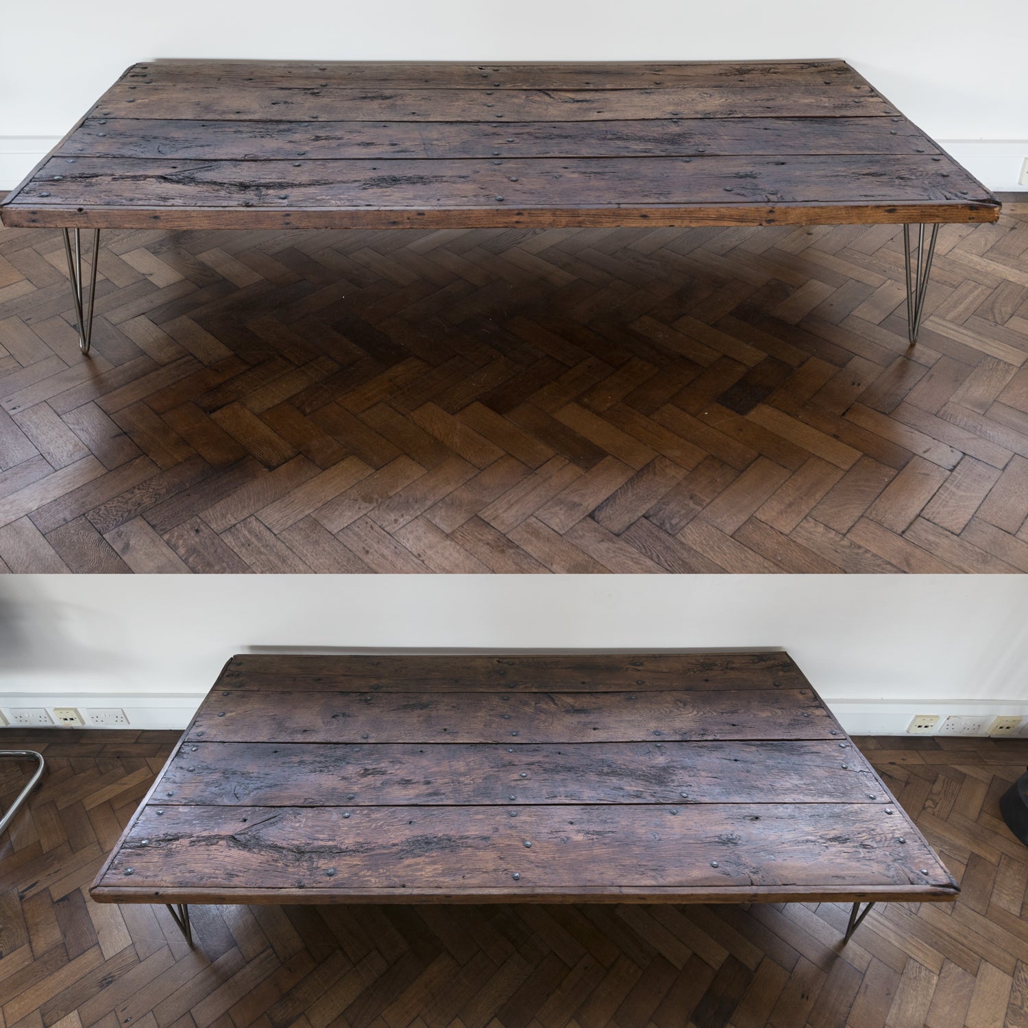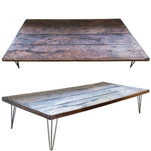 This reclaimed table is composed of from 4 antique oak planks that rest upon hairpin legs.